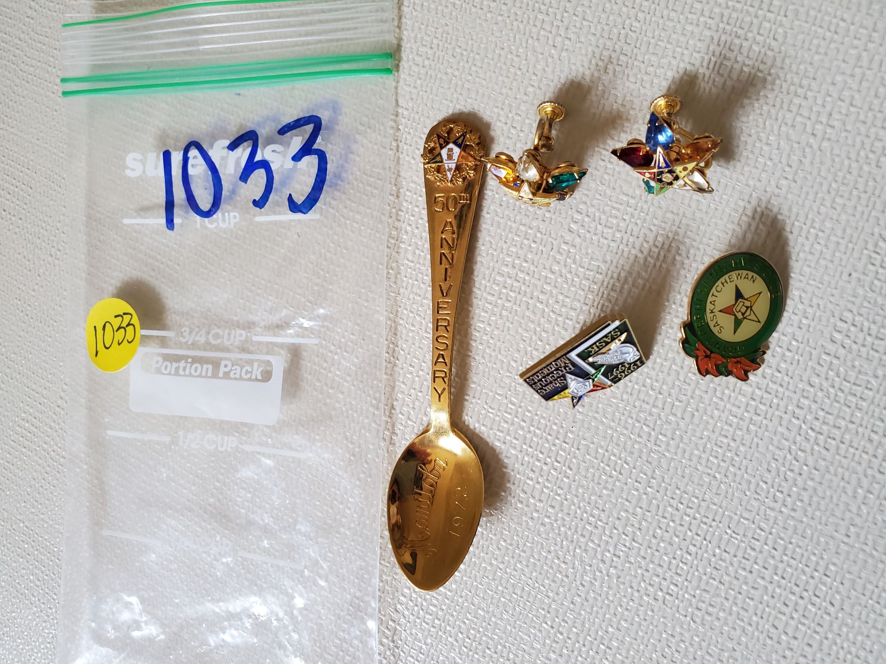 Order of the Eastern Star Collectibles - 50th Anniversary Spoon, 1 Pair of Clip On Earrings, 2 Lapel Pins