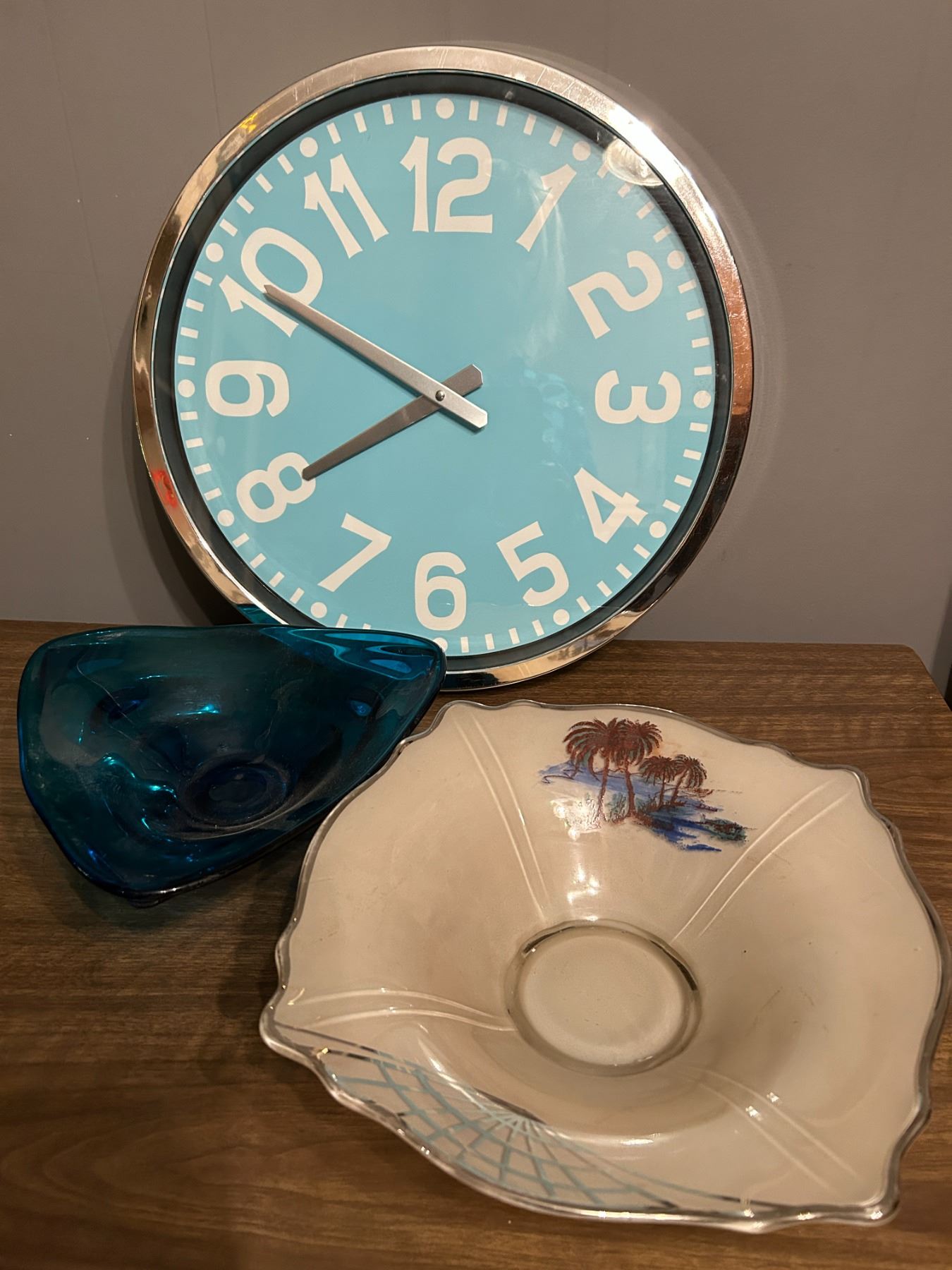 Original 50s style fruit bowl, Cobalt blue triangle glassware Oversize blue wall clock