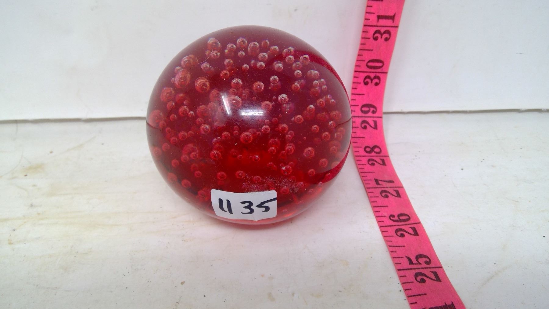 Ornamental red crystal ball full of bubbles. 3 3/4" diameter. Interesting for pondering the process of its manufacture.