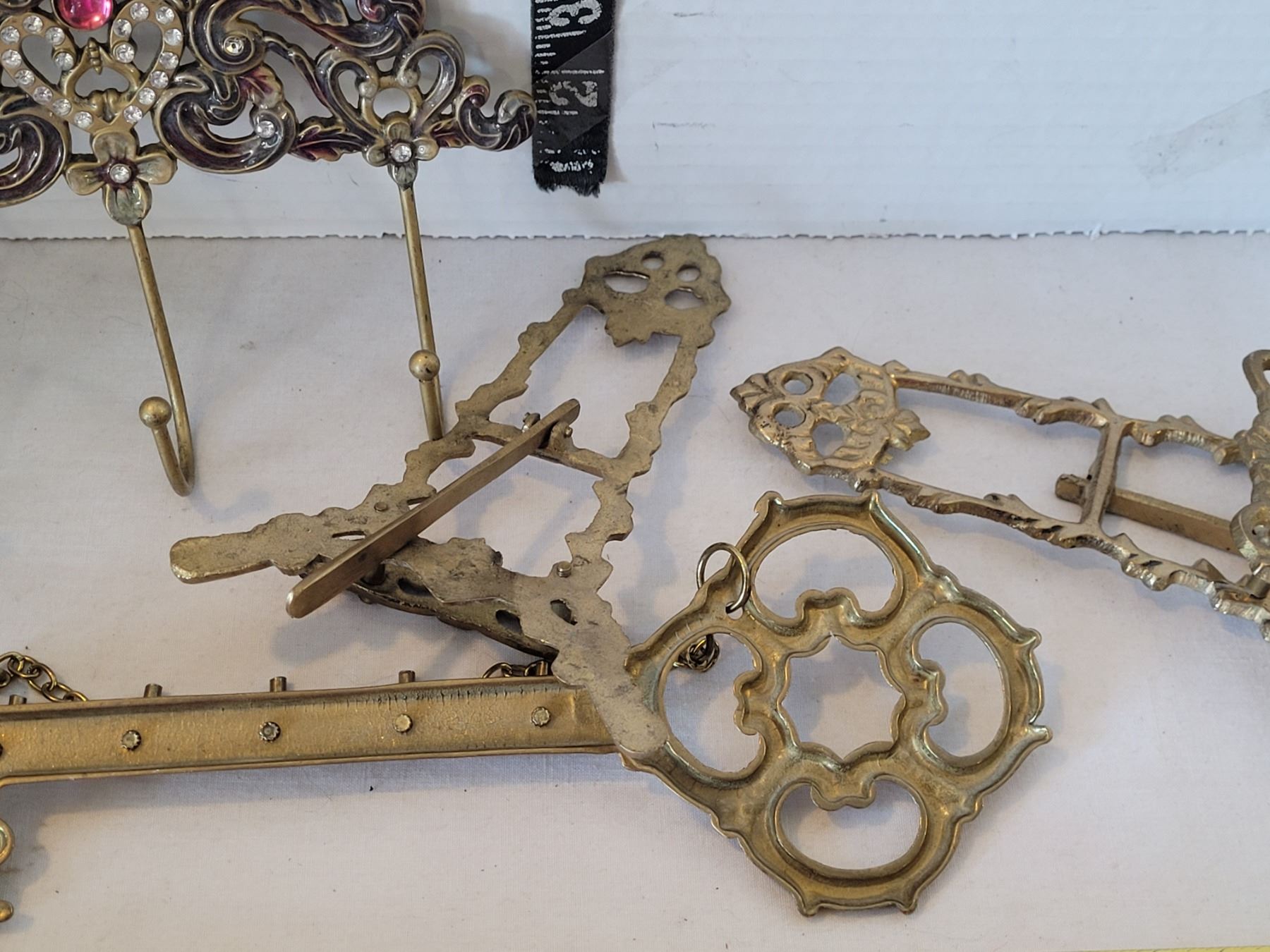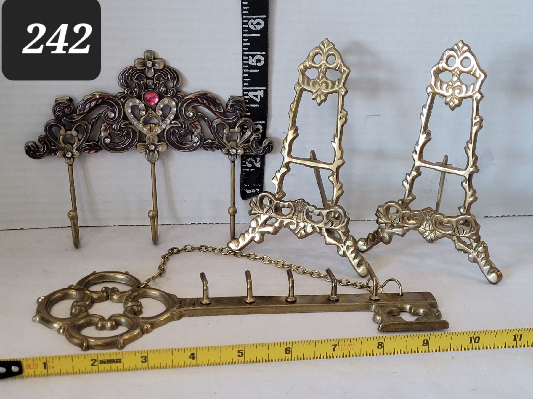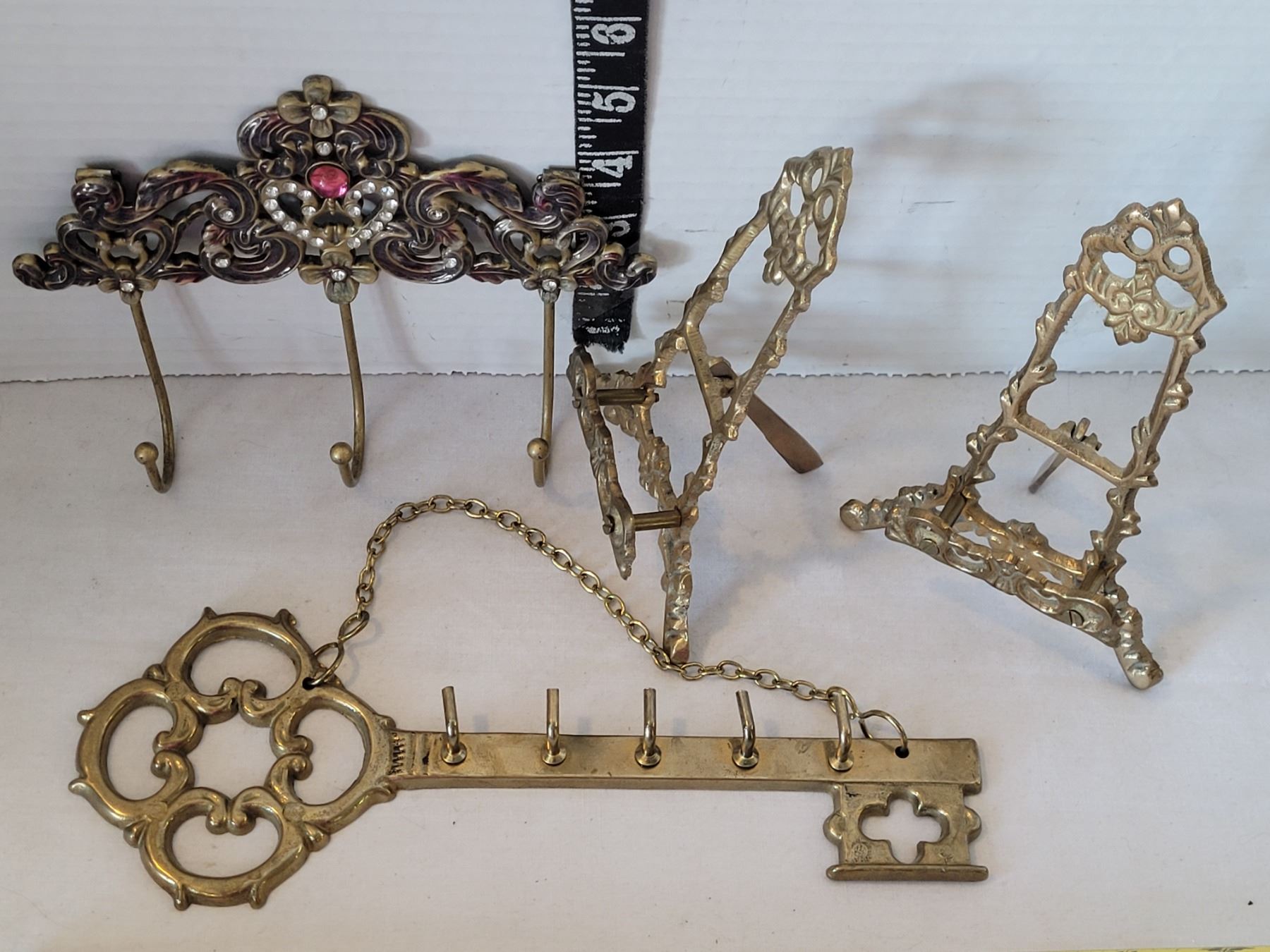 Ornate brass plate stands, key rack & wall hooks.