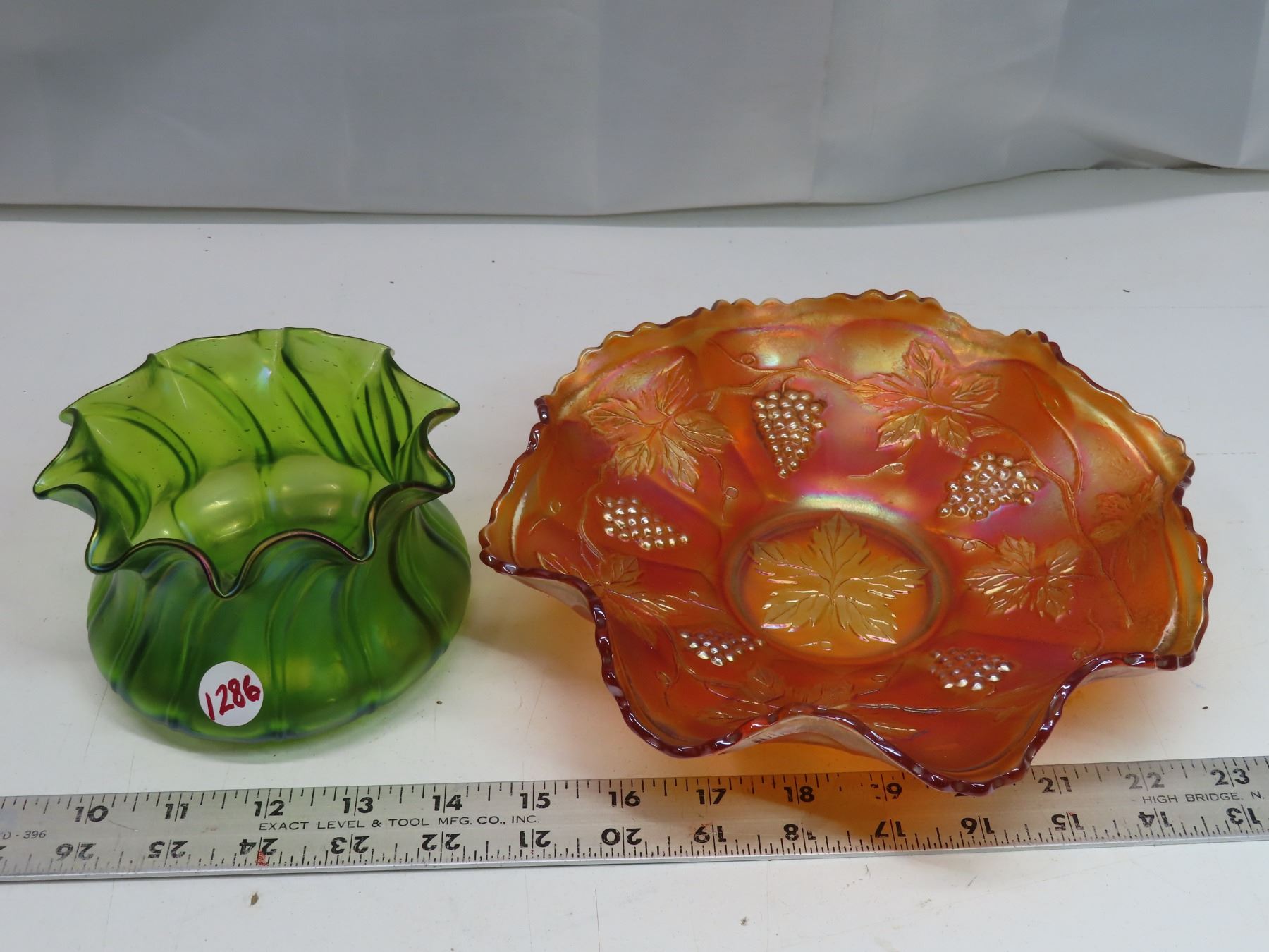 Ornate orange Carnival Glass dish, & Green Scalloped candy bowl