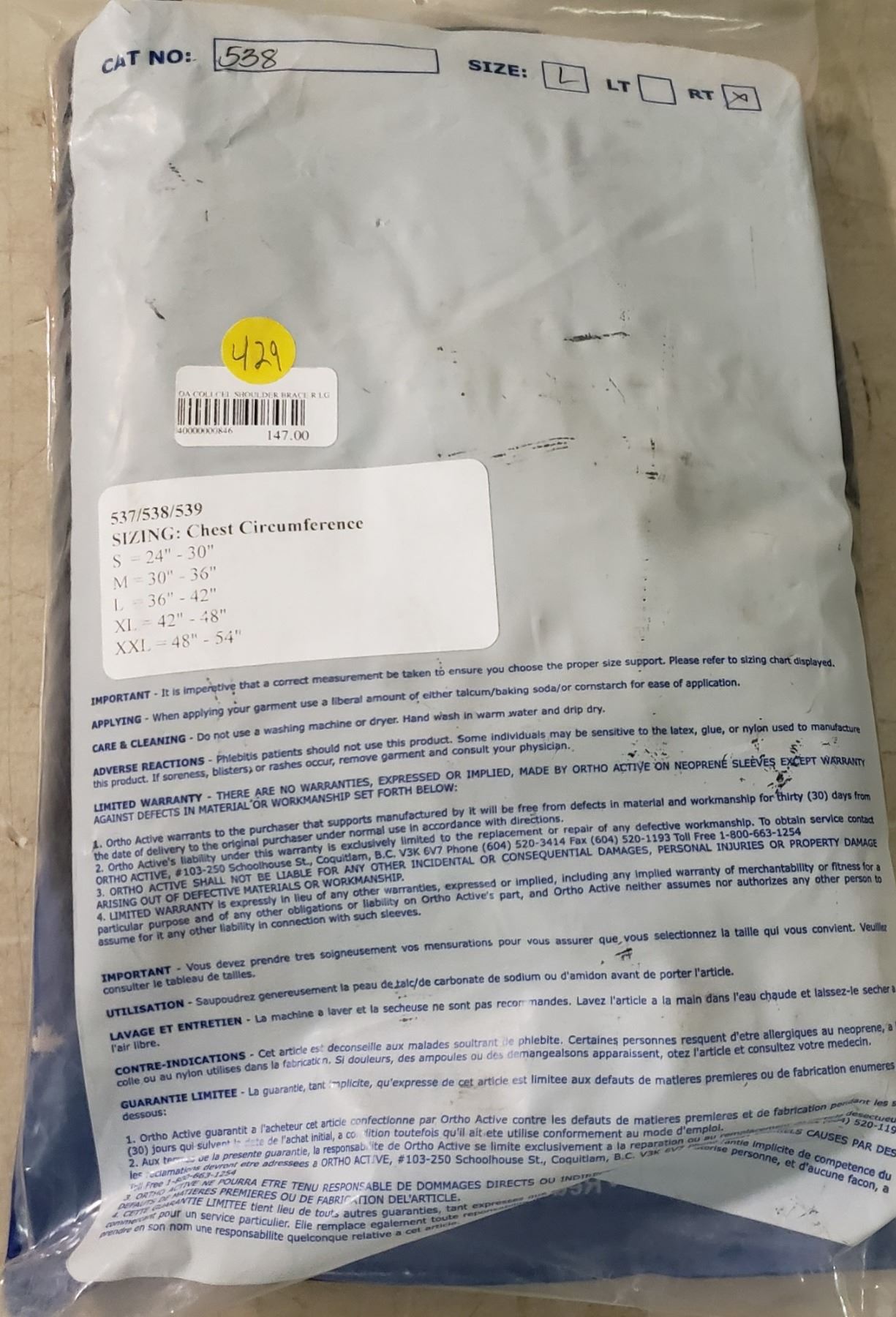 Ortho Active Collcel Shoulder Brace R LG SRP $147.00