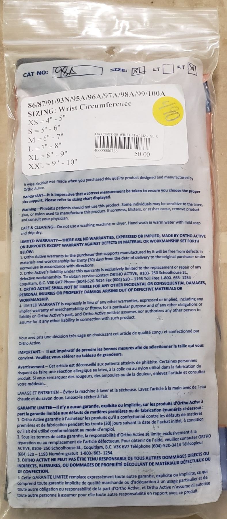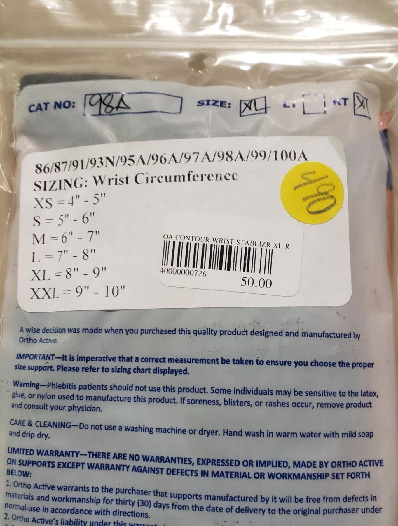 Ortho Active Contour Wrist Stablilizer XL R SRP $50.00