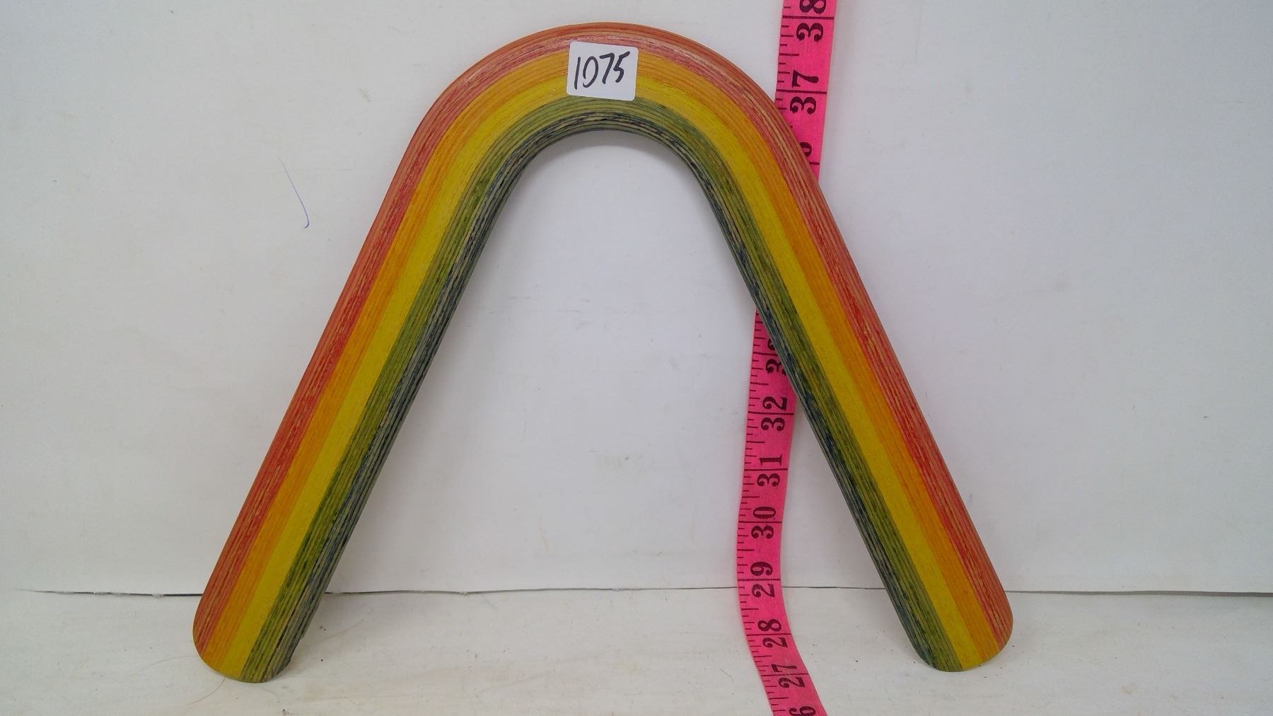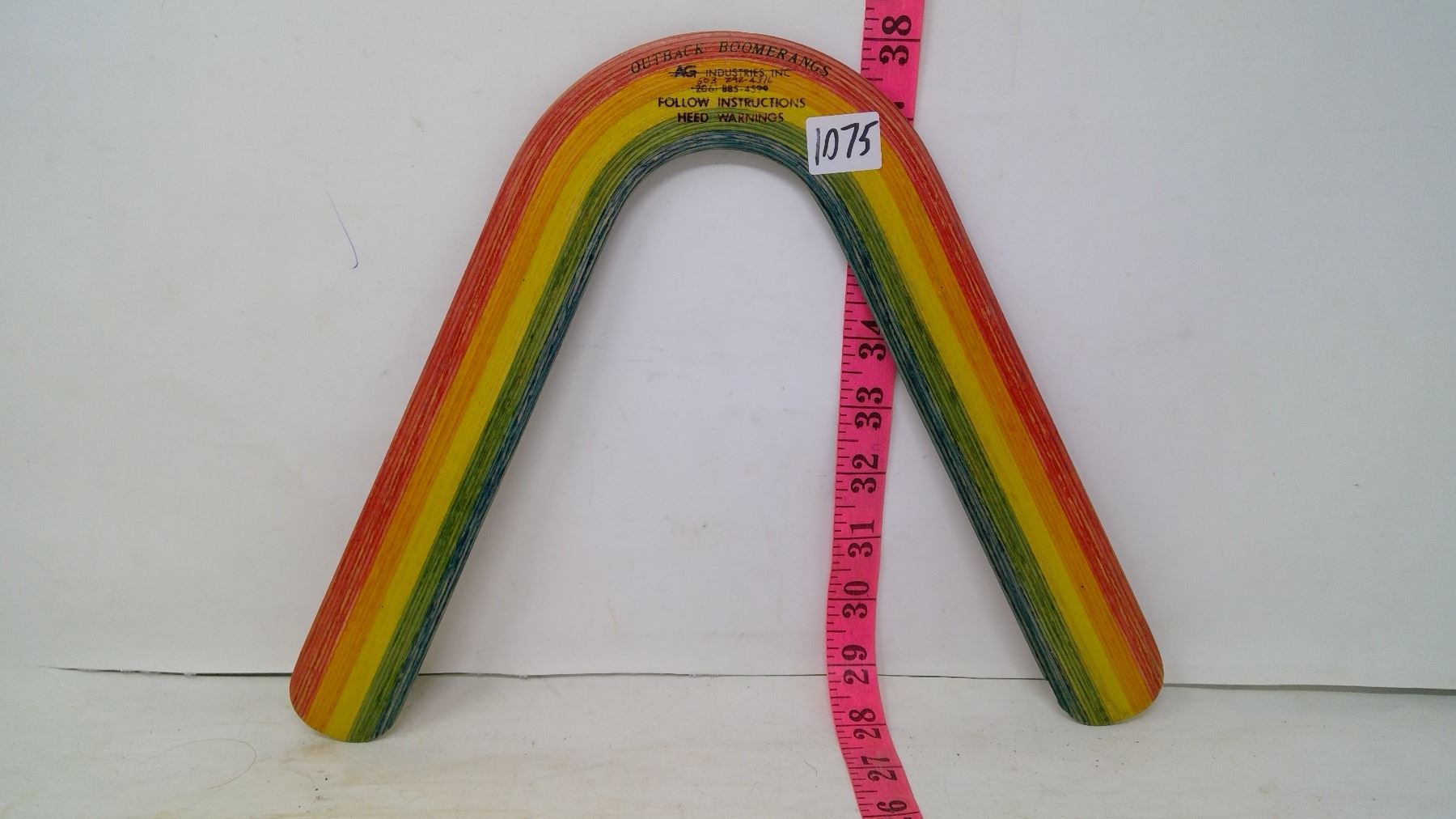 Made by Outback boomerangs, which is now retired. Extremely popular model. Their 'Oregon Hat' type made of ash wood strips were each dyed to result in a boomerang rainbow. Width: 12 1/2". Thickness: 1/8". Material: Color-dyed ash wood strips. Range: 30m. For right or left-handed person (ambidextrous). This boomerang is now rare since the company has stopped manufacturing.
