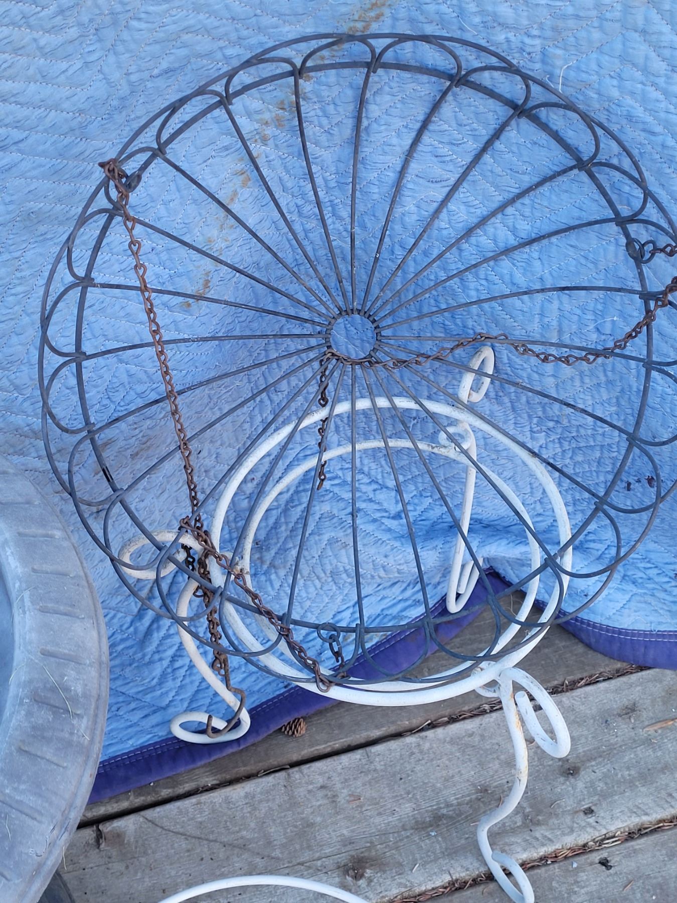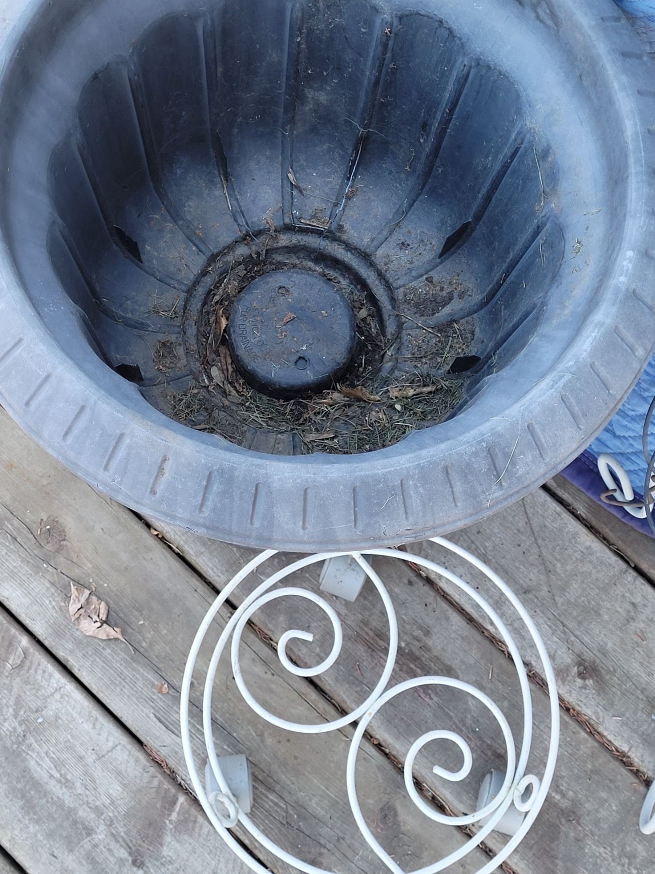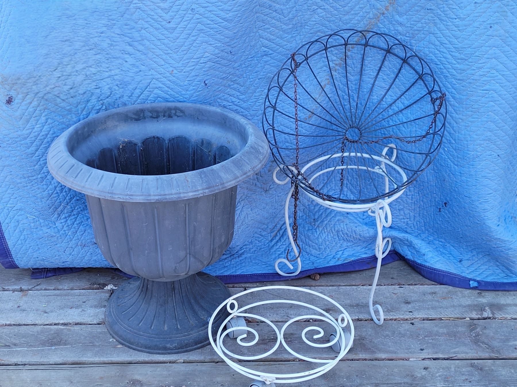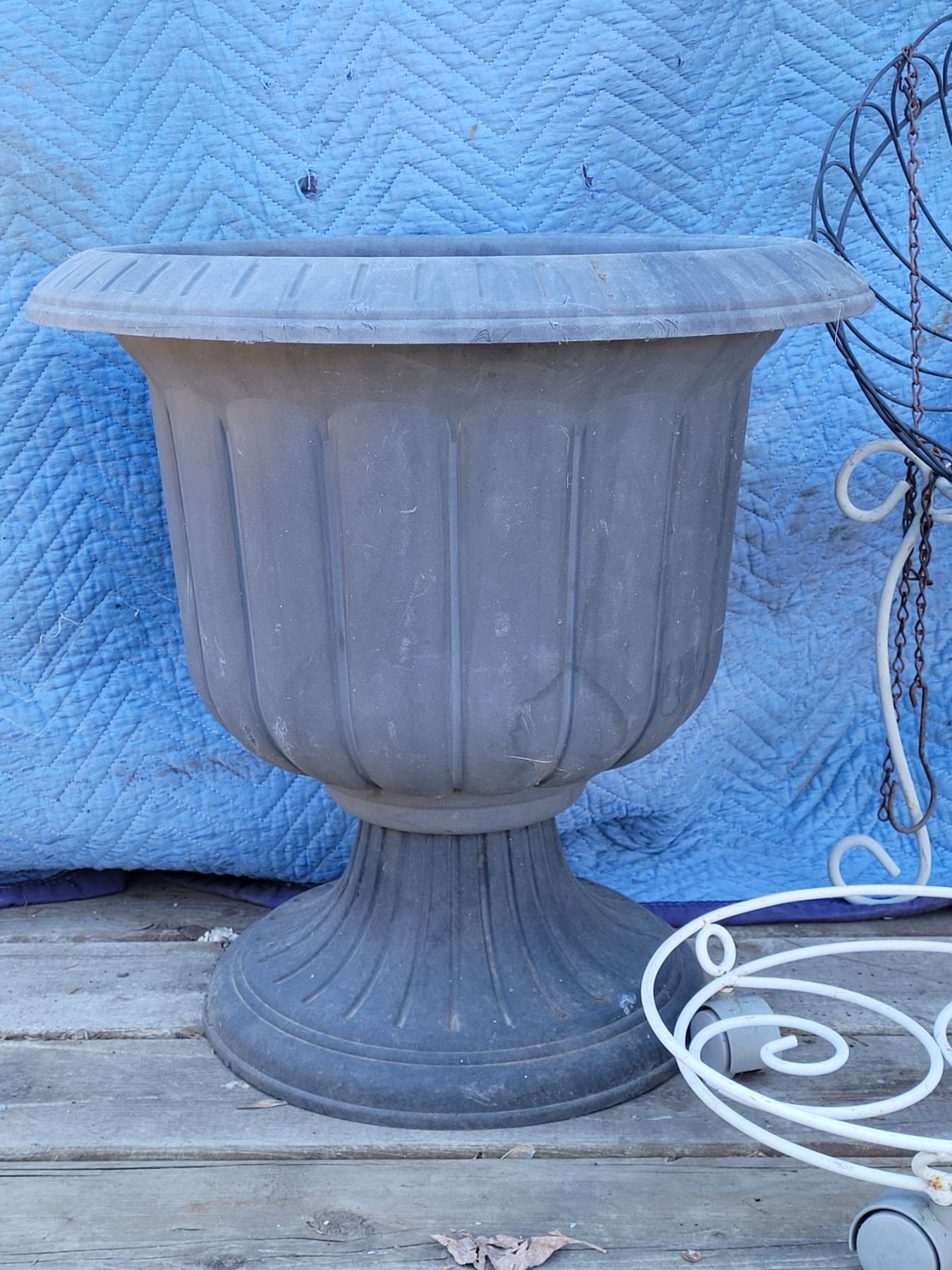 Outdoor plant urn 18”H. Metal rolling & stationary plant stands.