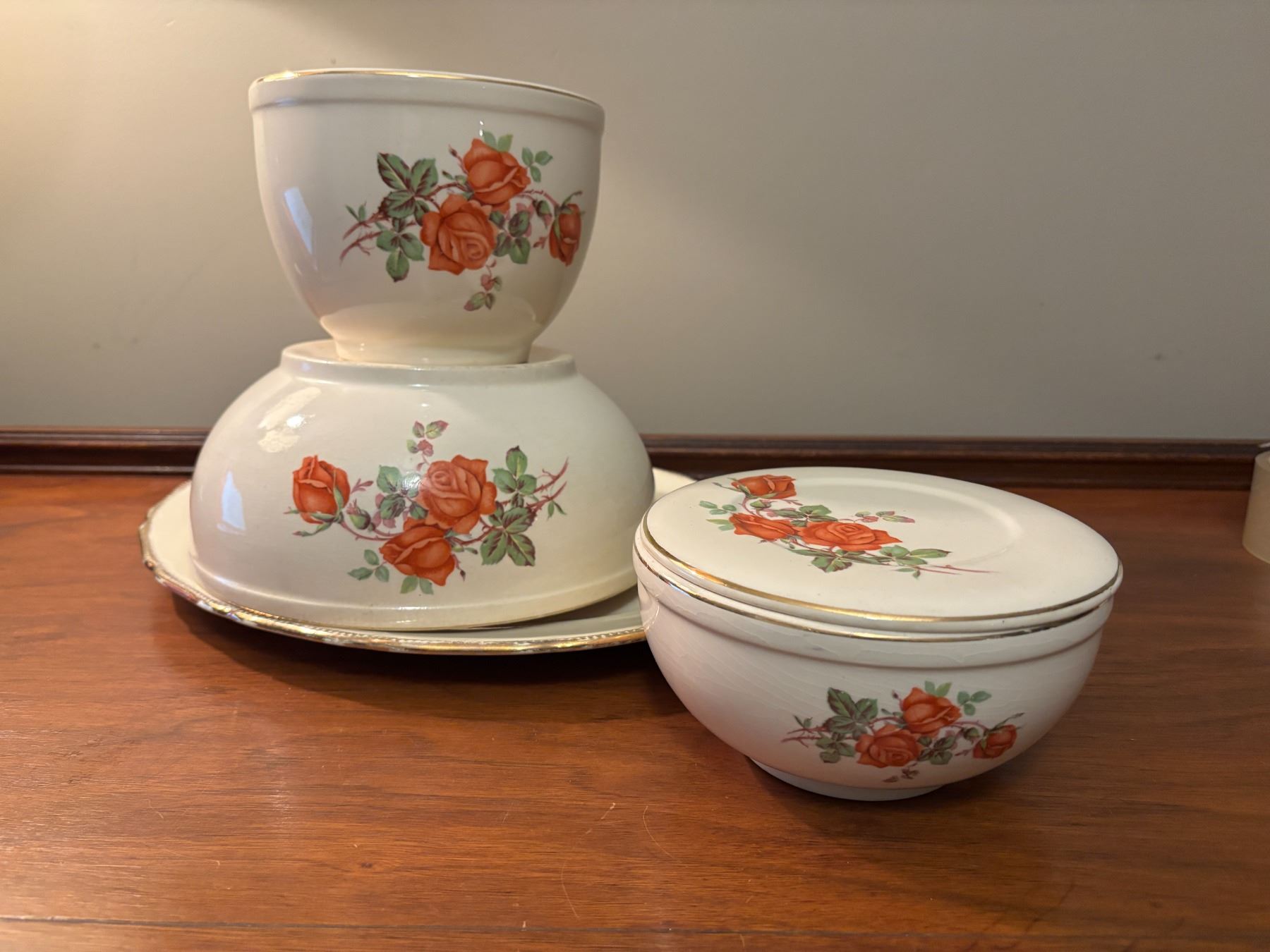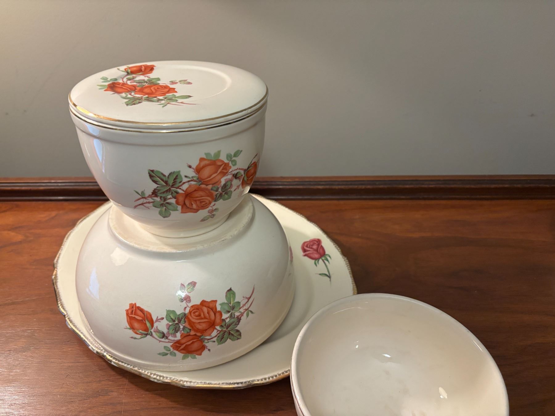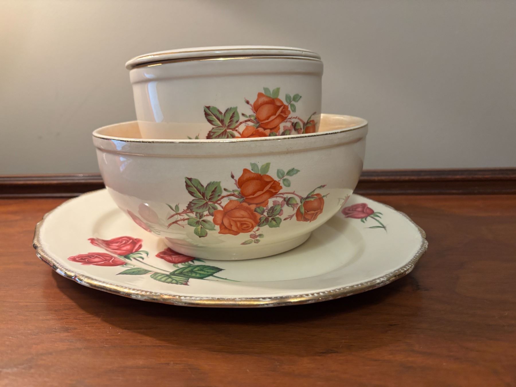 Cream serving/baking bowls, interchangeable lid, gold edging, 15.5cm (2) and larger is 23cm