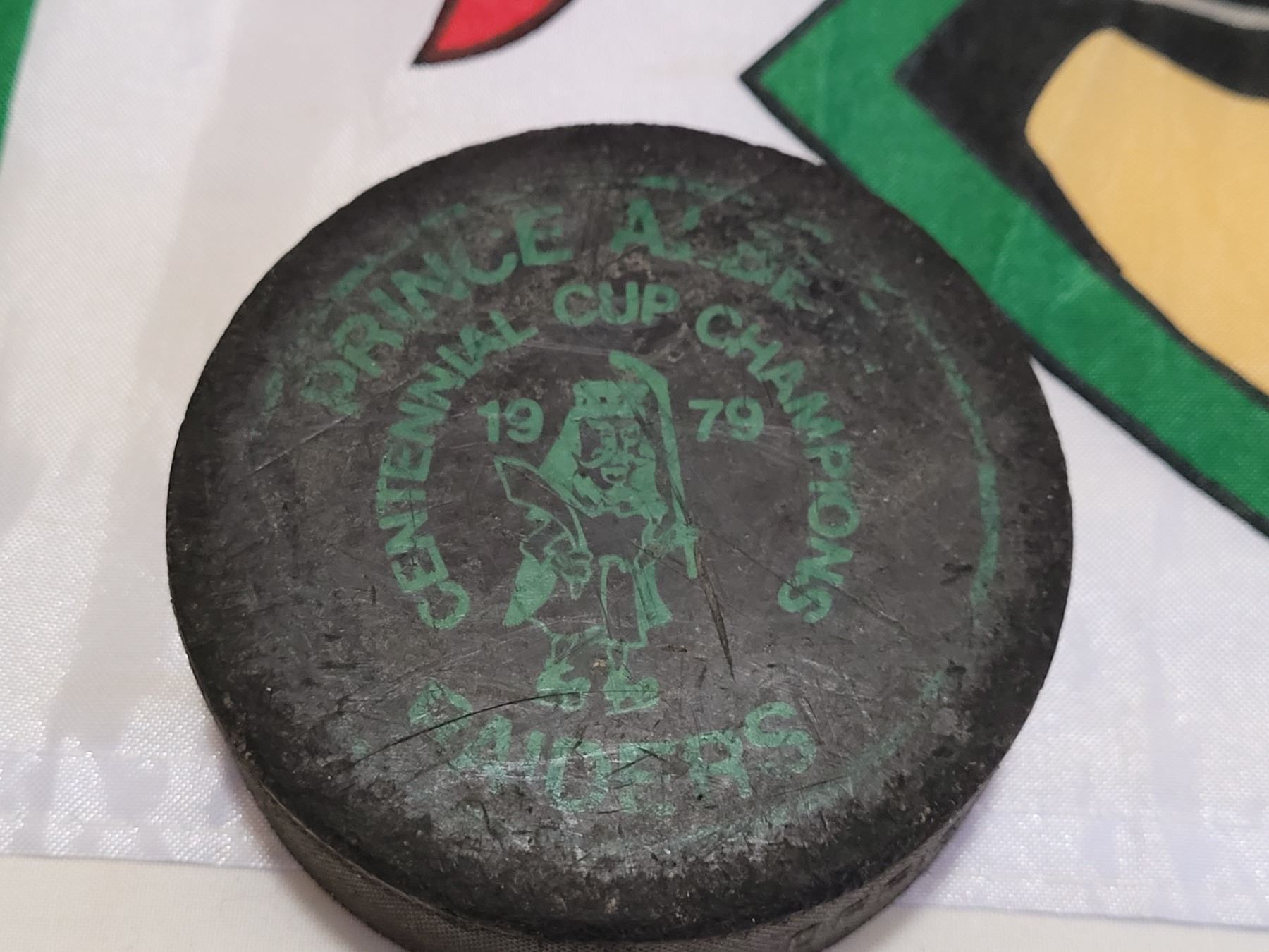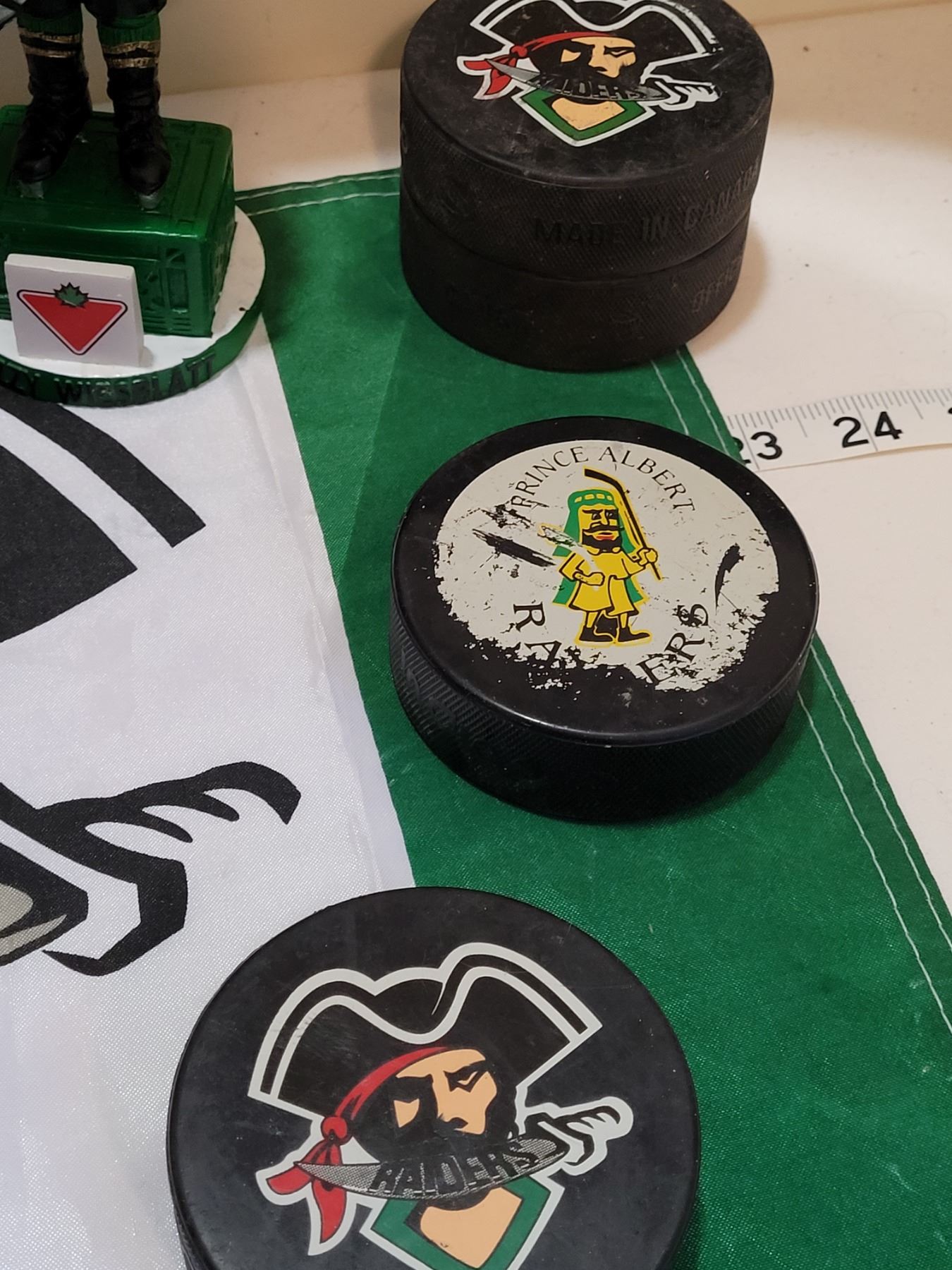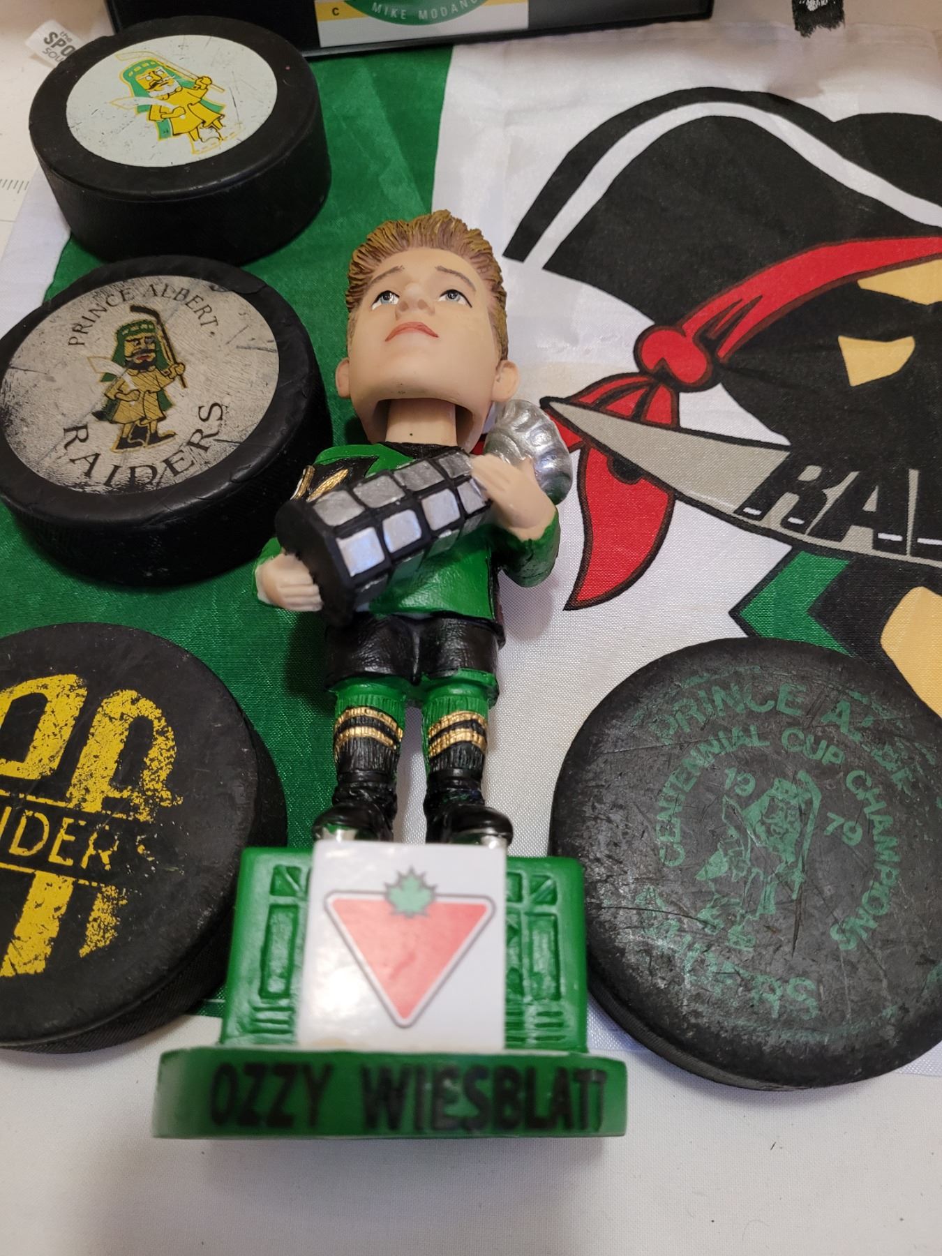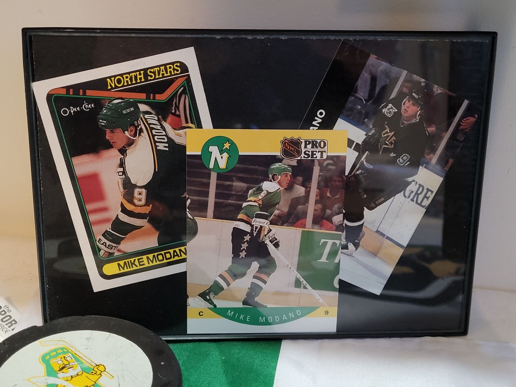 PA raiders lot. Old pucks, flag, bobble head & North Star cards of former Raider Mike Modano.