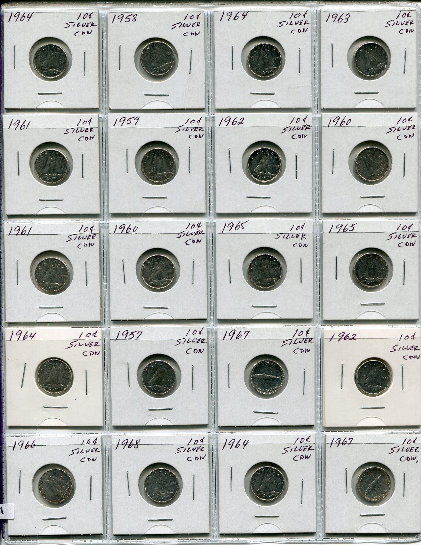 PAGE OF 20 CNDN SILVER DIMES 1957-1968