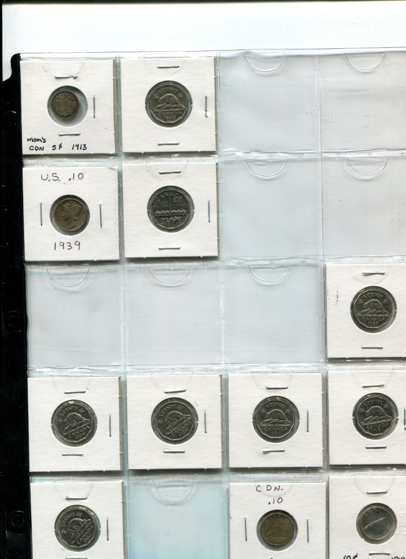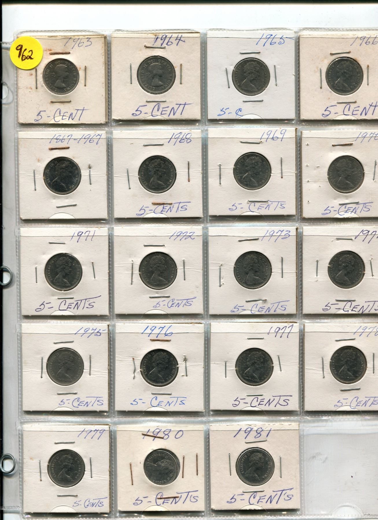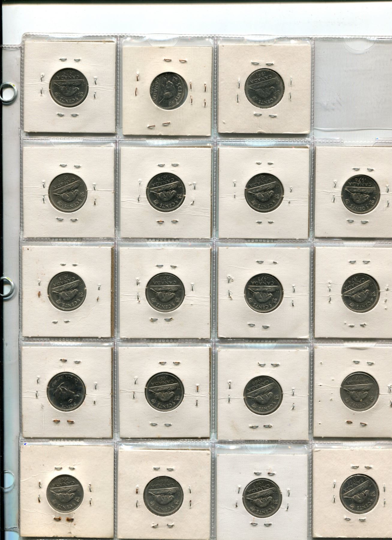 Page of Canadian Five Cent Coins 1963-1981, Canadian Five Cent Coins and US Ten Cent Coins