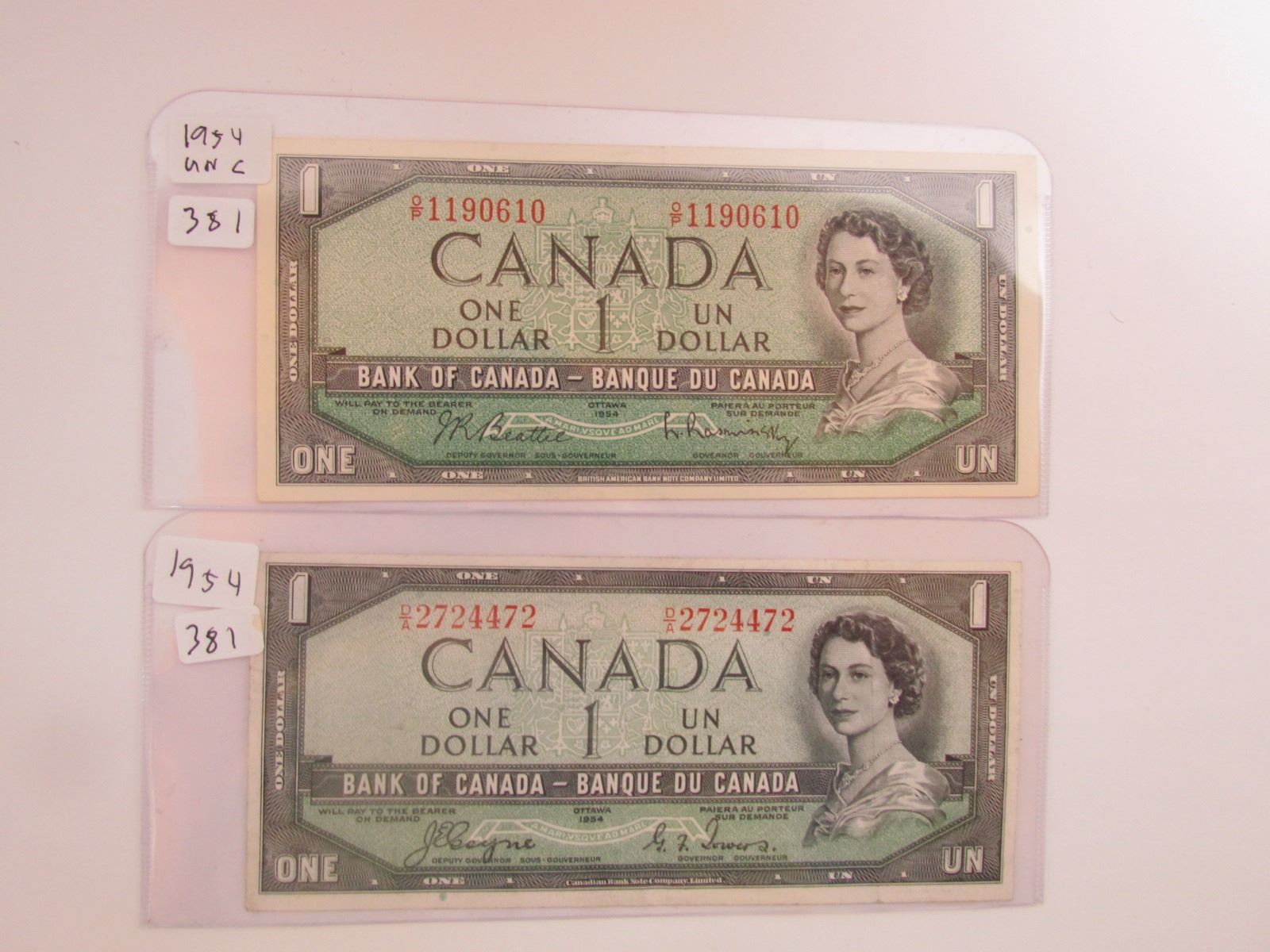 PAIR OF 1954 $1.00 BILLS. 1 UNC