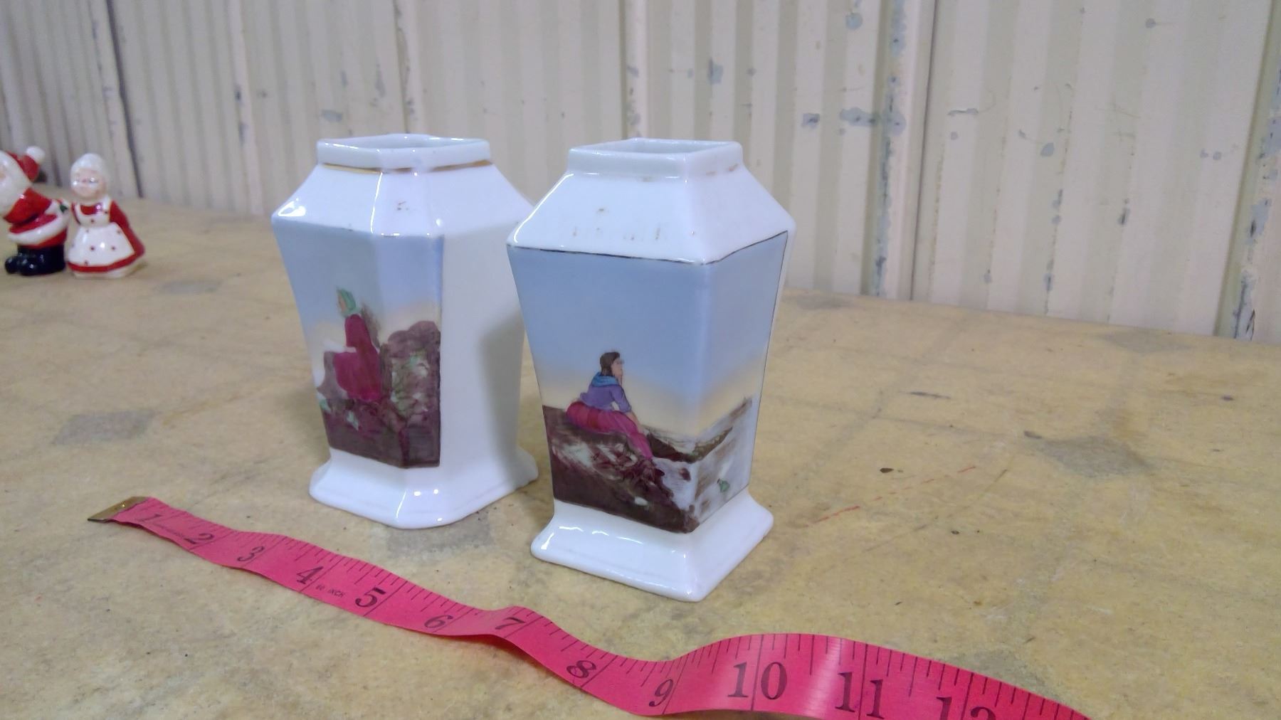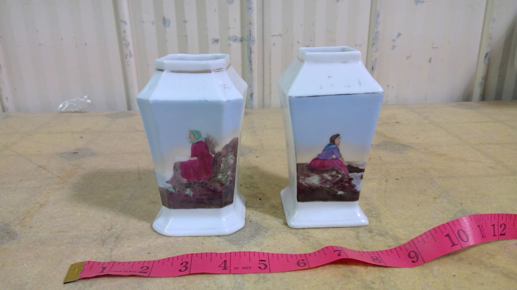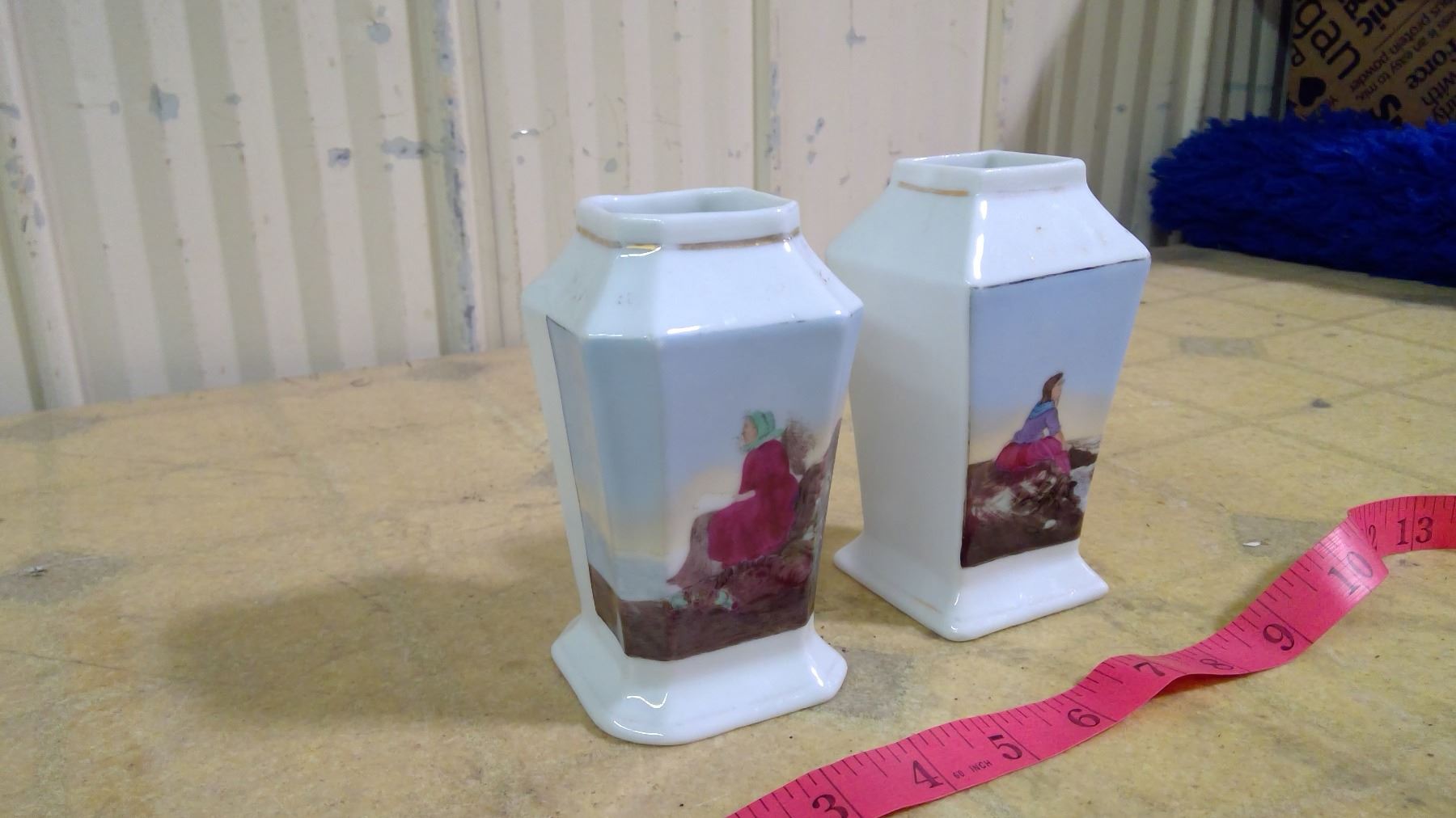PAIR OF OLD BLUE VASES WITH WOMEN IN PINK DRESSES FACING EACH OTHER
