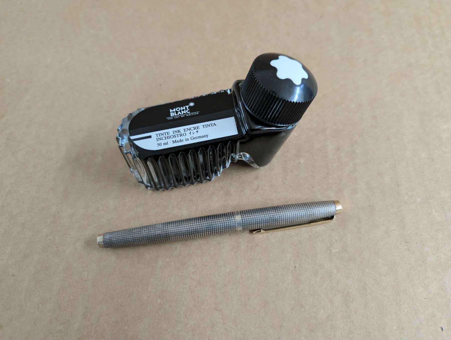 PARKER STERLING SILVER PARKER fountain pen. Made in USA. Plus half used bottle of Mont Blanc black ink.