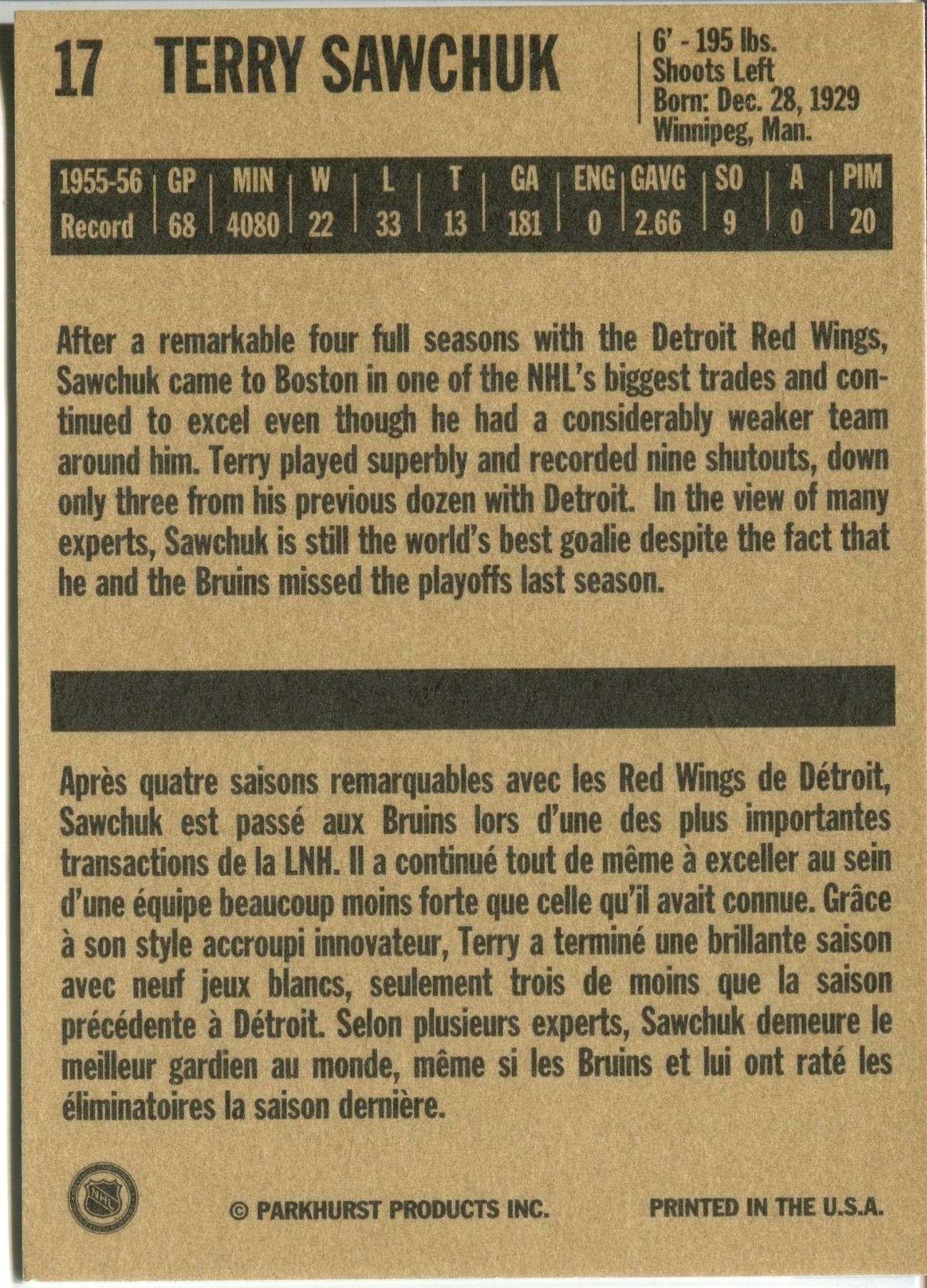 PARKHURST CARD TERRY SAWCHUK