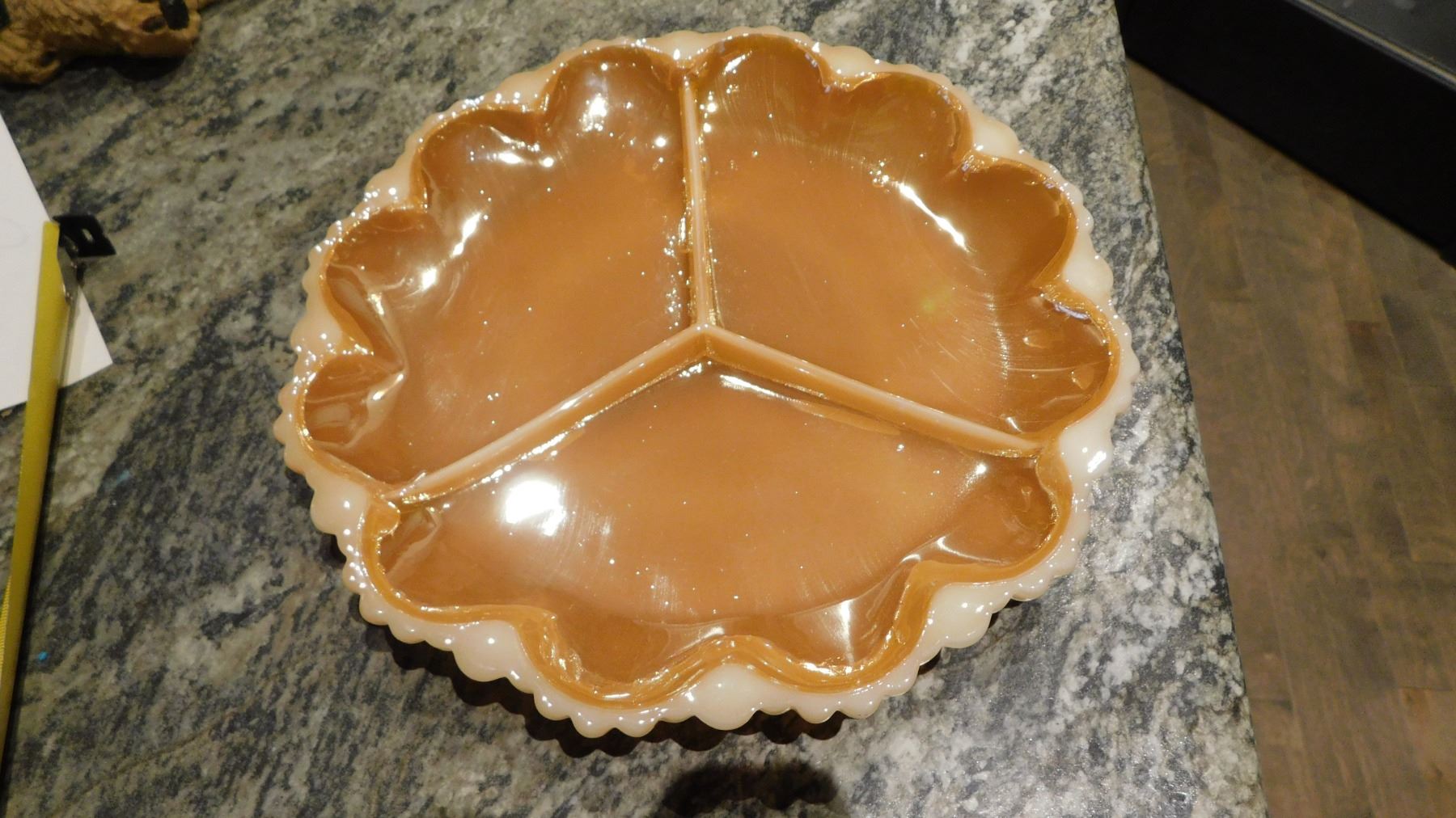 PEACH LUSTRE AND WHITE, FIRE KING DIVIDED DISH