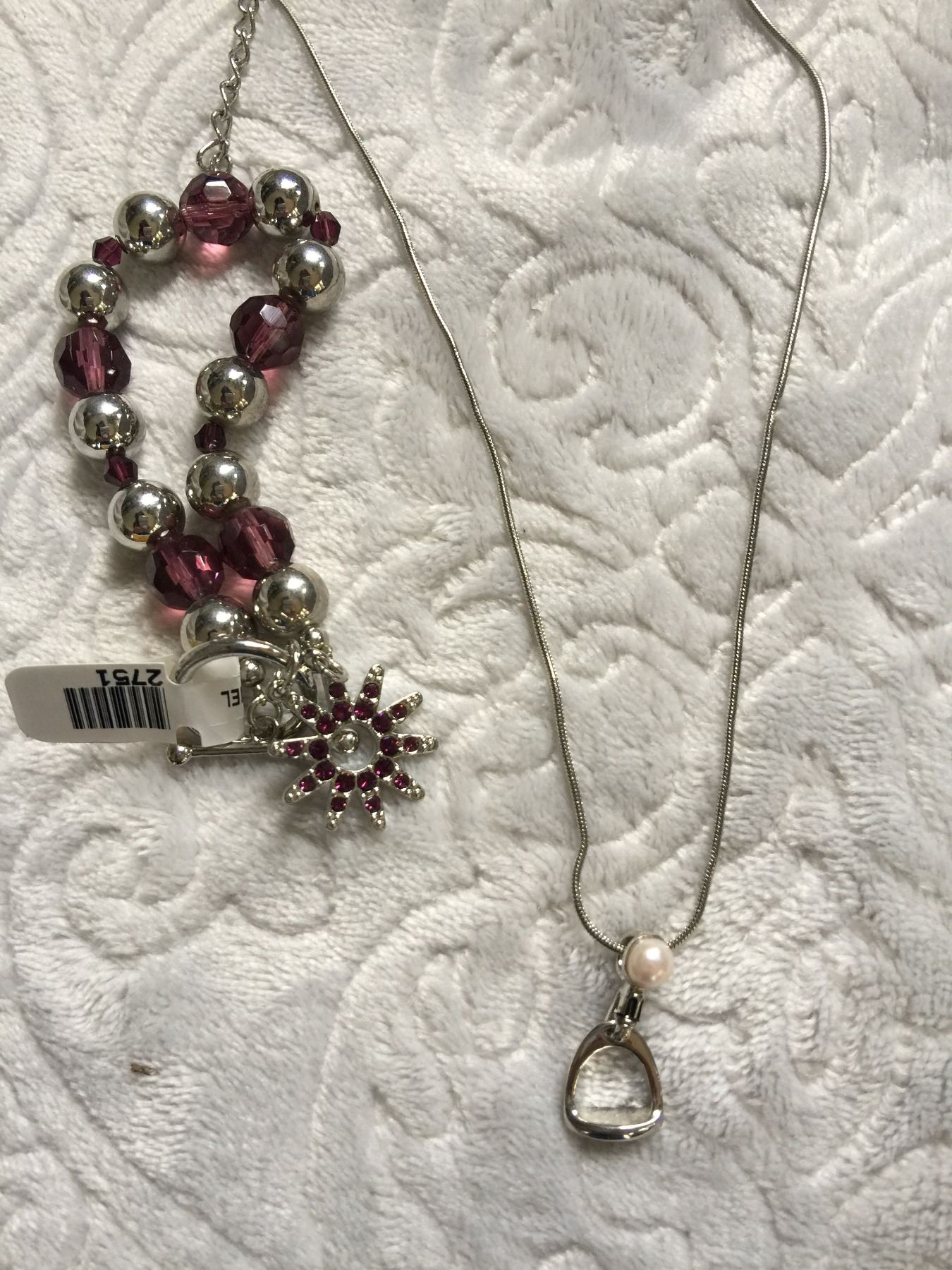 PEARL STONE ENGLISH STIRRUP NECKLACE AND PURPLE CRYSTAL SPUR ROWEL BRACELET/NICKEL FREE