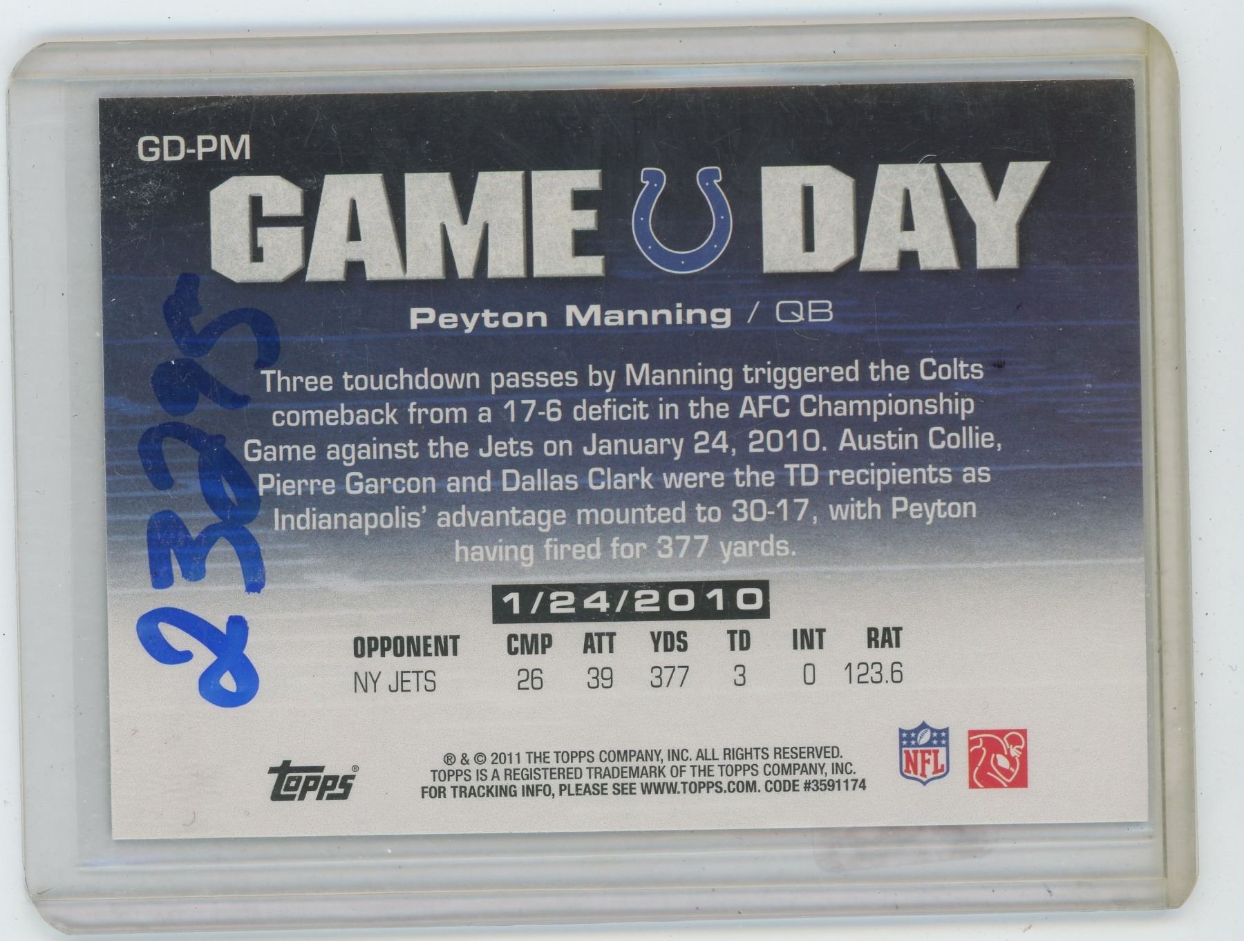 PEYTON CANSECO, QB, INDIANAPOLIS COLTS, NFL FOOTBALL CARD. GAME DAY. 2011 TOPPS. GEM UNC