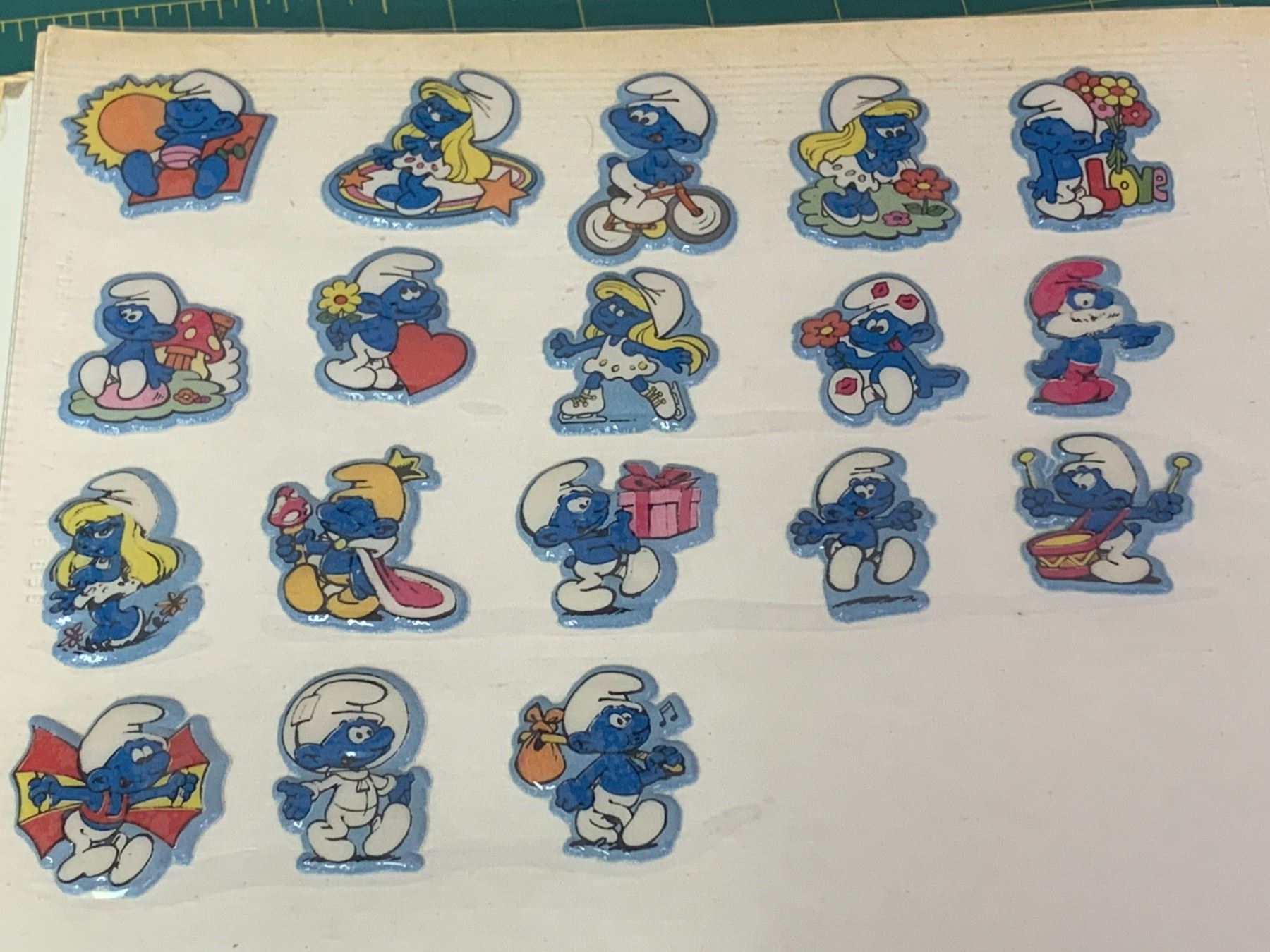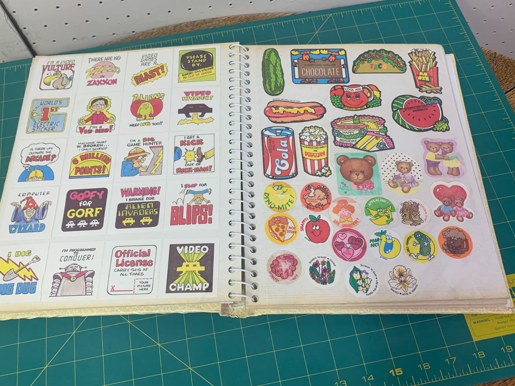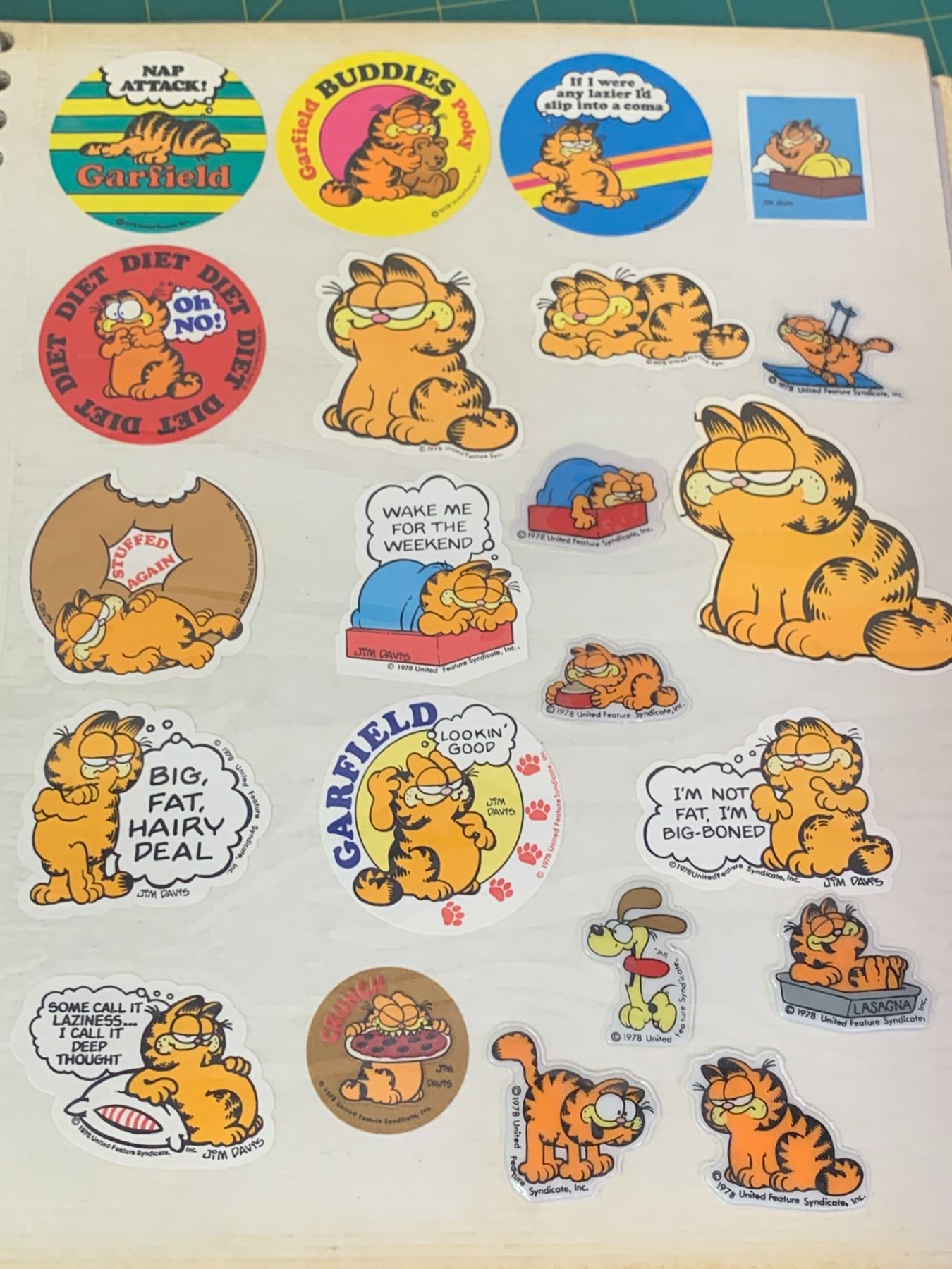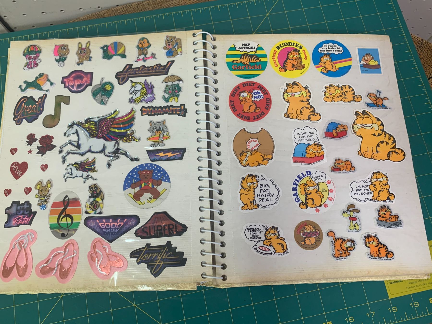PHOTO ALBUM OF APPROX 200 VINTAGE STICKERS SMURFS GARFIELD SCRATCH AND SNIFF GREMLINS AND MORE