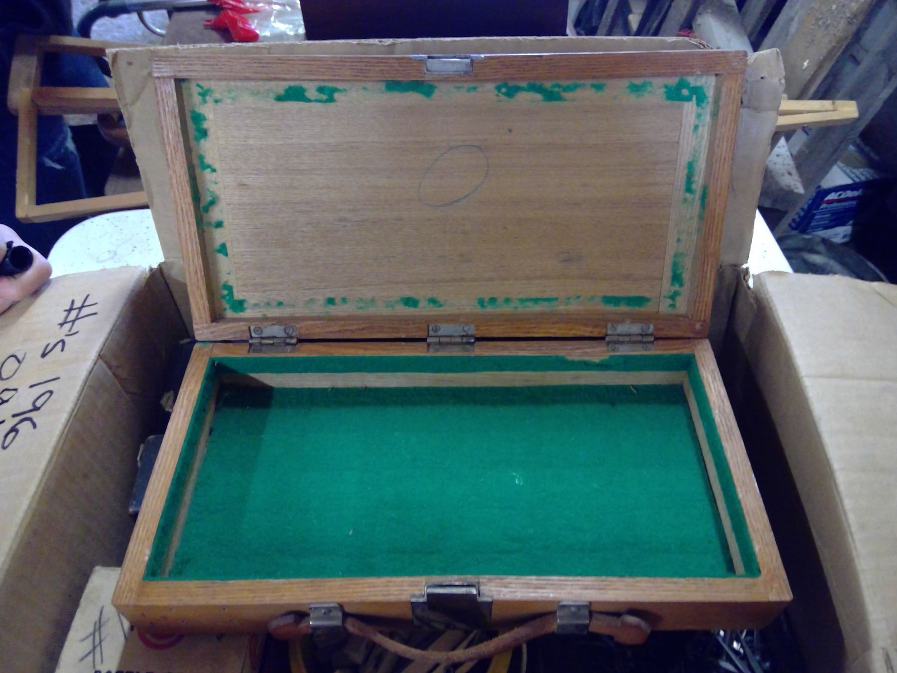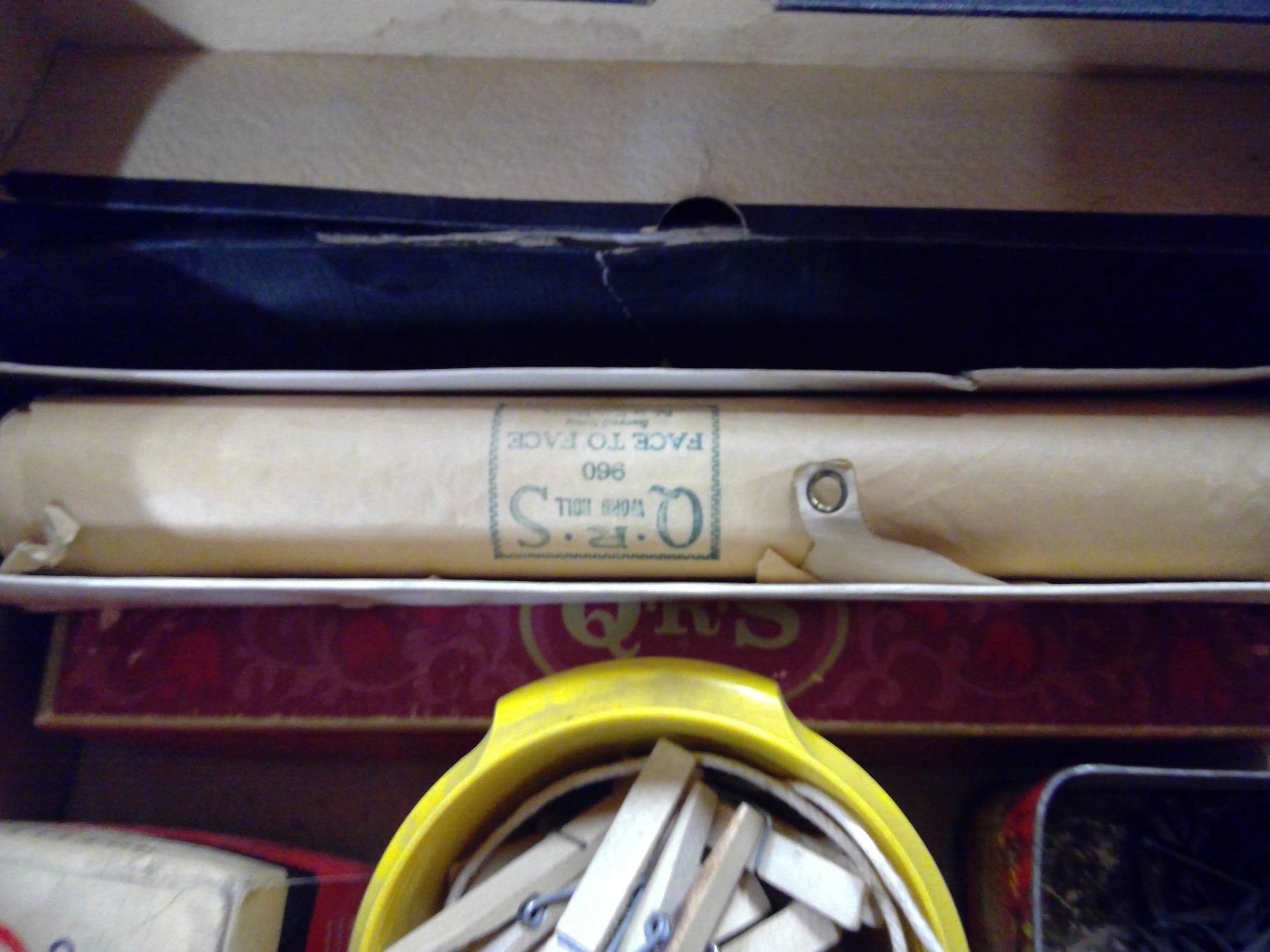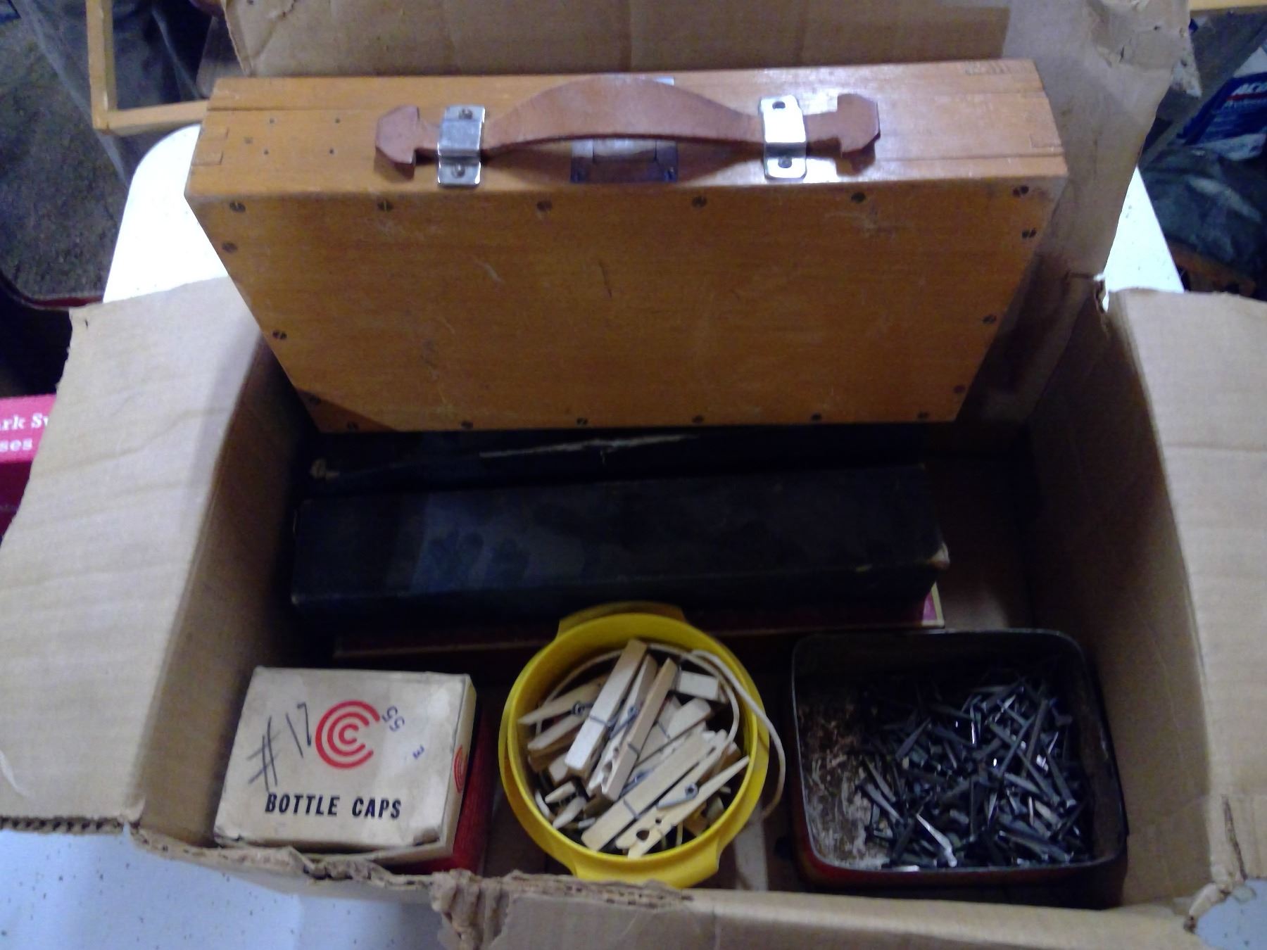 PIANO ROLLS, BOX OF NAILS, CLOTHES PINS, BOTTLE CAPS AND WOODEN CARRYING CASE