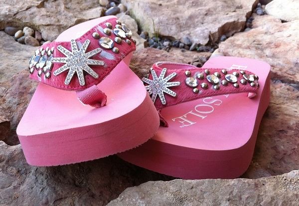 PINK HAIR ON HIDE ROWEL BLING FLIP FLOPS/Pink flip flops with a pink spur rowel on strap/Pink brindle on strap/Clear crystals on rowel/Small fits sizes 5-6