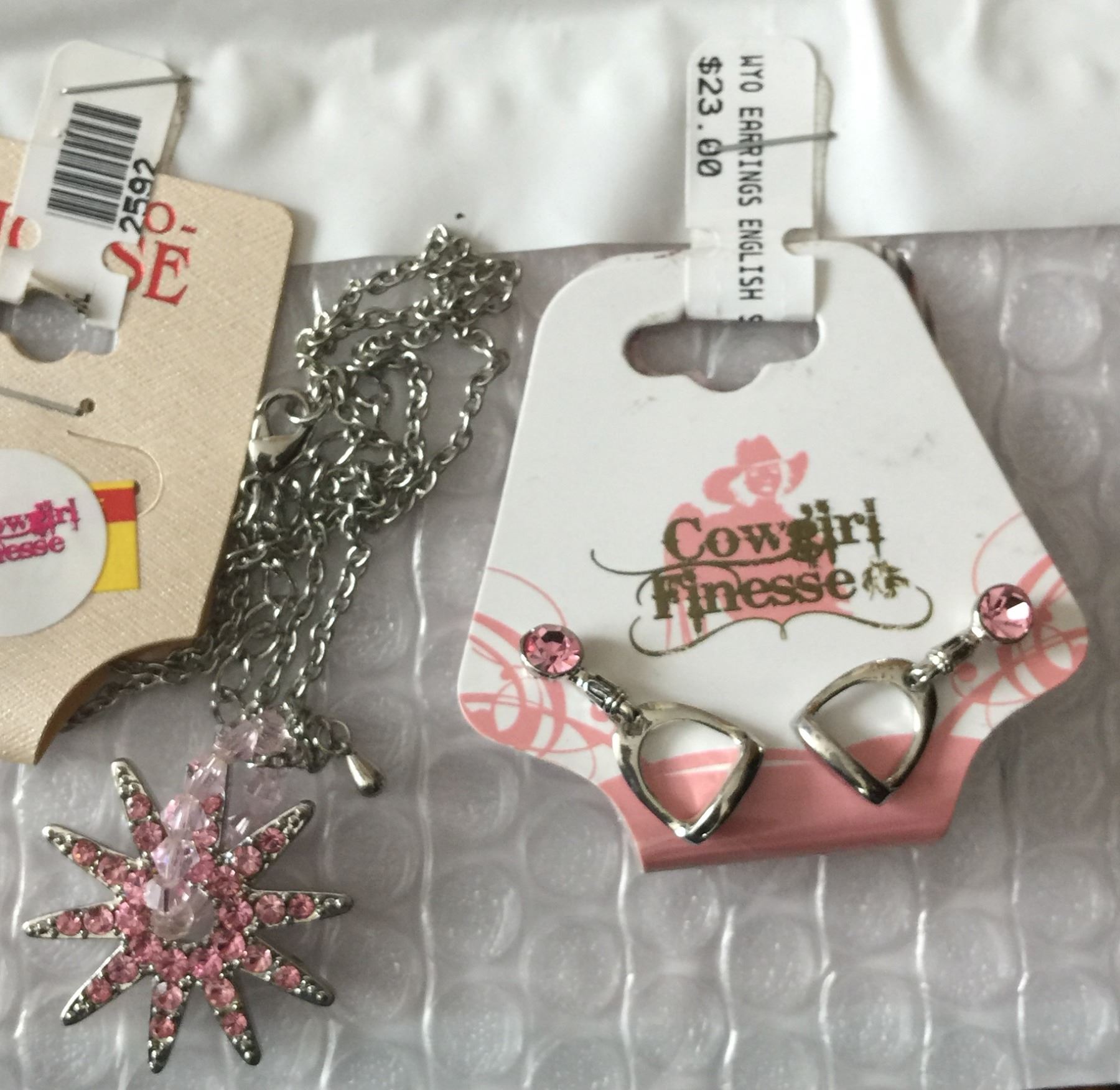 PINK STONE SPUR ROWEL NECKLACE/ENGLINSH STIRRUP EARRINGS/NICKEL FREE