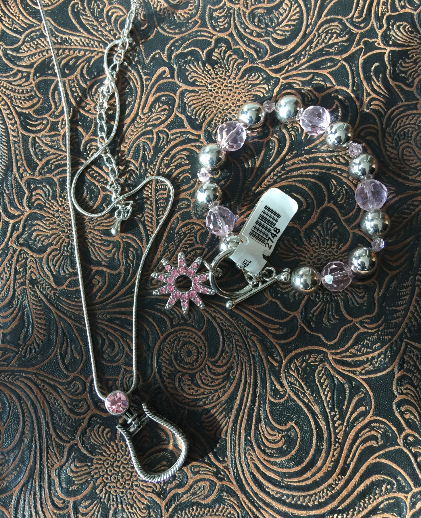 PINK STONE WESTERN STIRRUP NECKLACE/PINK CRYSTAL SPUR ROWEL CHARM BRACELET