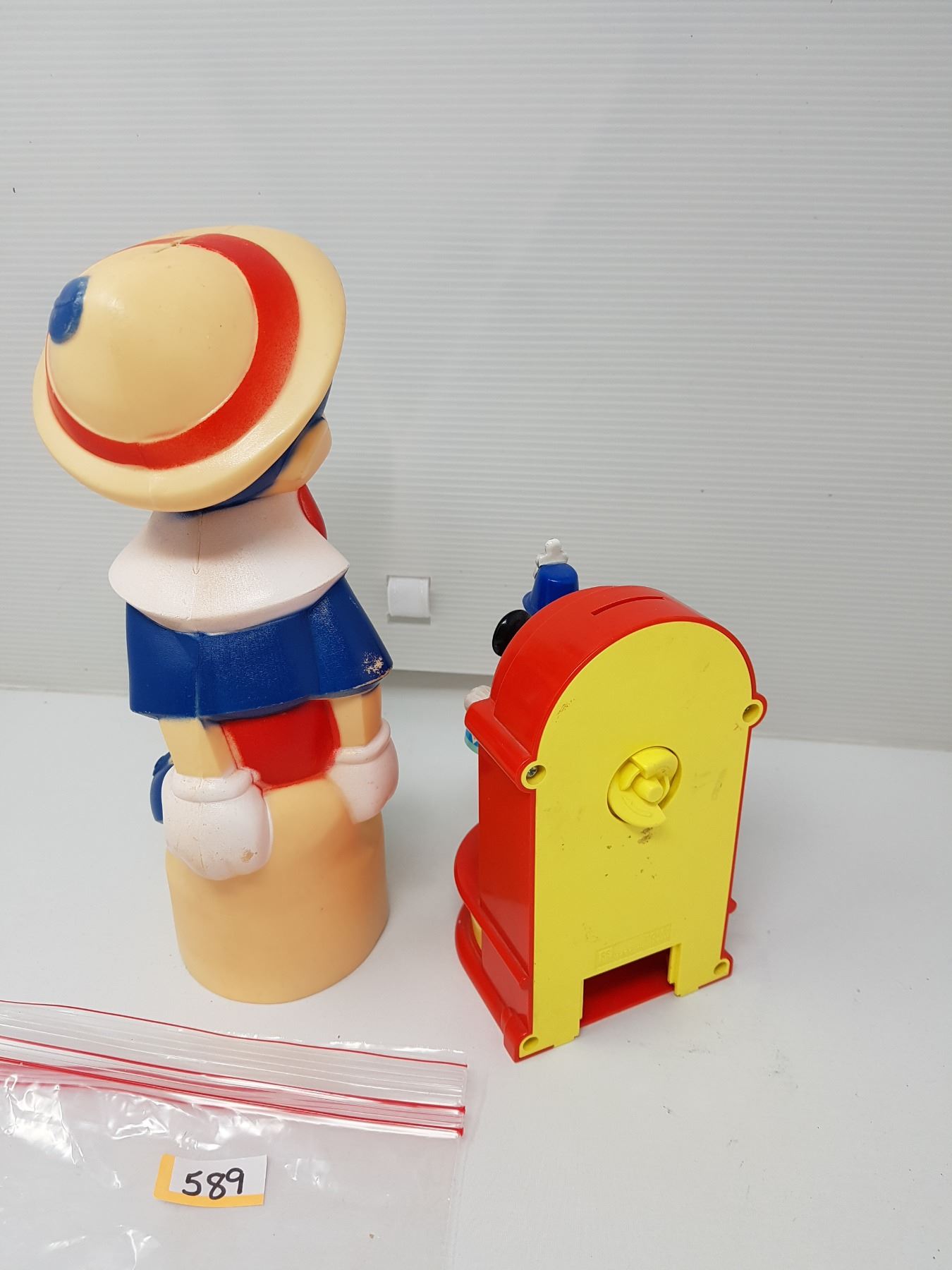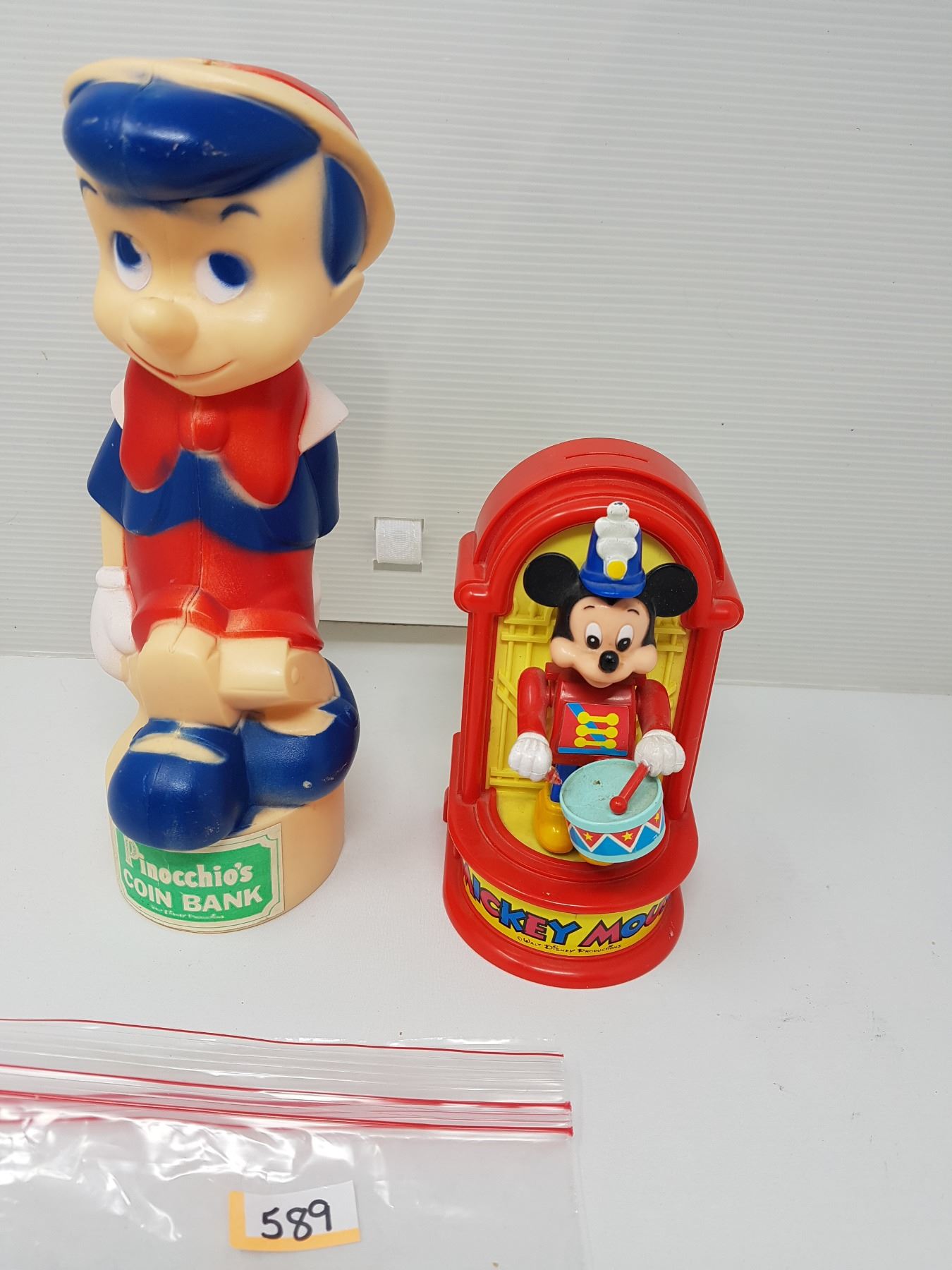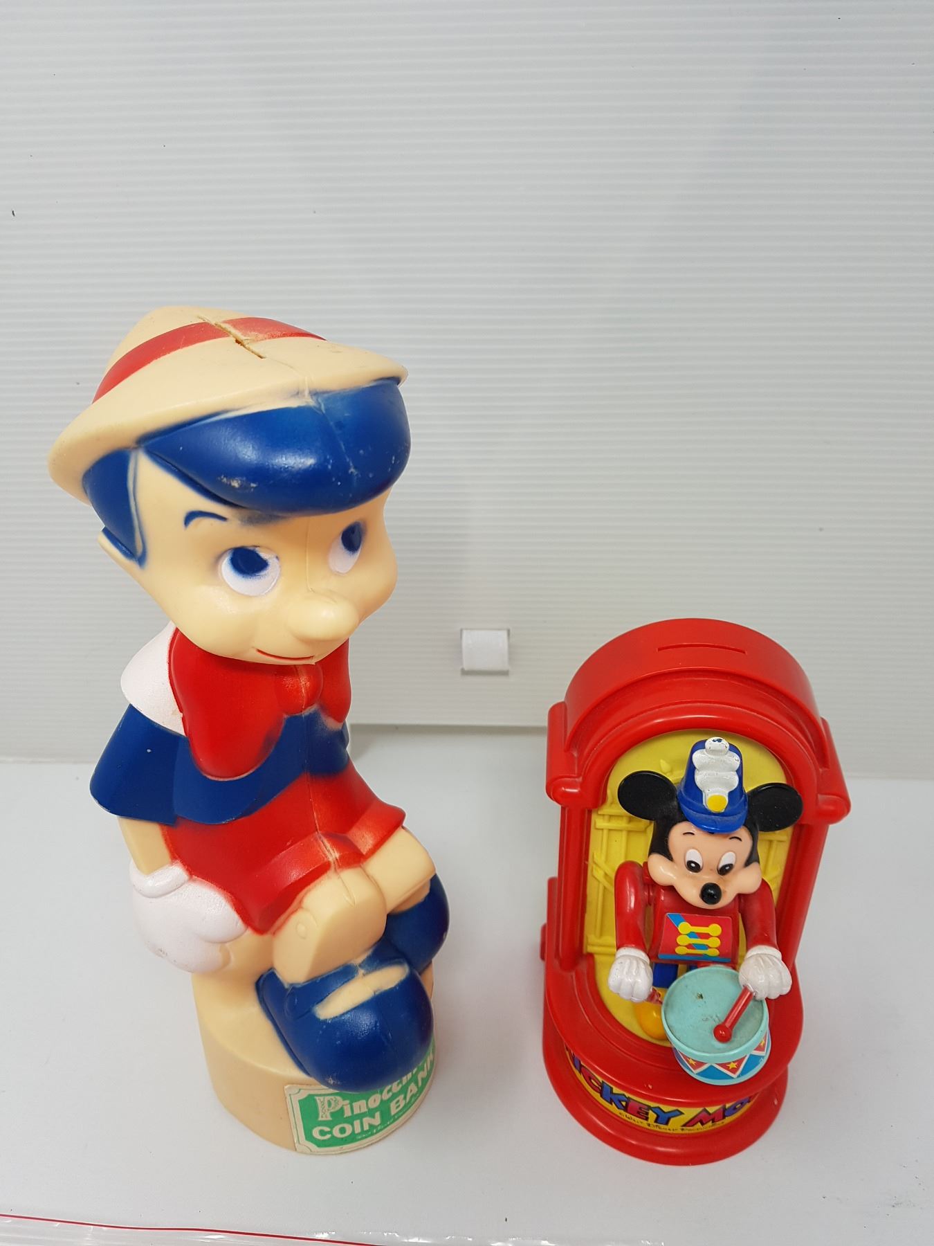 PINOCCHIO'S & MICKEY MOUSE COIN BANK (MICKEY HAS 1 STICK BROKEN)