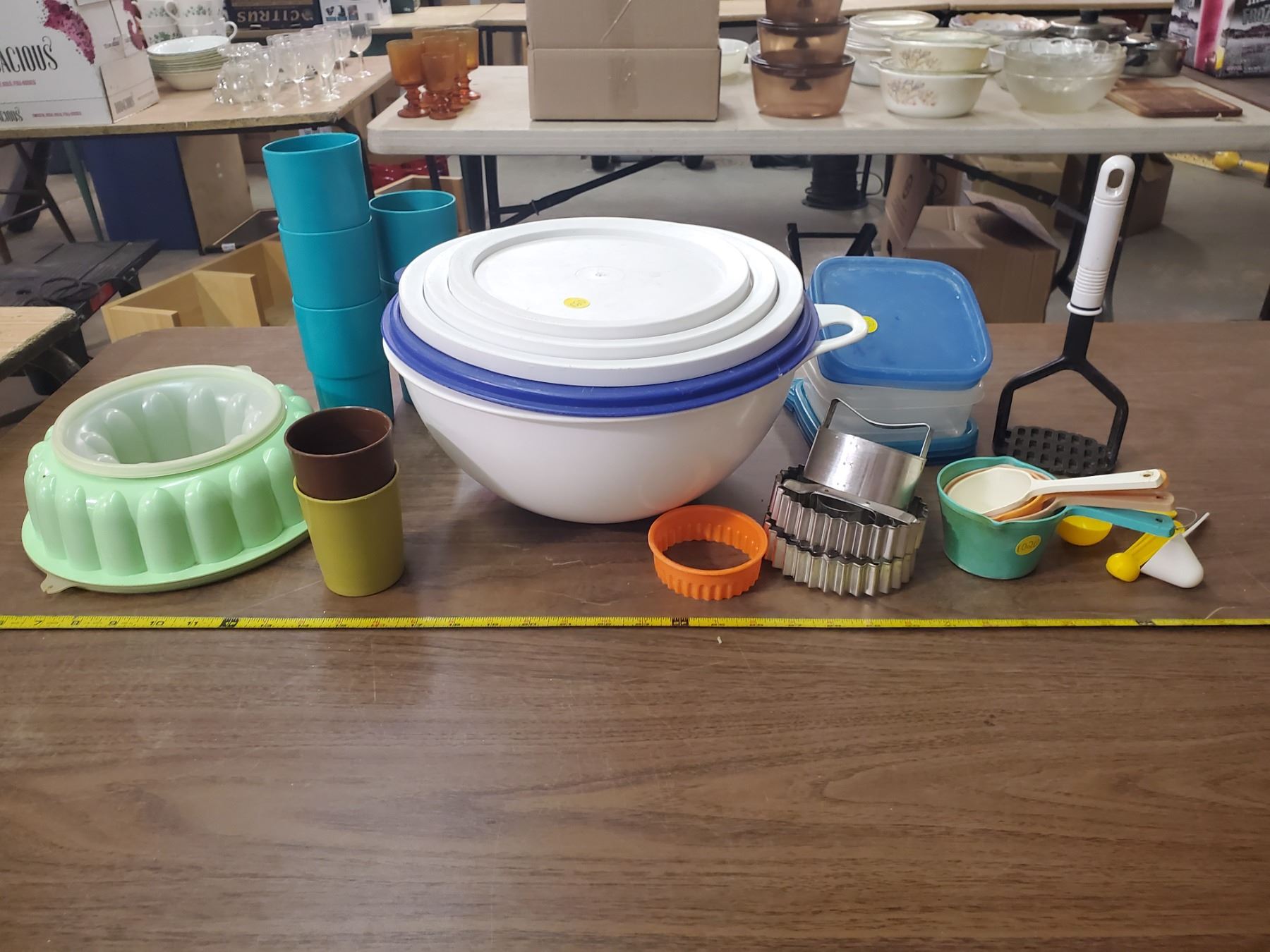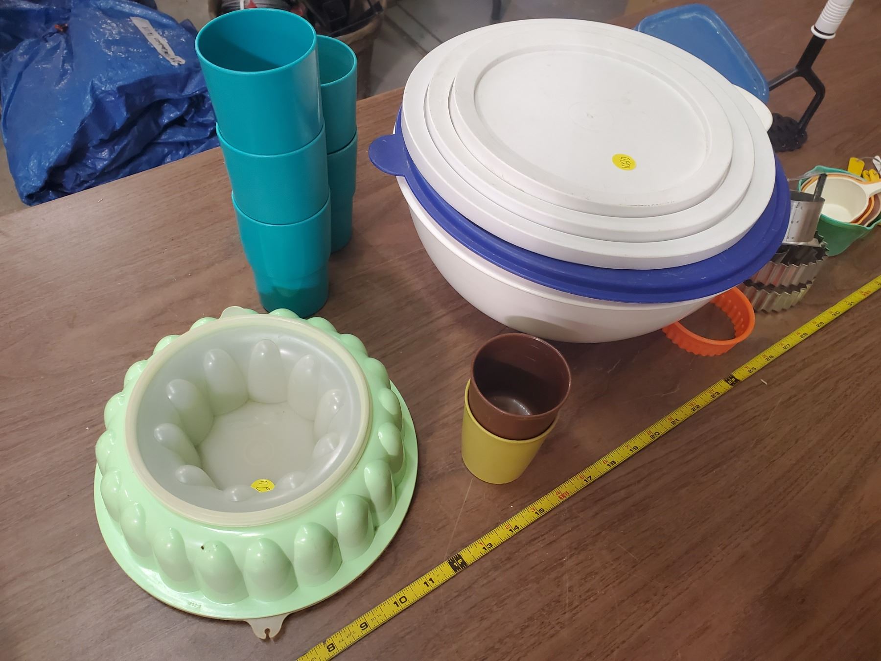 PLASTICWARE KITCHEN LOT, TUPPERWARE MOLD, MIXING BOWLS WITH LIDS ETC