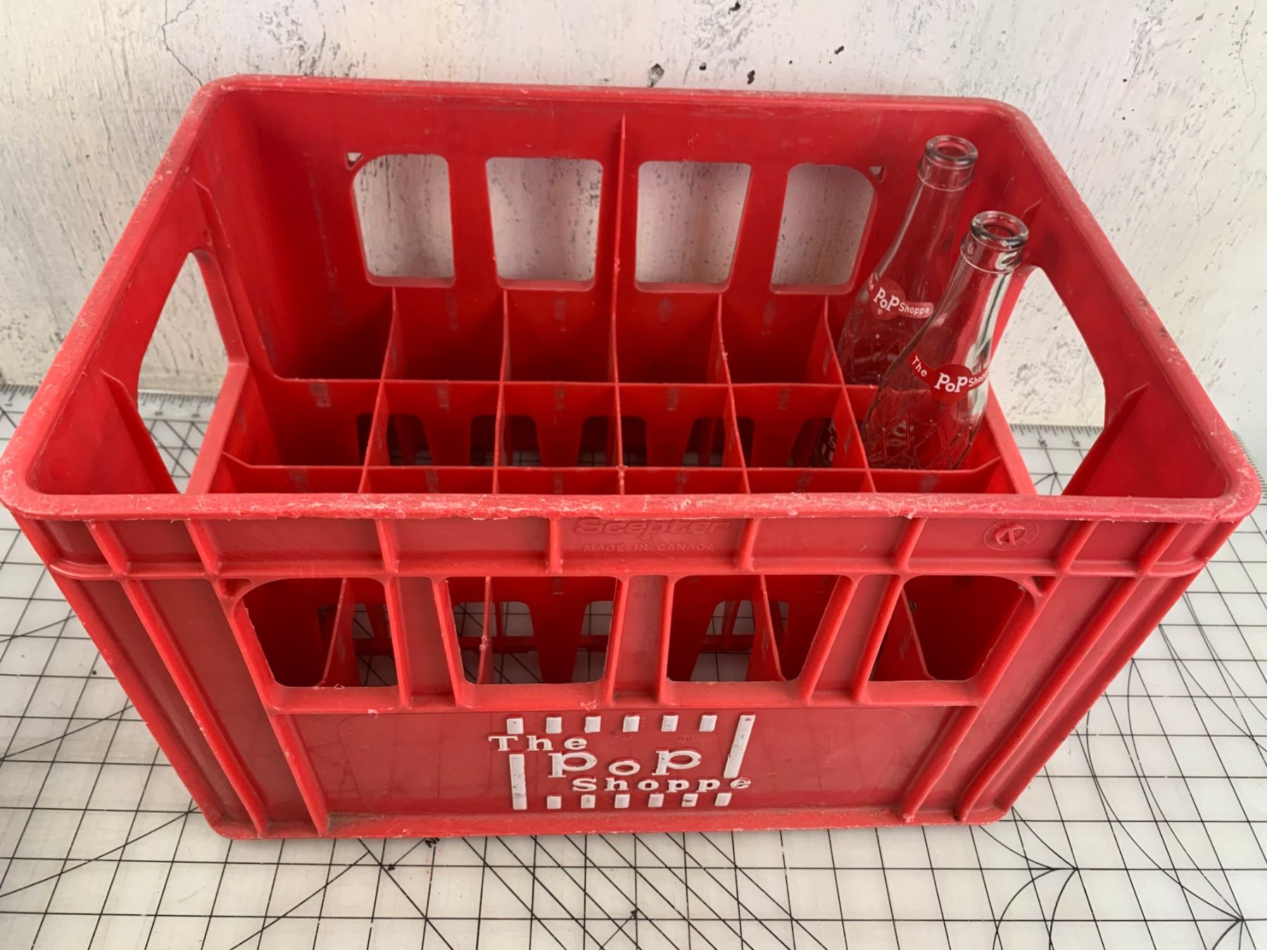POP SHOP PLASTIC CRATE AND 2 BOTTLES