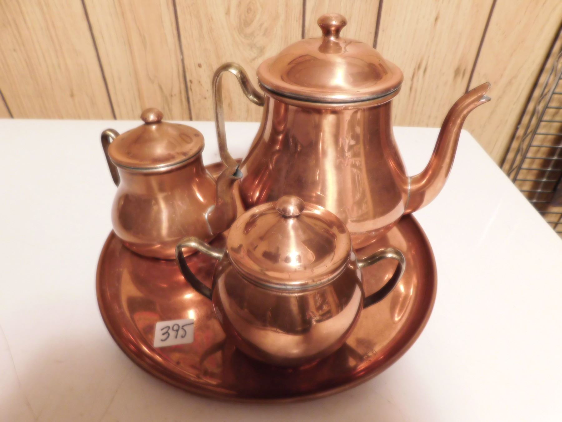 PORTUGAL SOLID COPPER TEA POT CREAM & SUGAR & TRAY