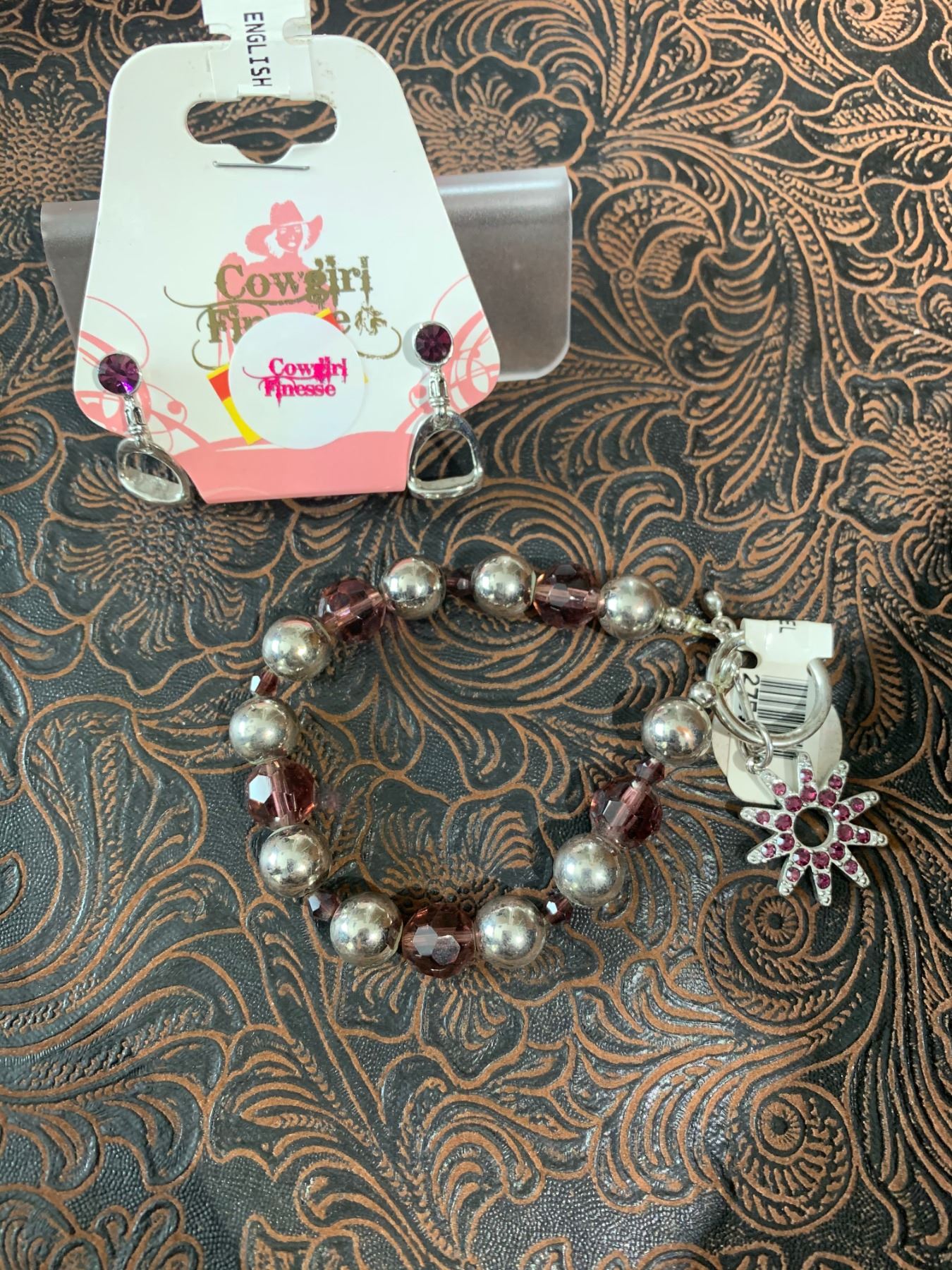 PURPLE ENGLISH STIRRUP EARRING /PURPLE STONE SPUR ROWEL BRACELET/NICKEL FREE
