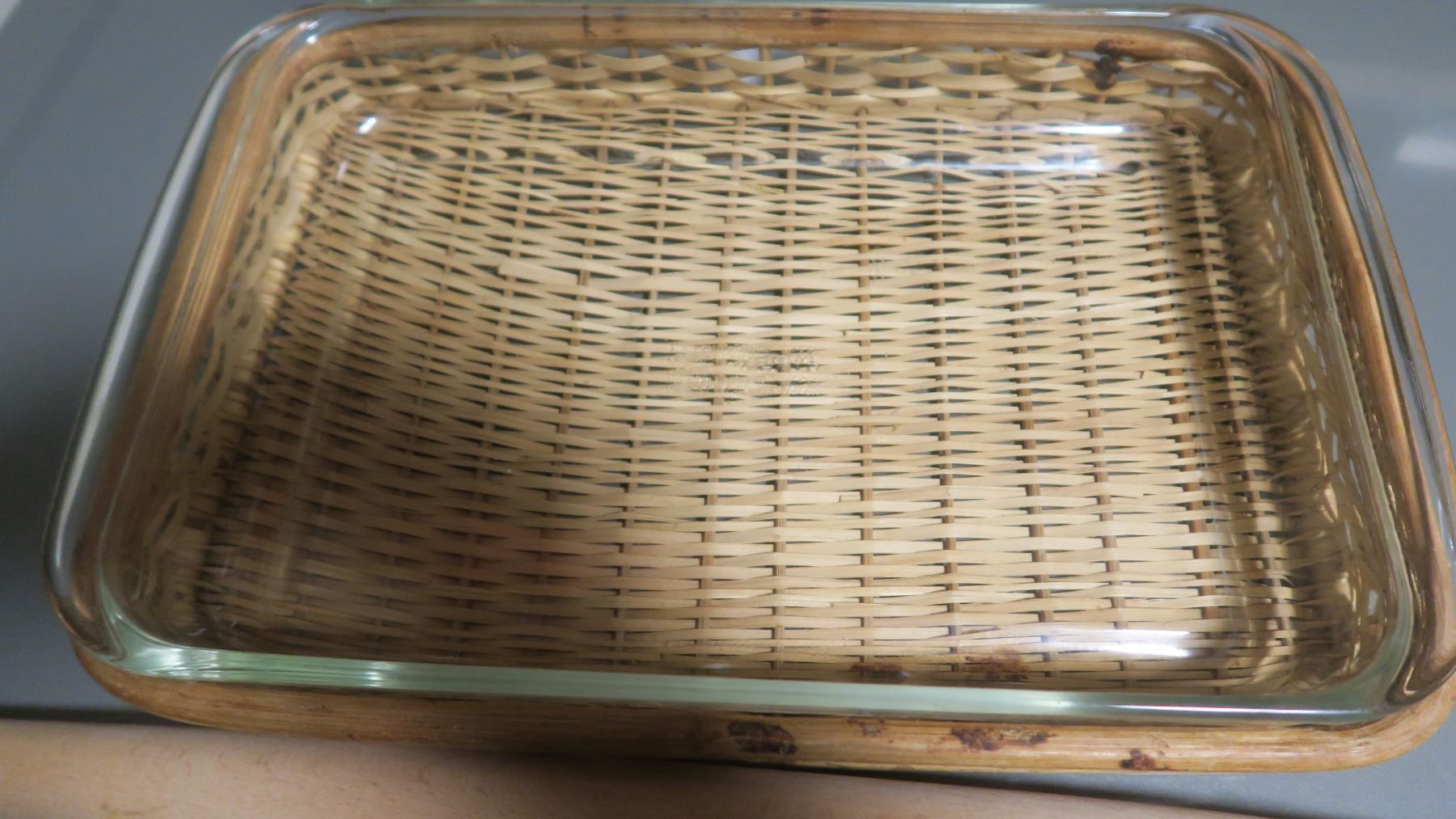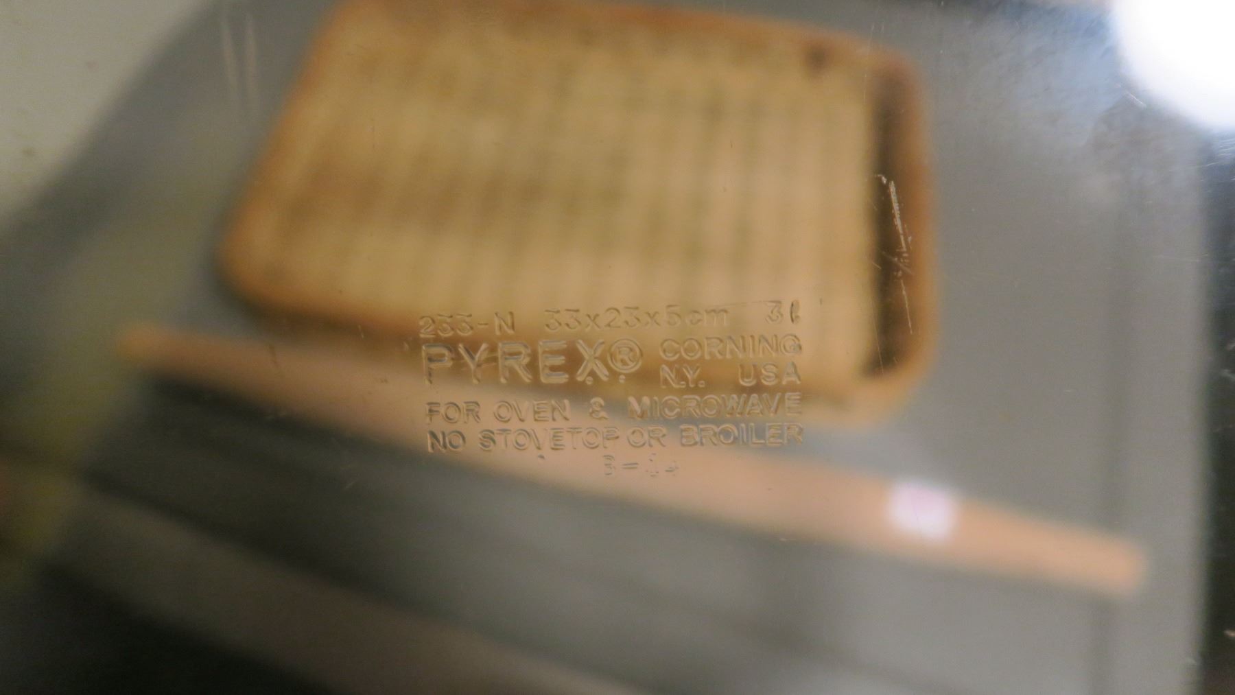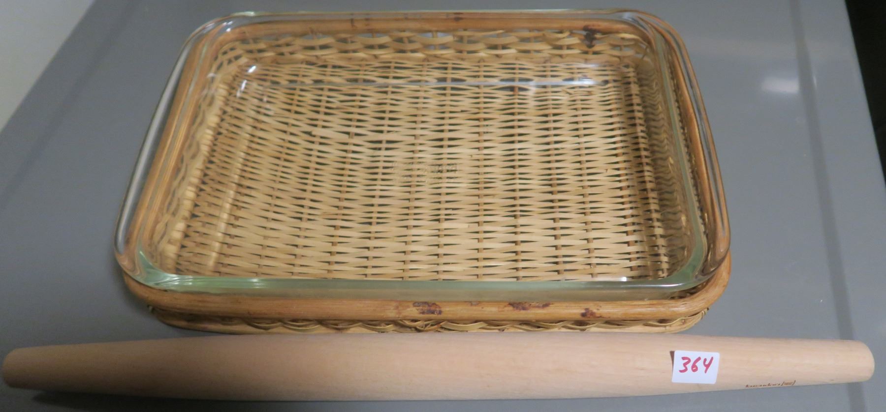 PYREX 9x13 pan + wooden cross-hatched holder + wooden rolling pin