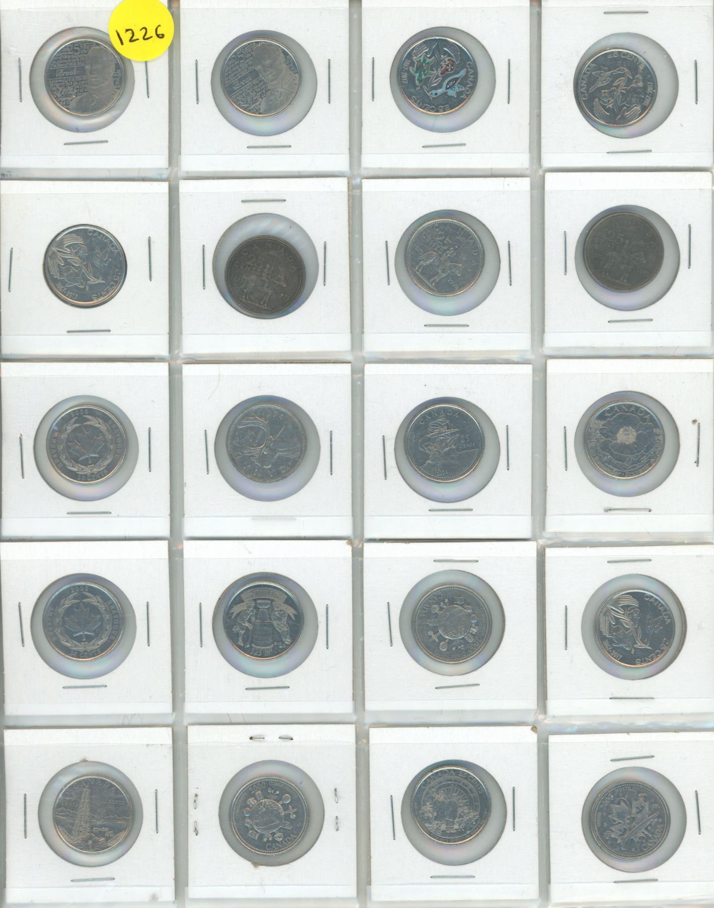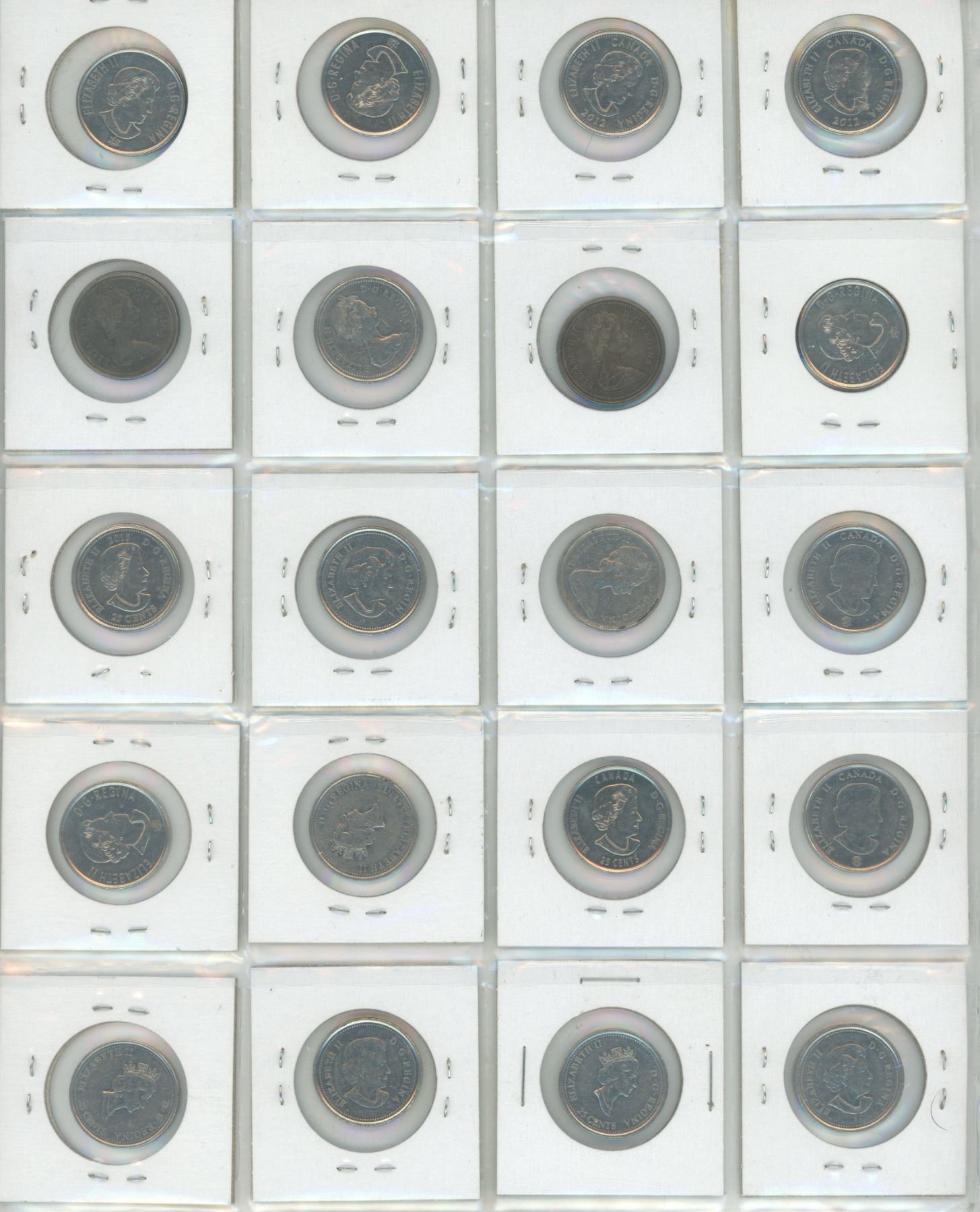 Page of different canadian 25 cents coins(total 20 coins)