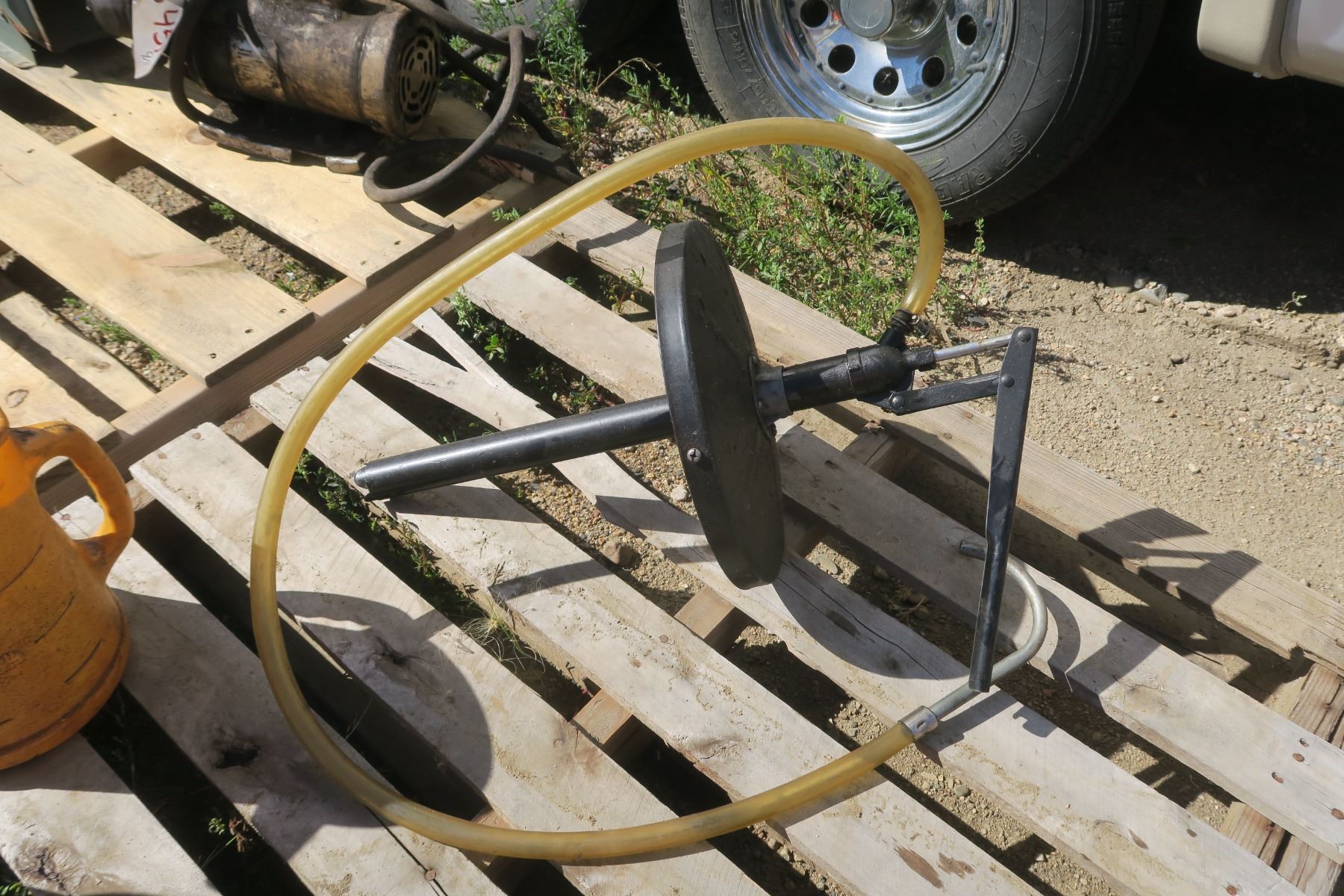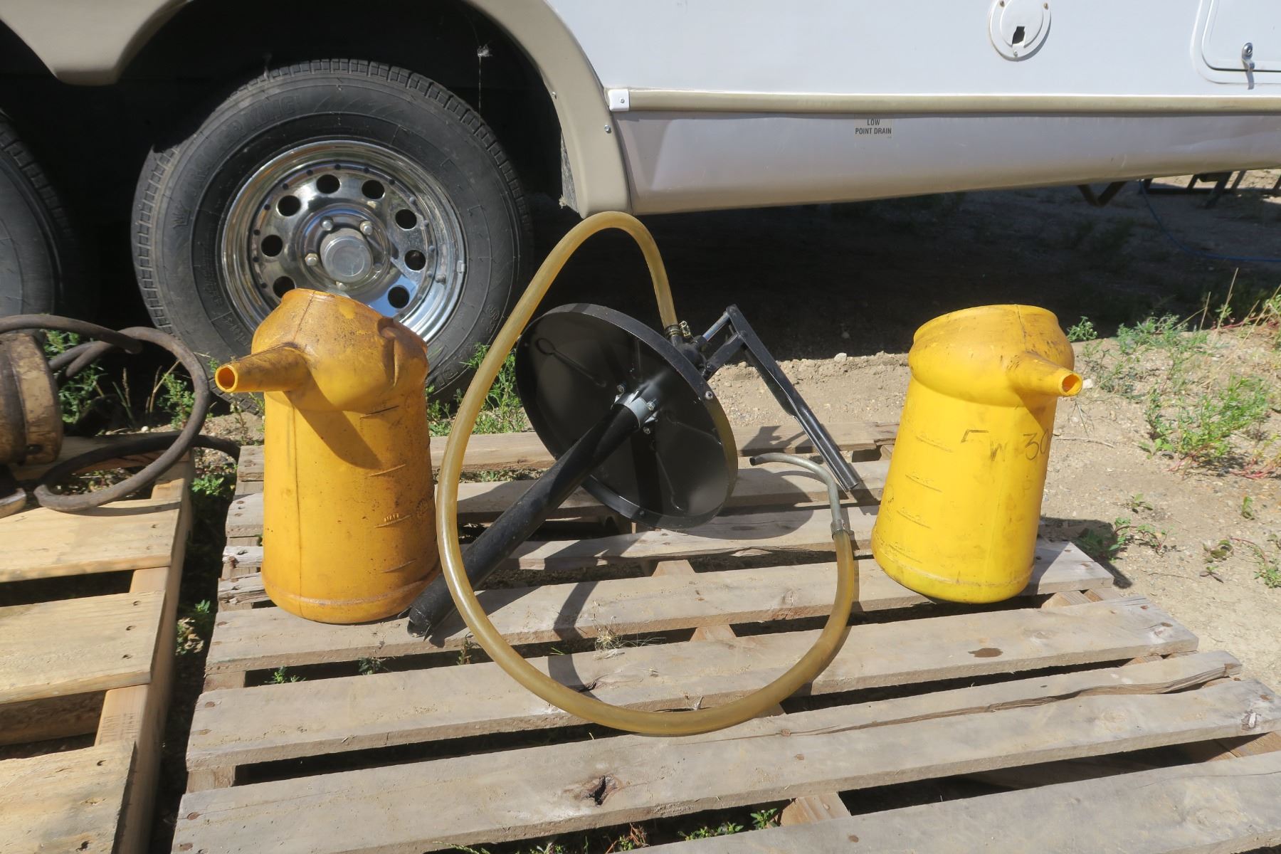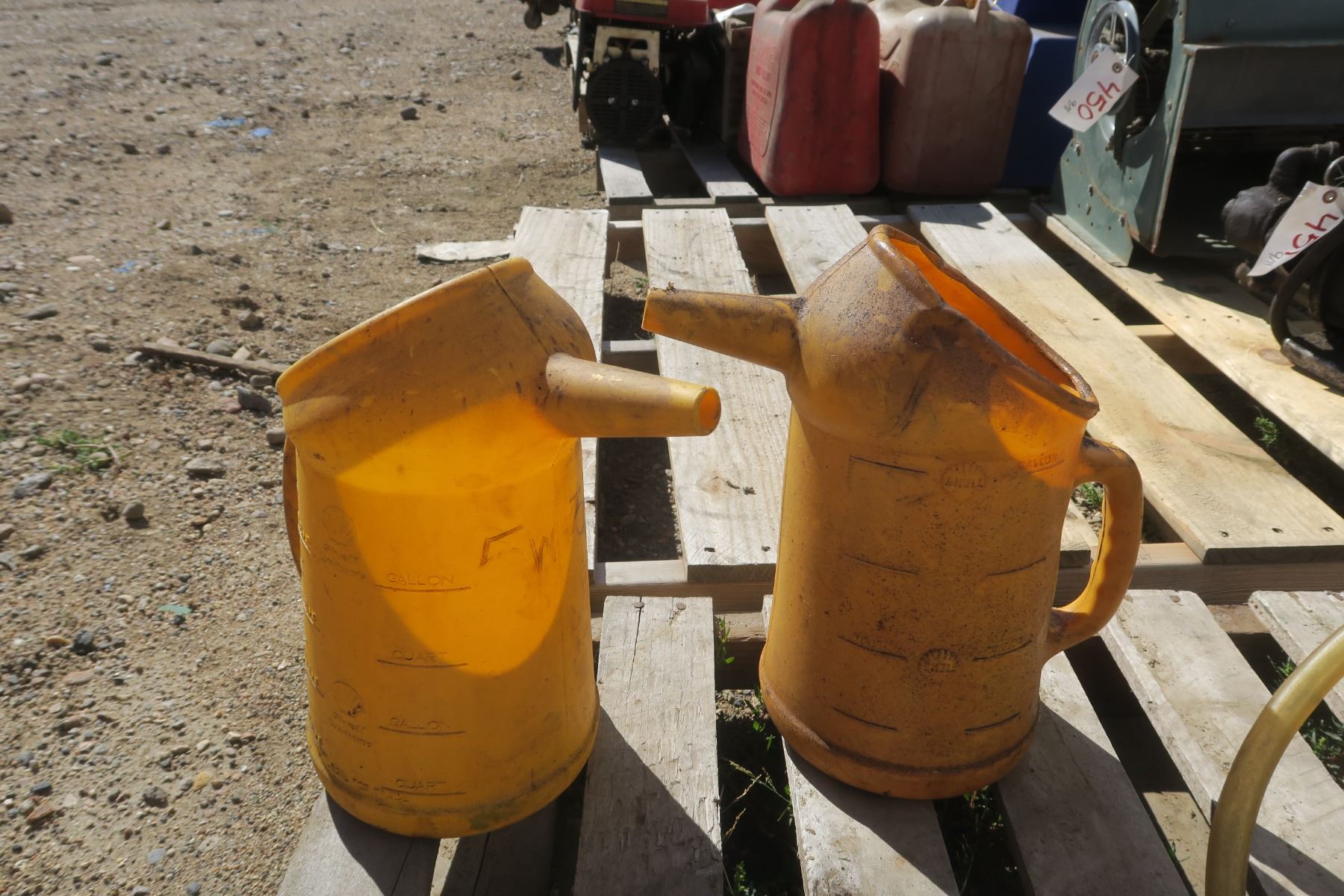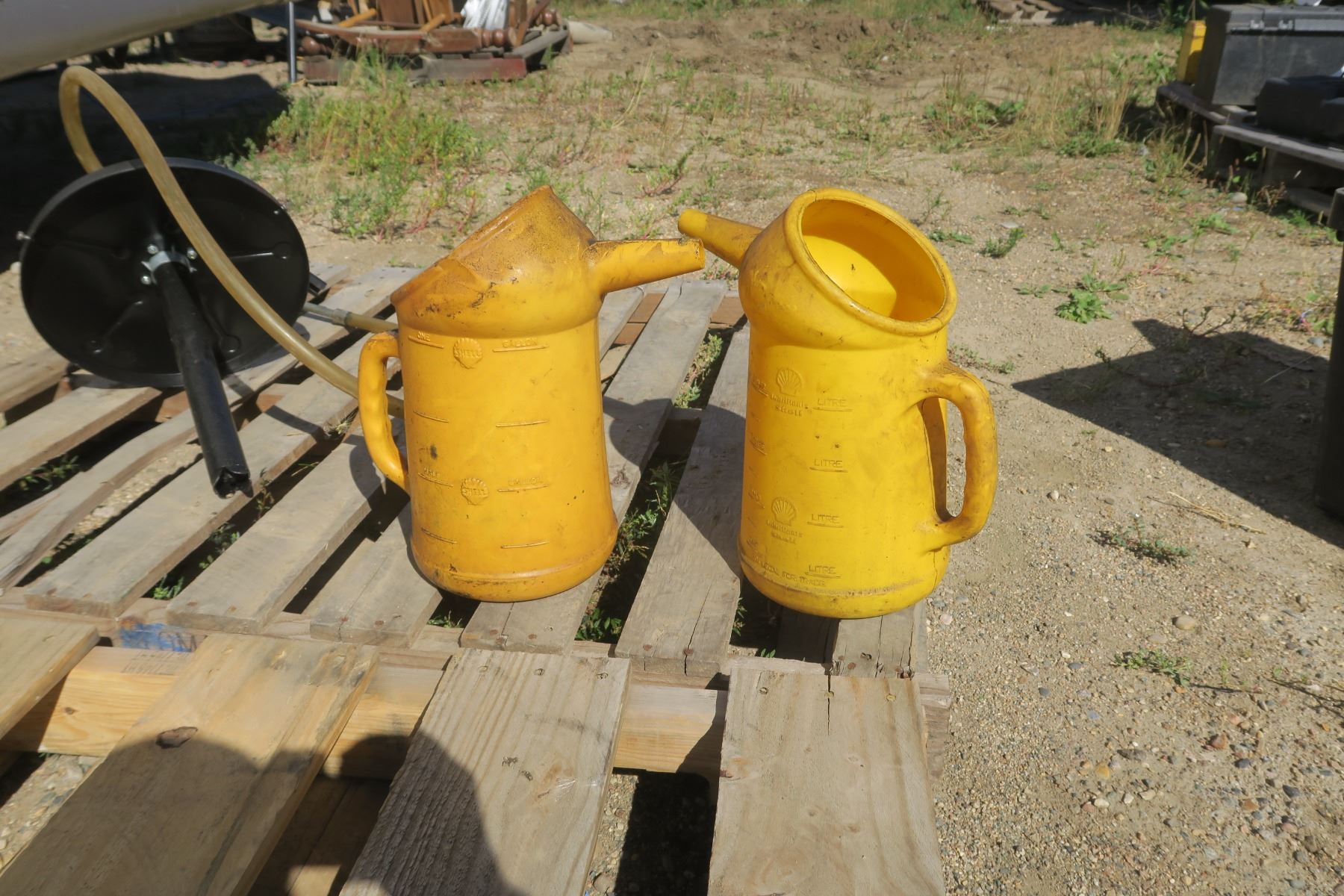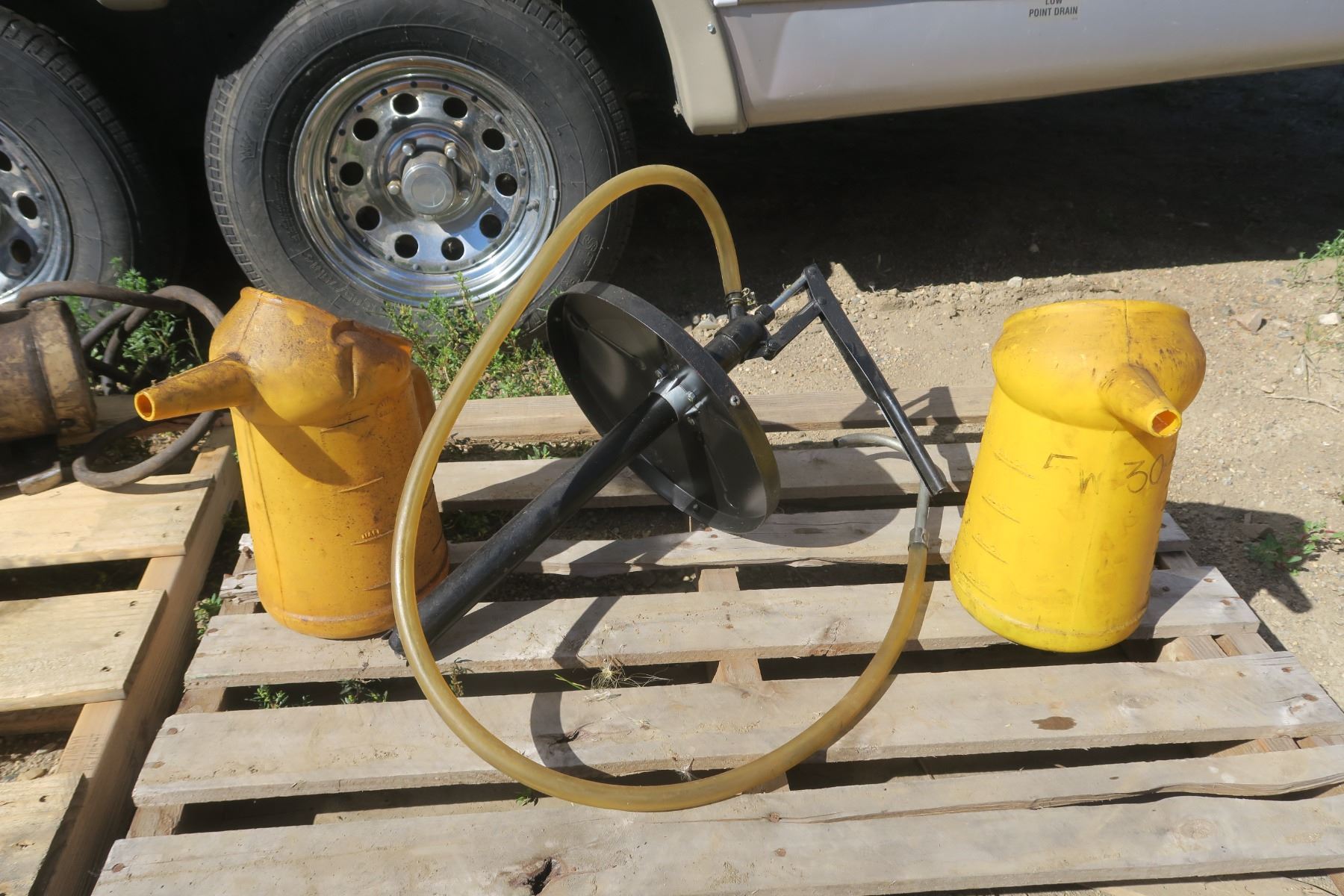 Pail Pump & 2 Shell 6GAL Oil Jugs