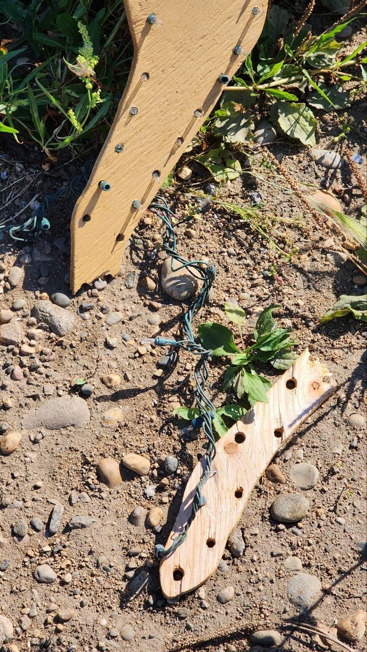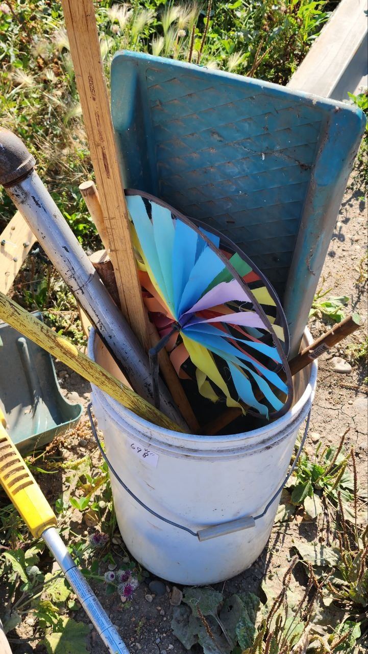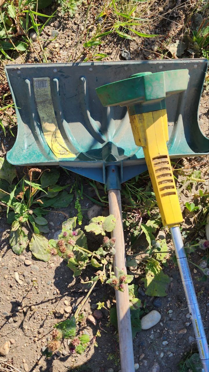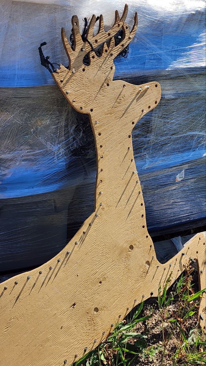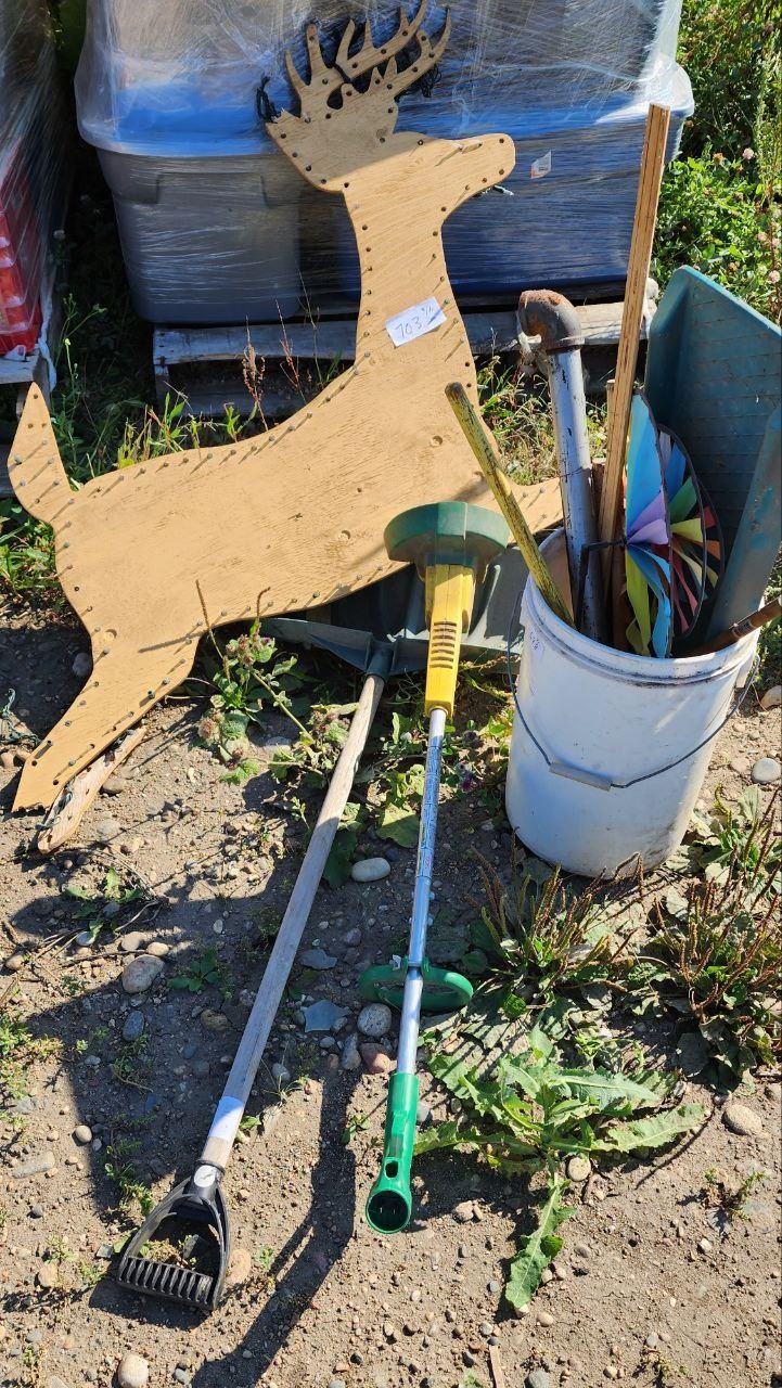 Pail of Assorted Outdoor Hardwares, Christmas Deer, Snow Shovel, Plastic Rain Gutter Downspout, etc.