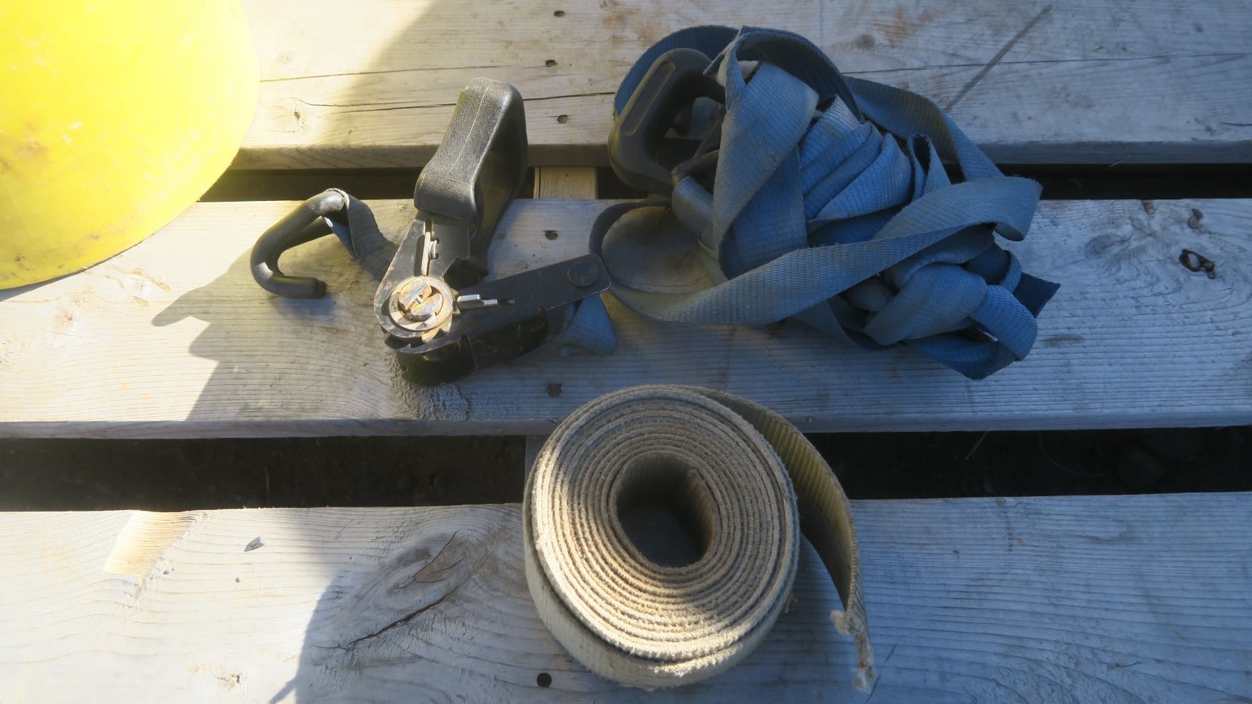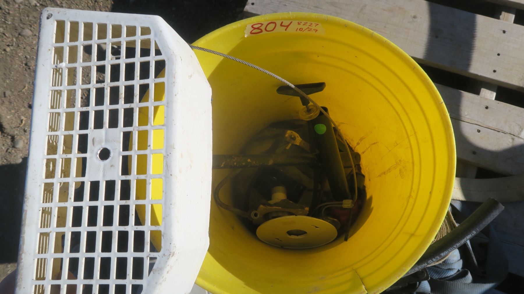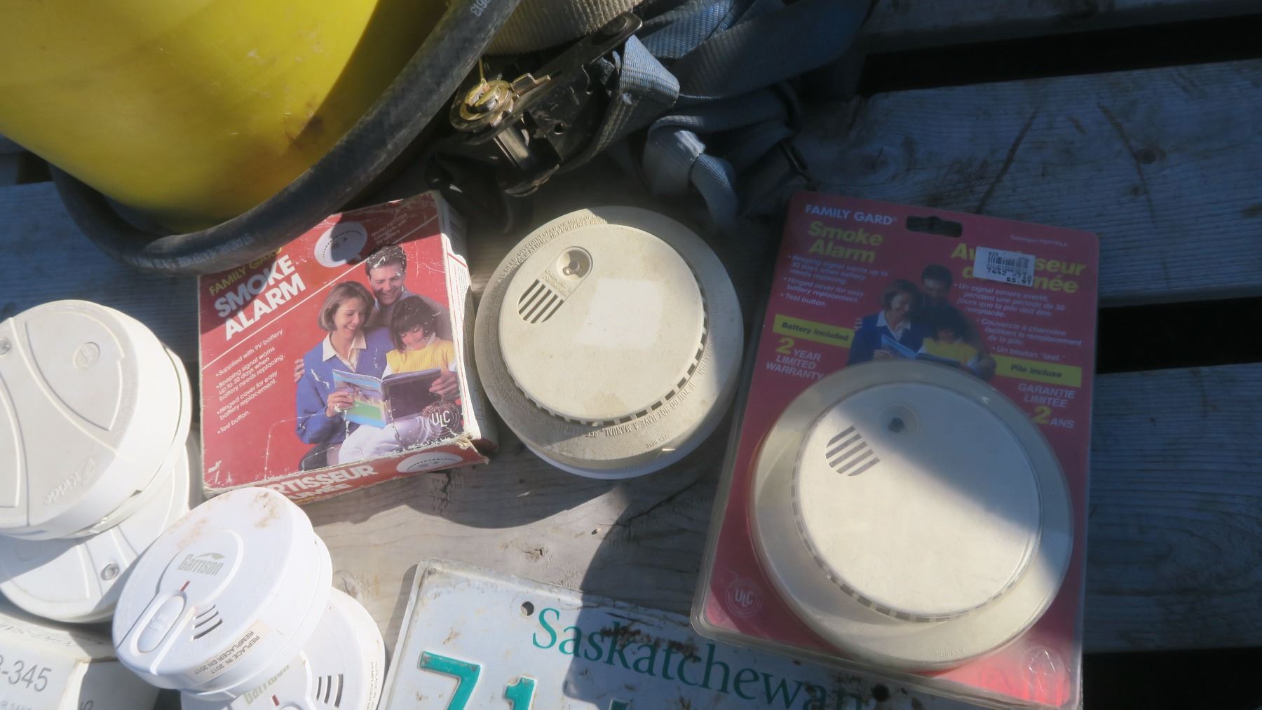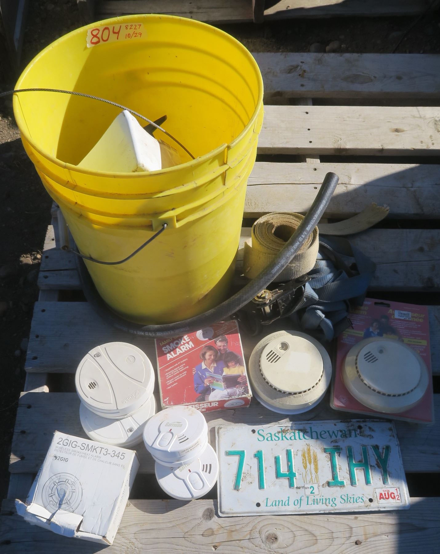 Pail of Smoke Detectors, rachet strap, various supplies