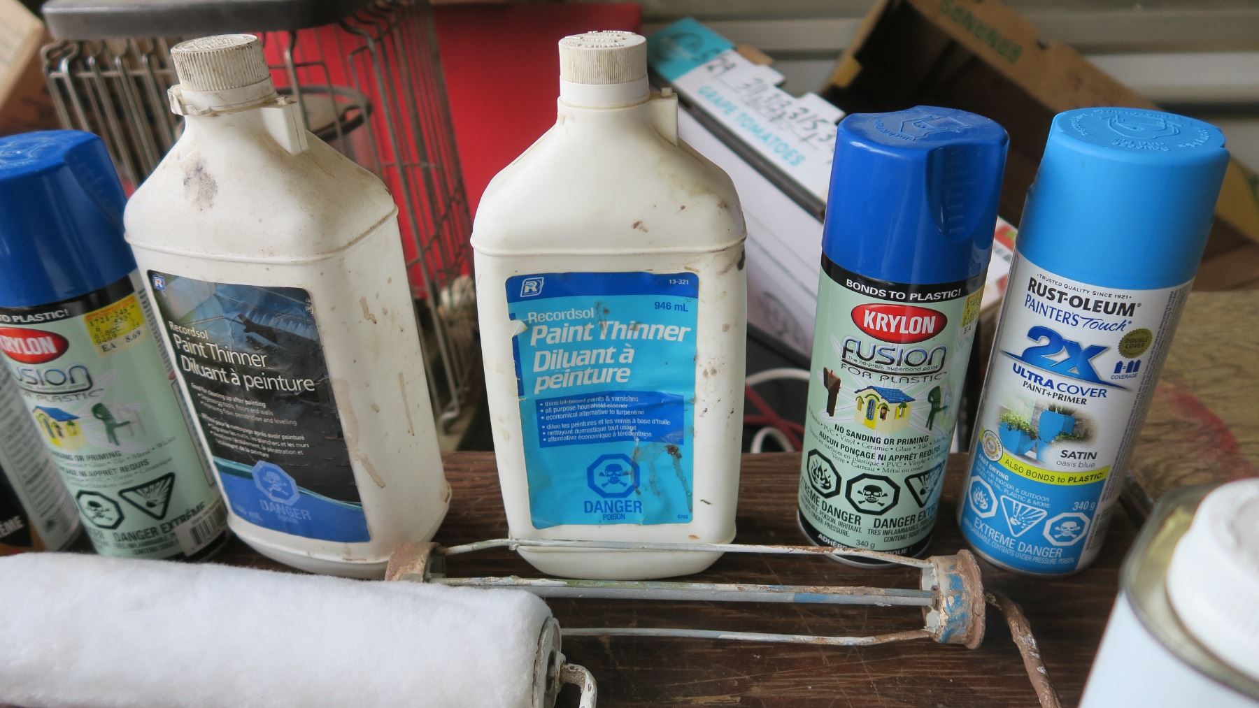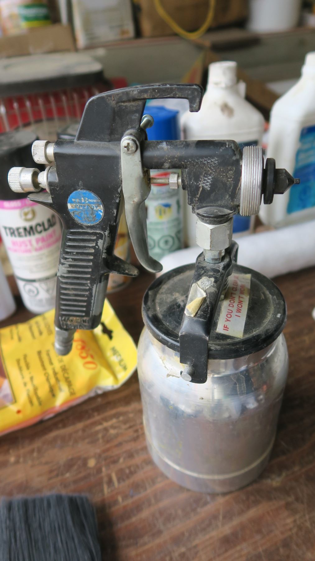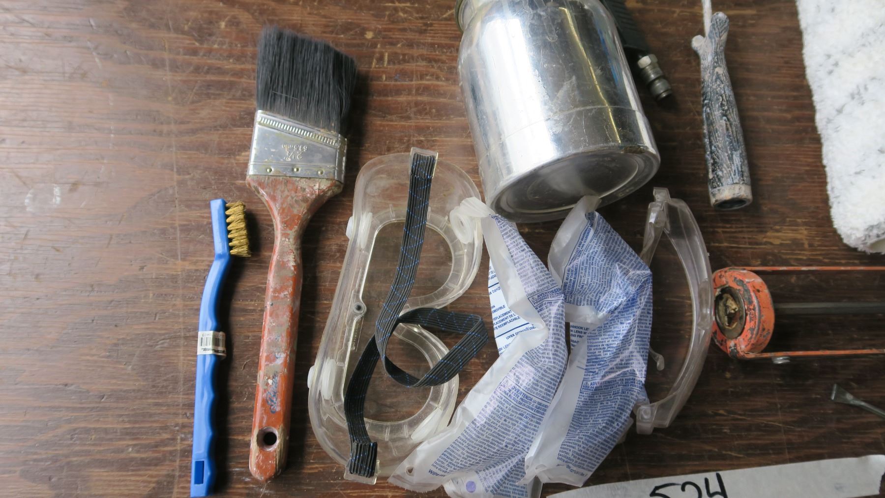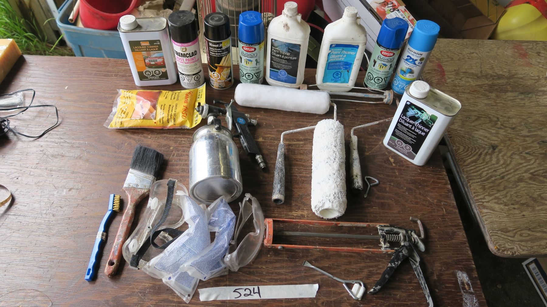 Paint Tools and Supplies- Spray Cans X5, HPLV Spray Gun, Rollers X2, Sleeves, Gloves, Thinner X4, Caulking Gun, Safety Glasses and Wire Brush