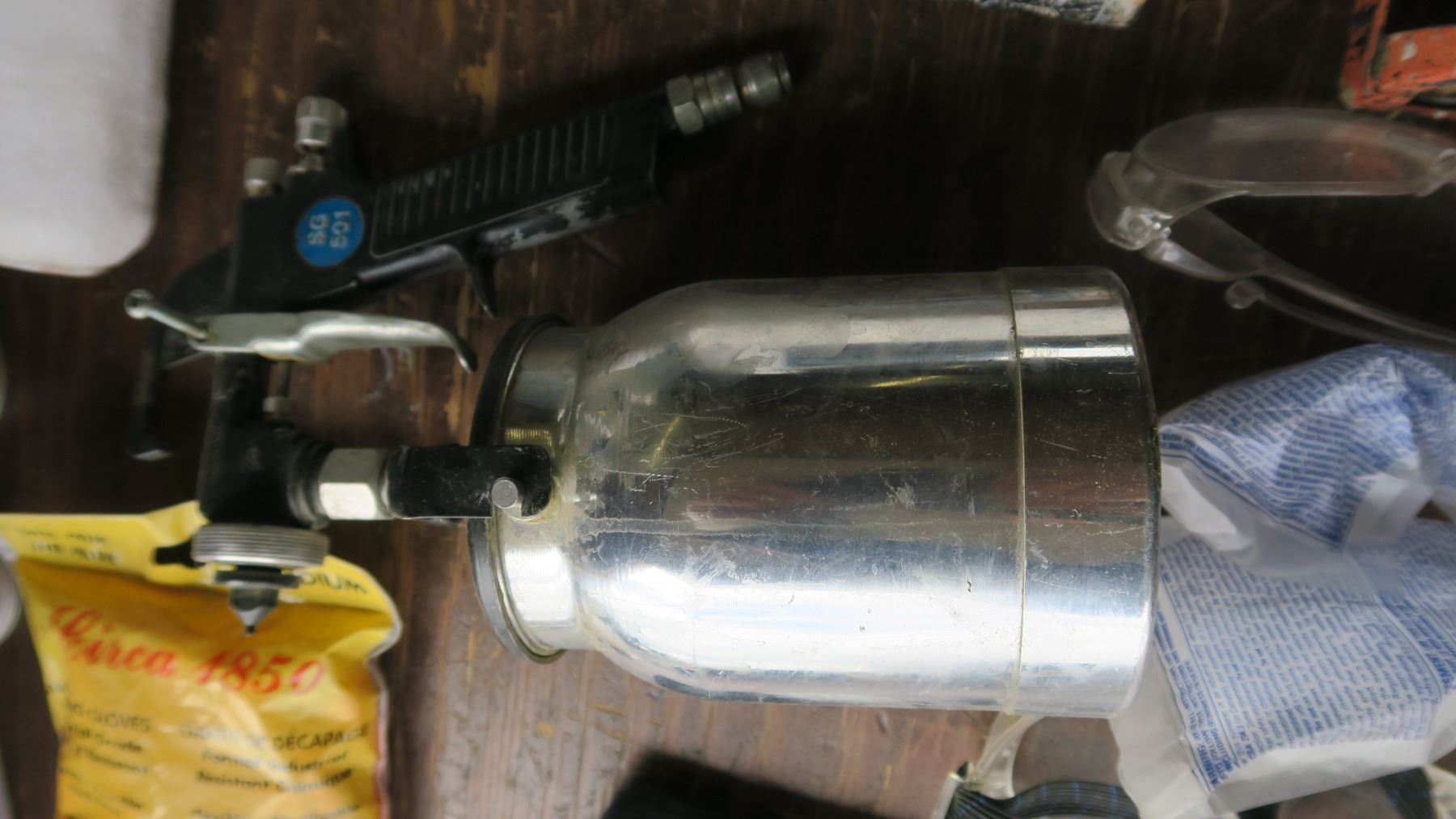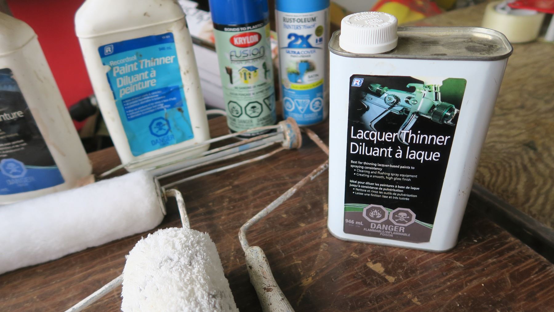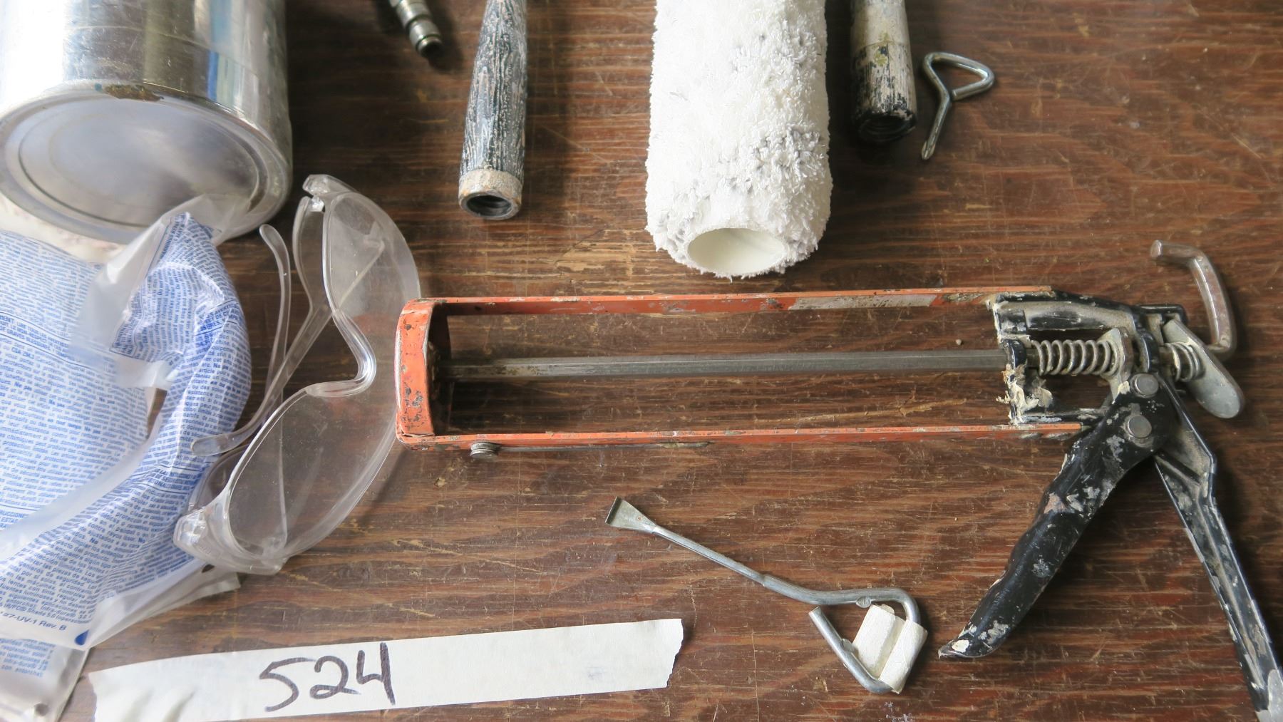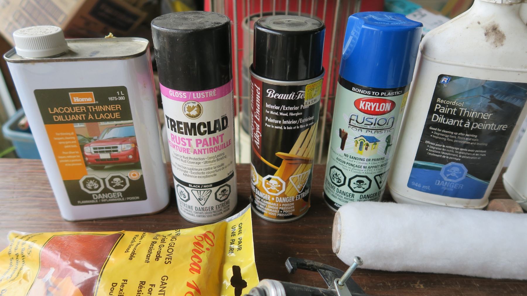 Paint Tools and Supplies- Spray Cans X5, HPLV Spray Gun, Rollers X2, Sleeves, Gloves, Thinner X4, Caulking Gun, Safety Glasses and Wire Brush