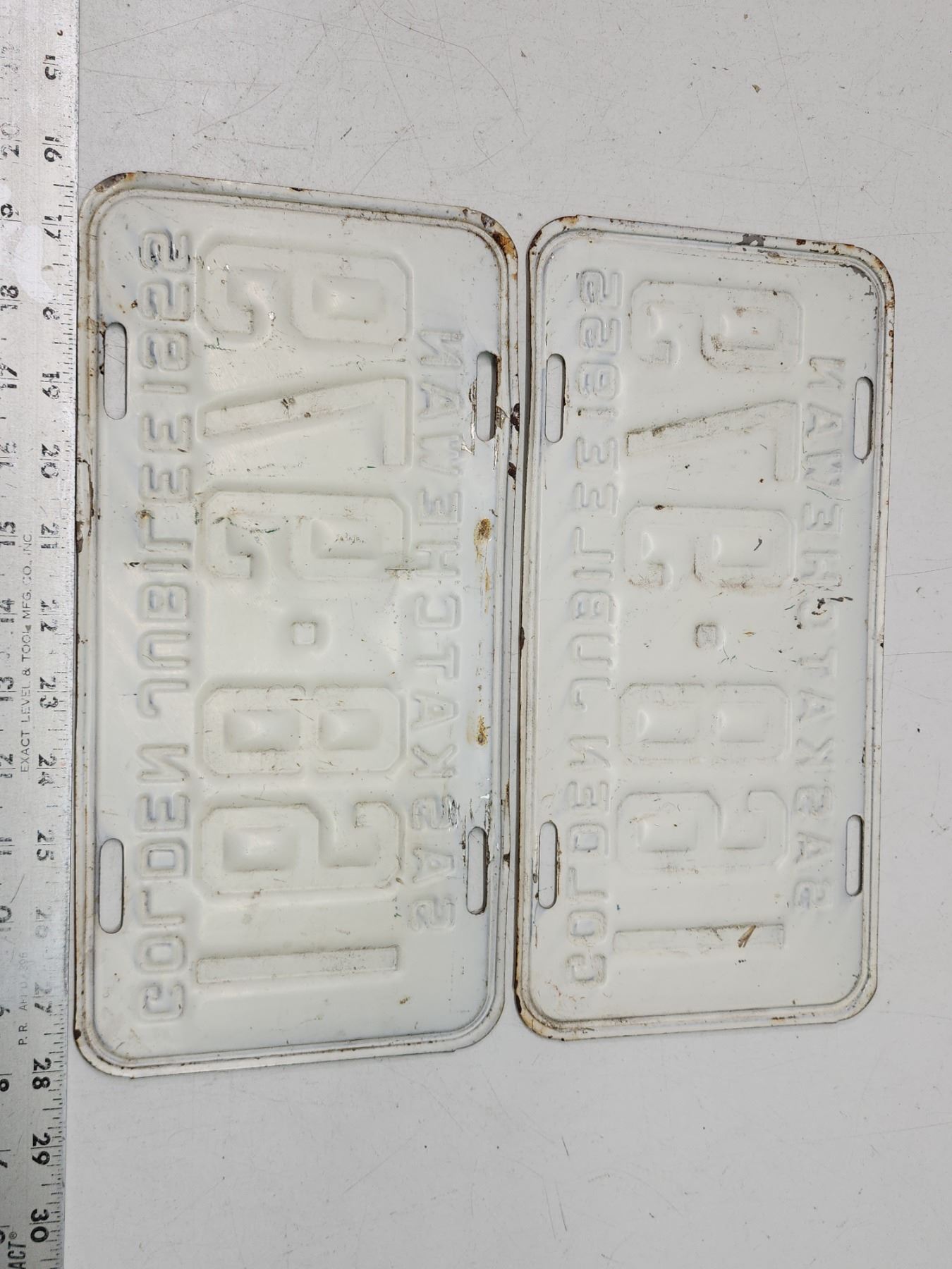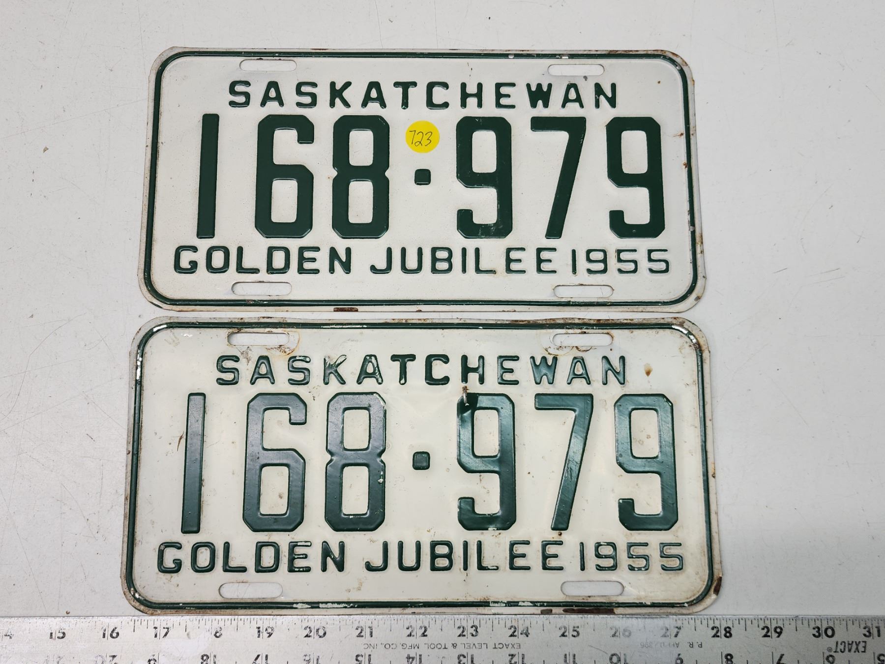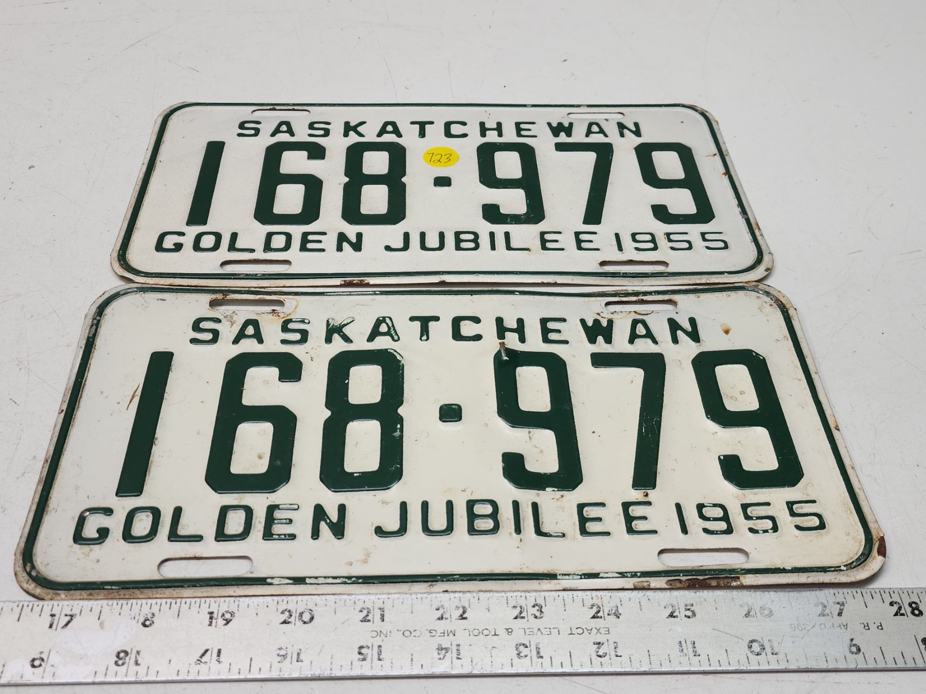 Pair of 1955 Golden Jubilee, Saskatchewan license plates - 168-979