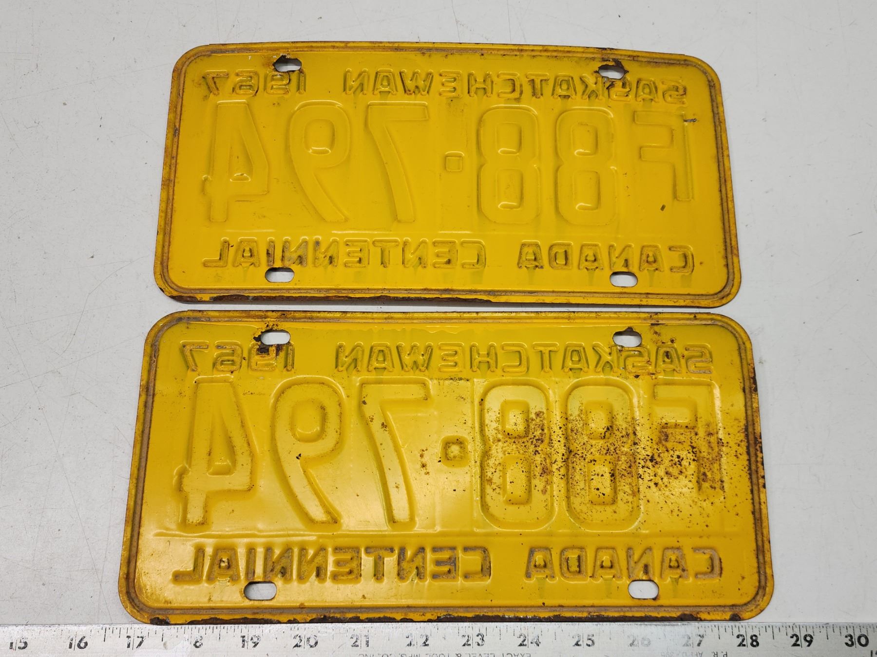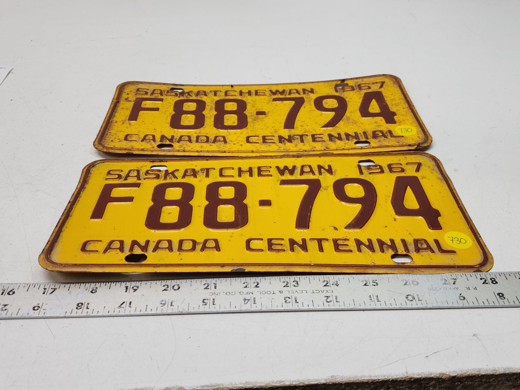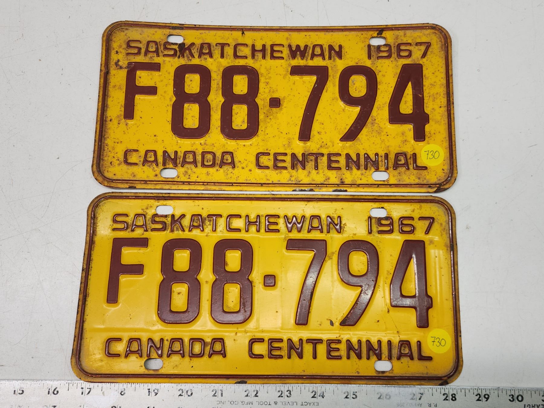Pair of 1967 Centennial, Saskatchewan license plates - F 88-794