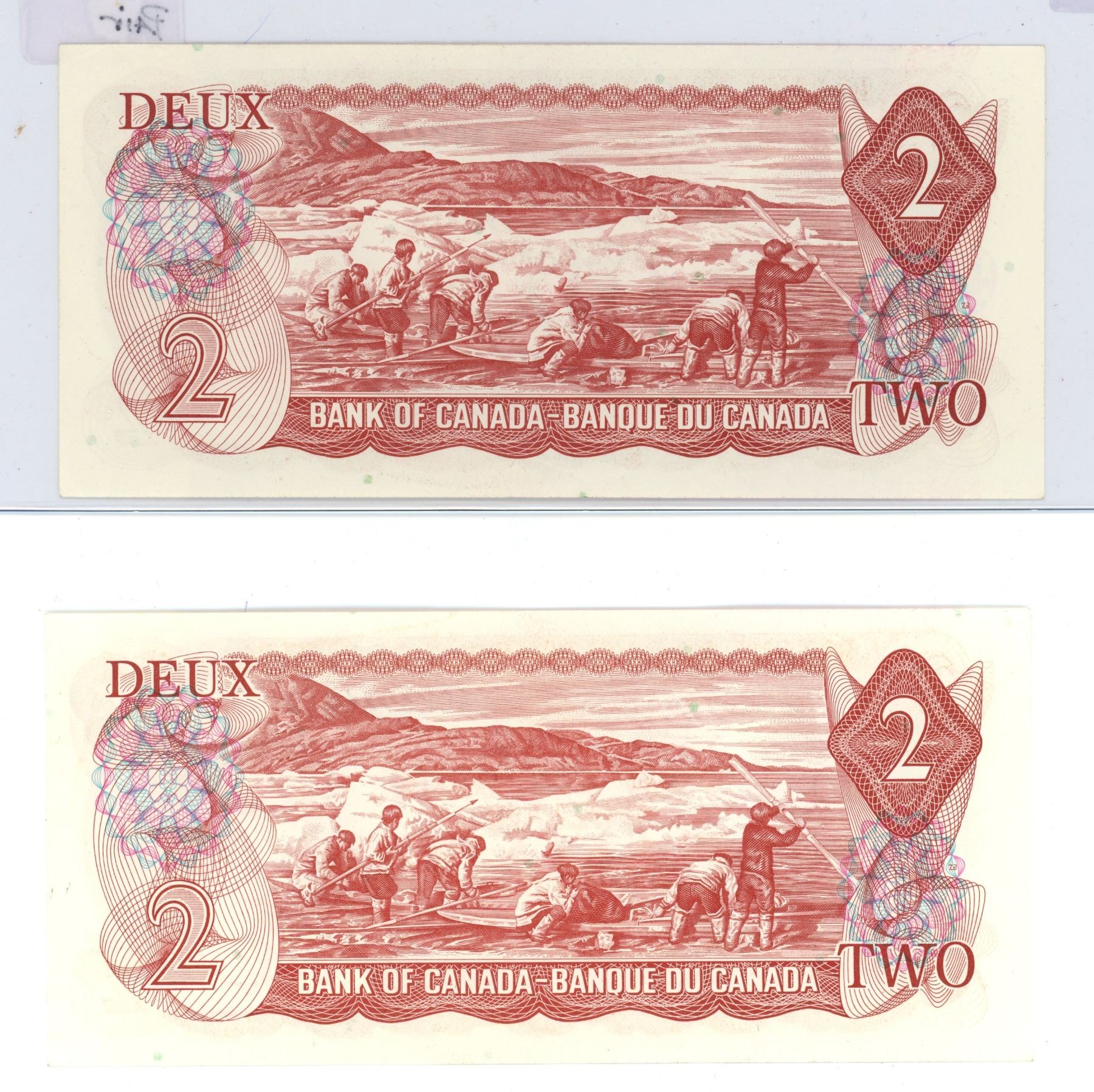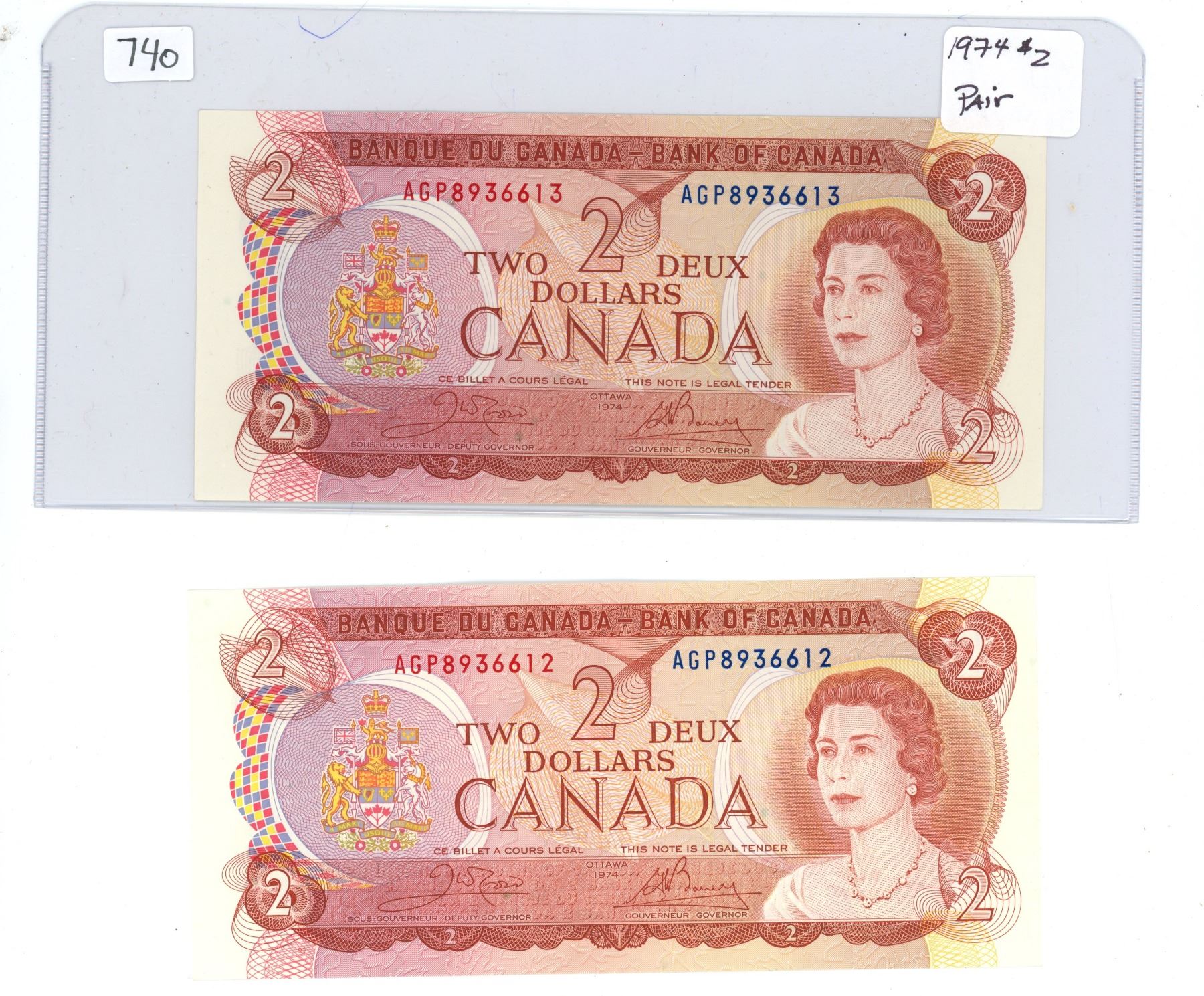 Pair of 1974 UNC canada $2 bills, crow/Bouey (#AGP 8936612-613)