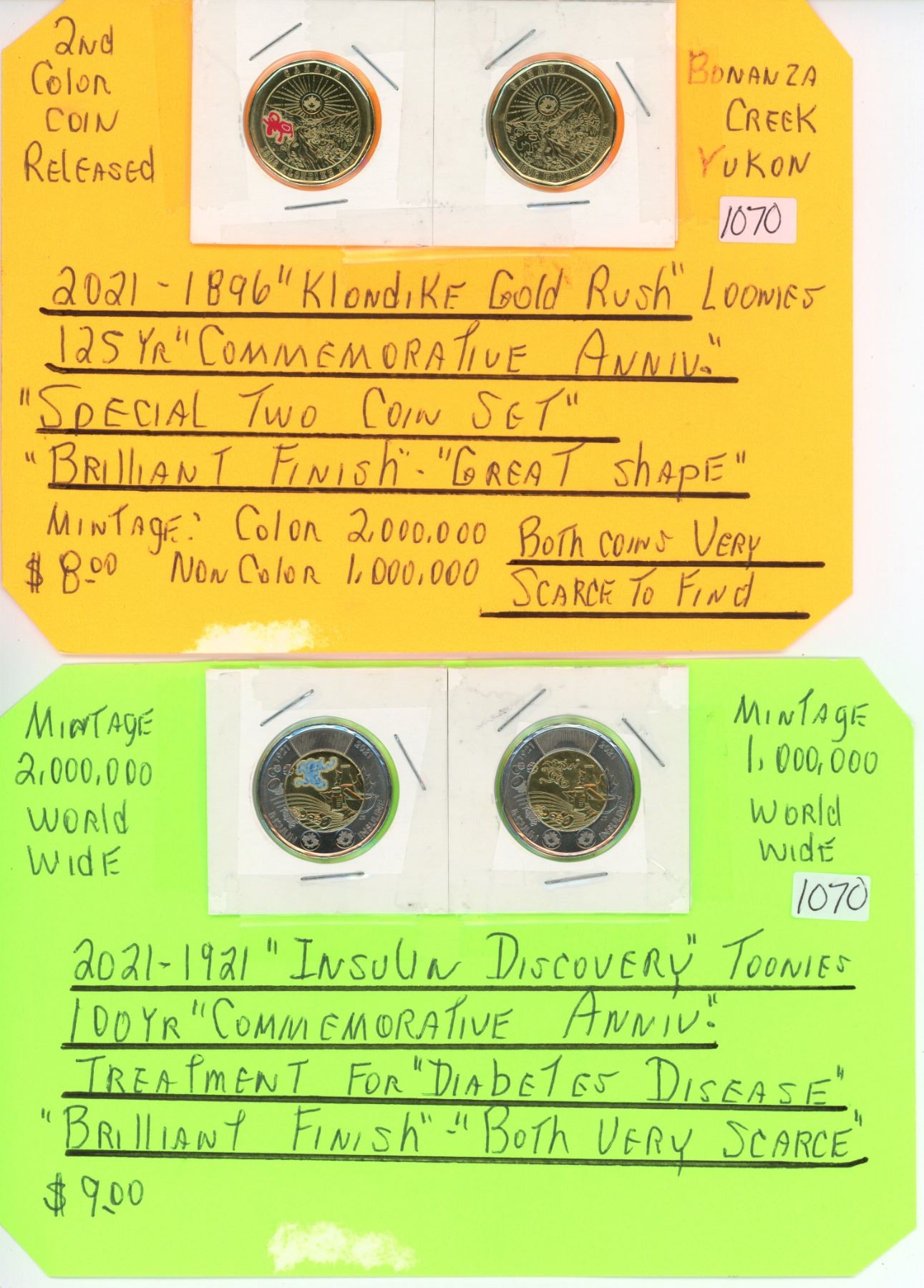Pair of 2021 "Klondike" loonies (Canadian 1 dollars) & Pair of 2021 "Insulin" toonies (Canadian 2 dollars)
