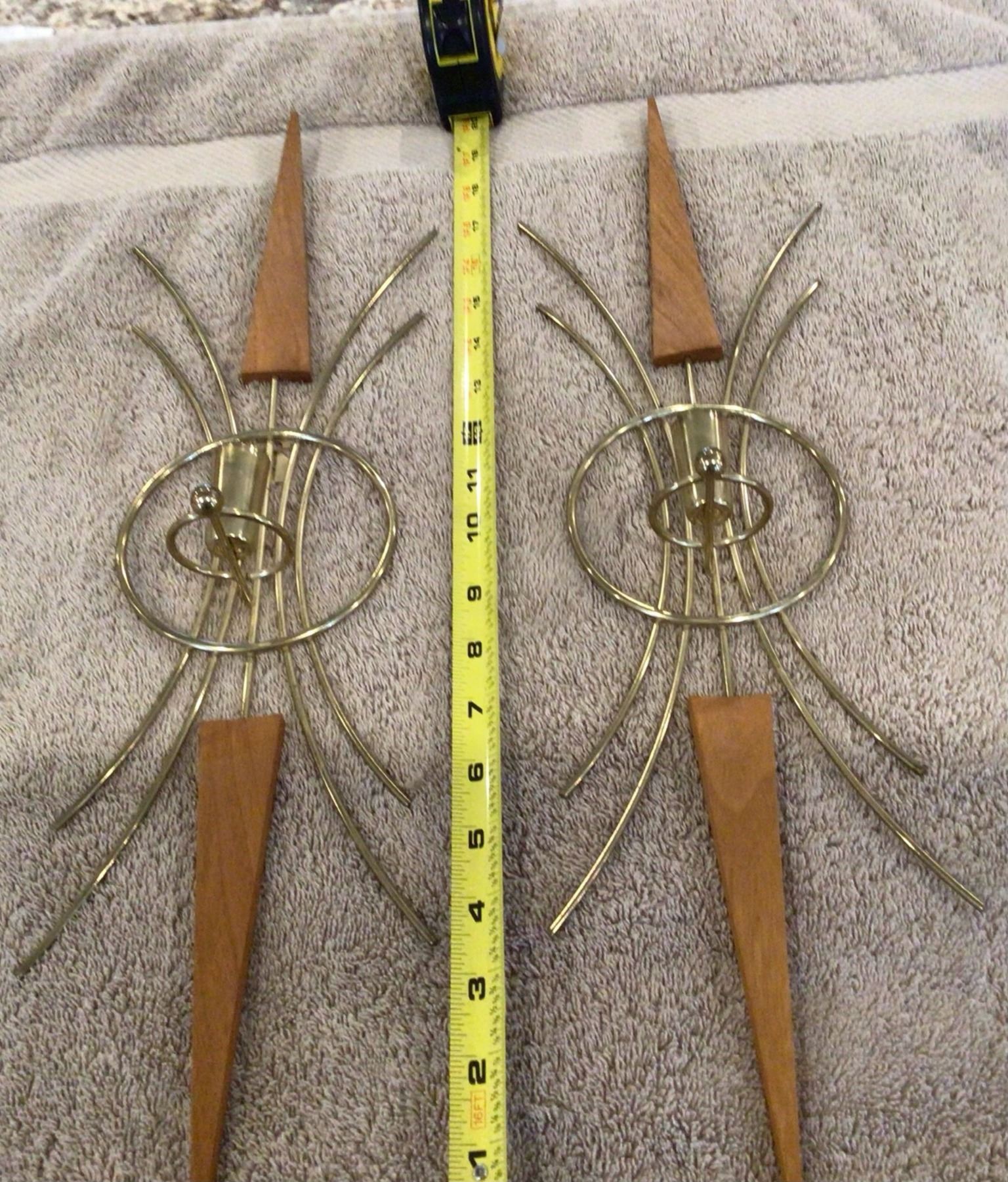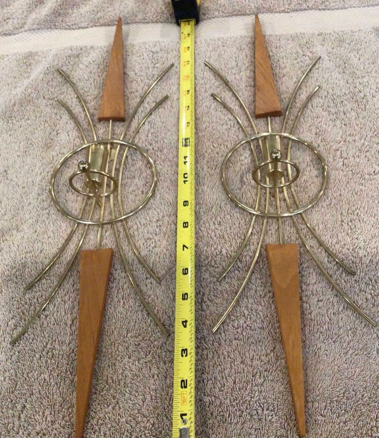 Pair of MCM Atomic Era teak and brass wall sconce candle holders. 19" high. Vintage