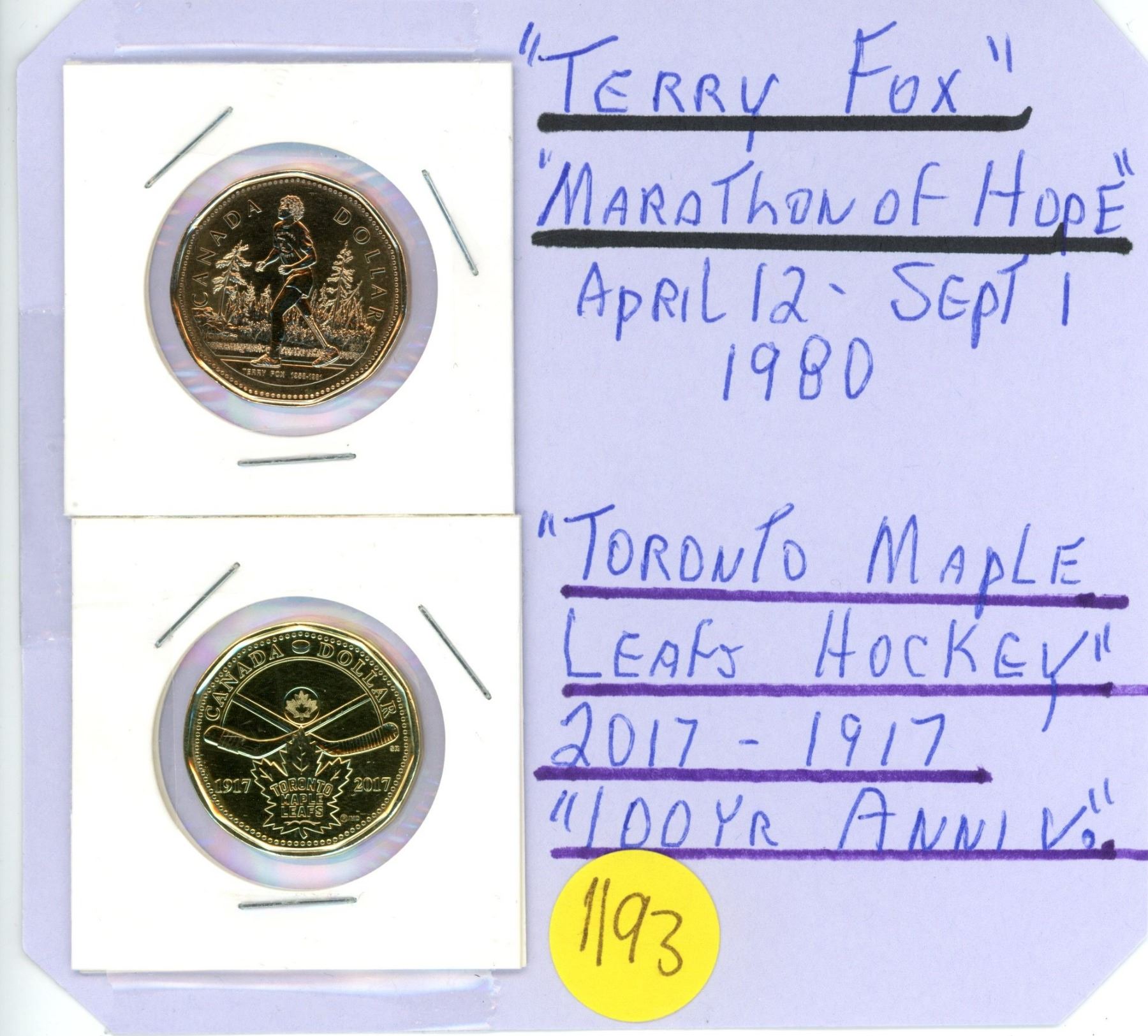 Pair of collectible Canadian $1.00 loonies - Terry Fox marathon of hope & Toronto Maple Leafs hockey 100 yr ann.