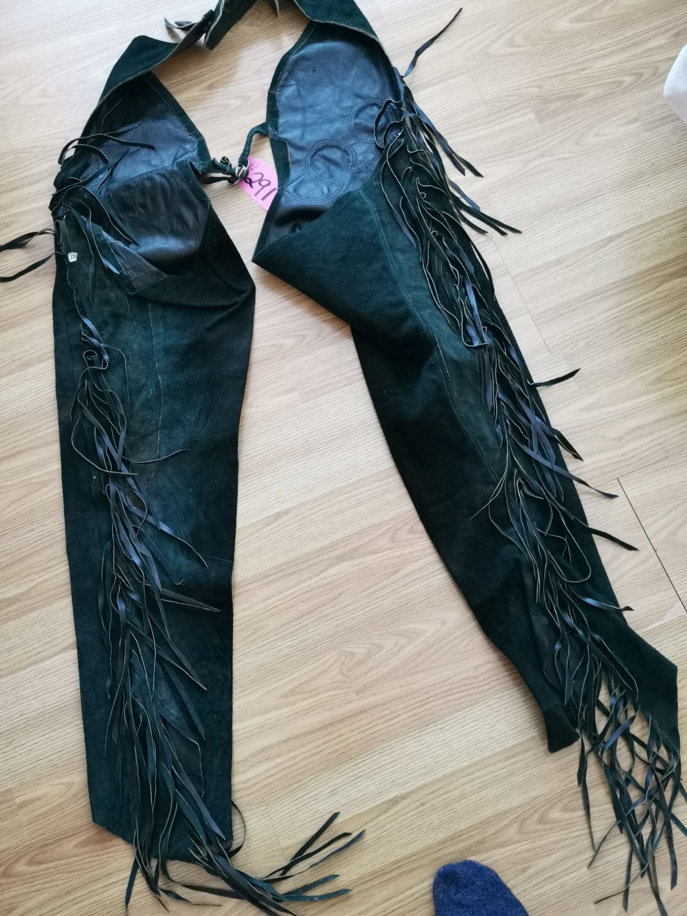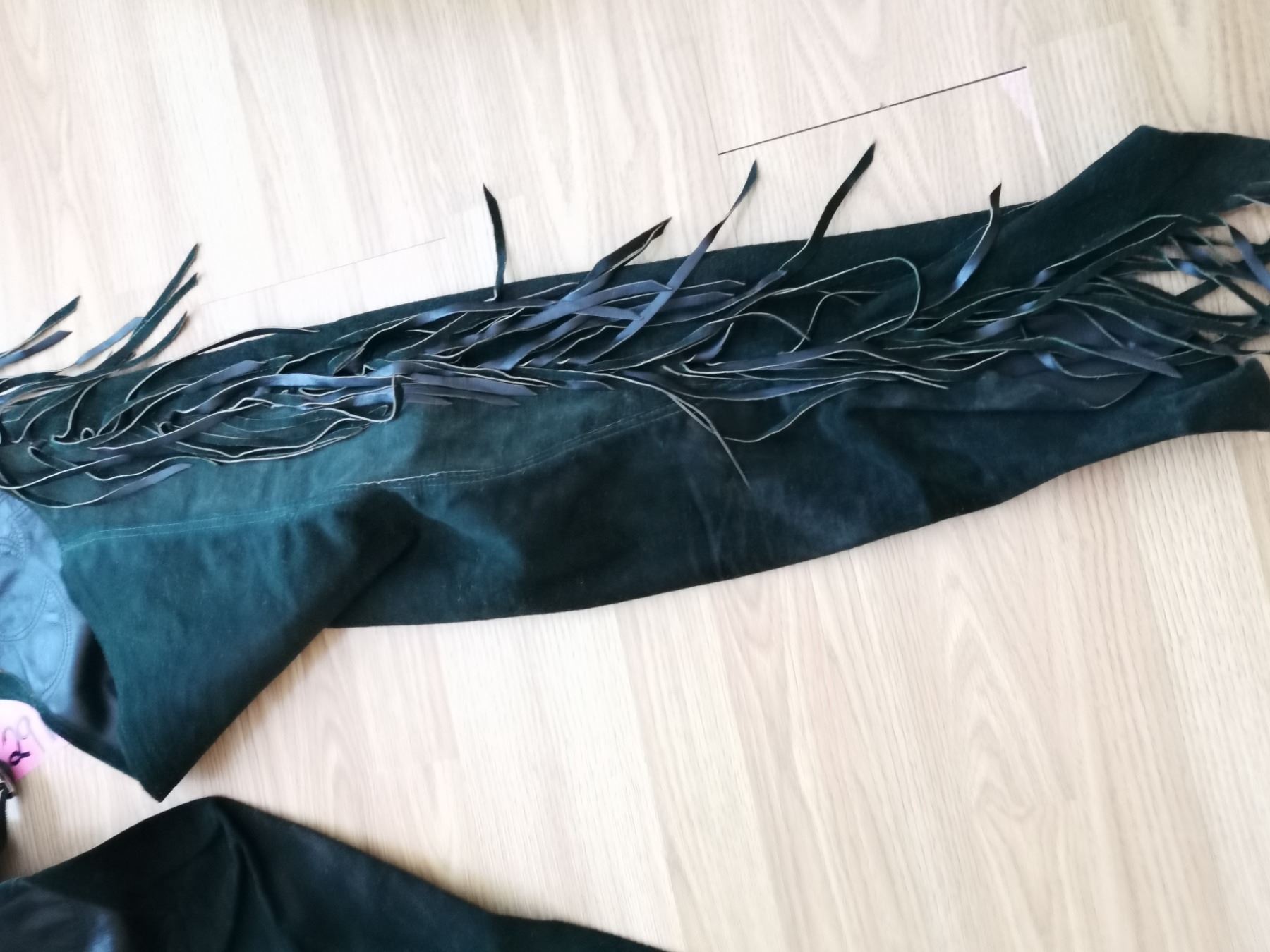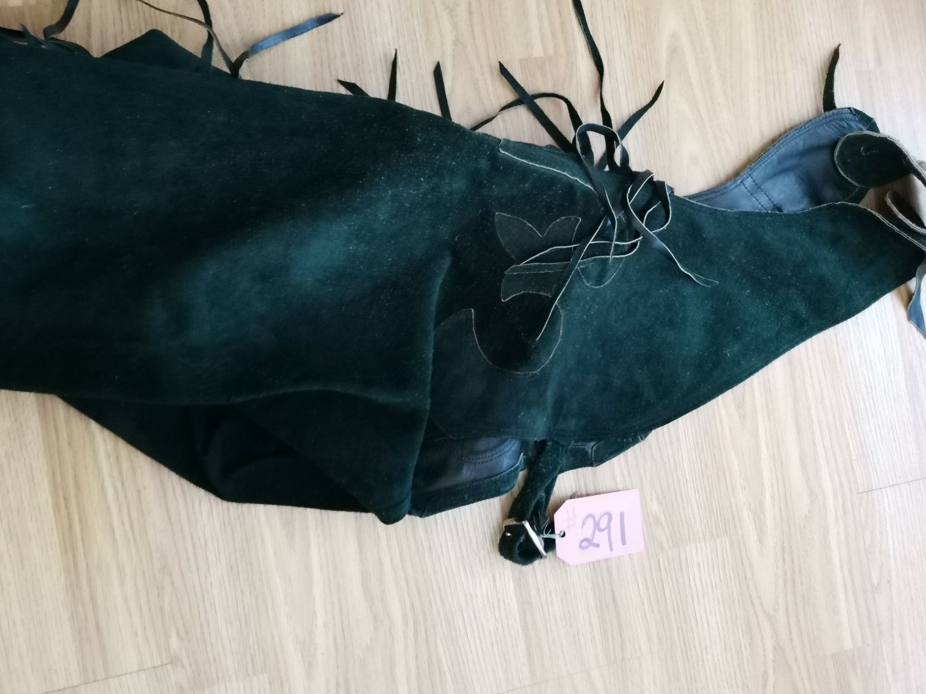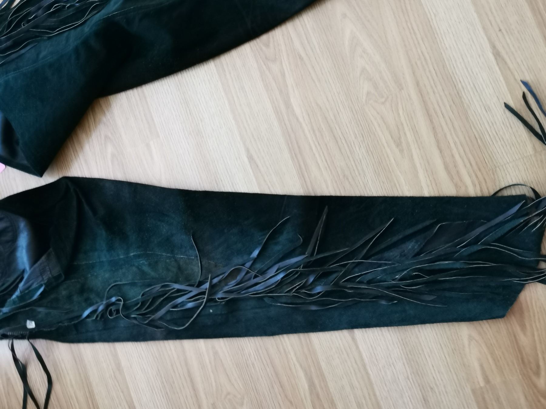 Pair of green leather fringed chaps
