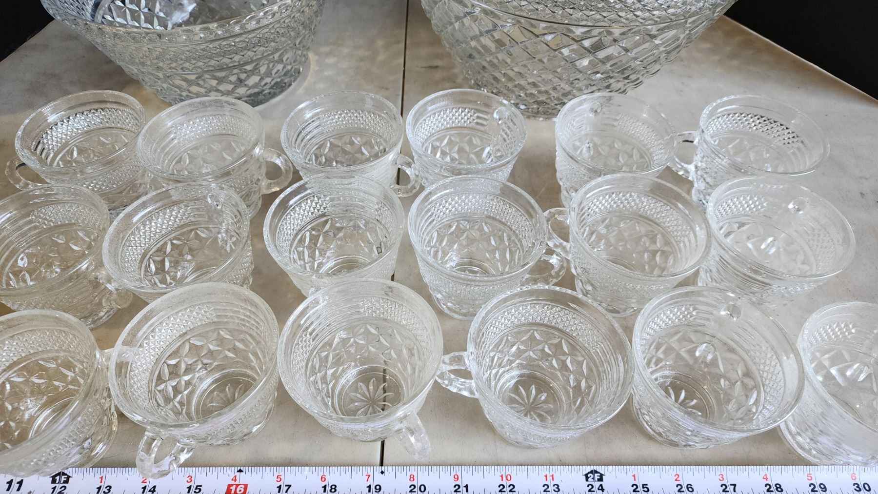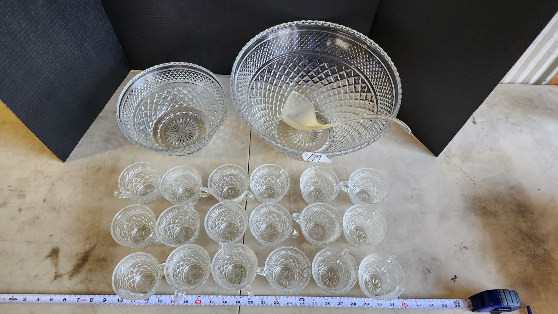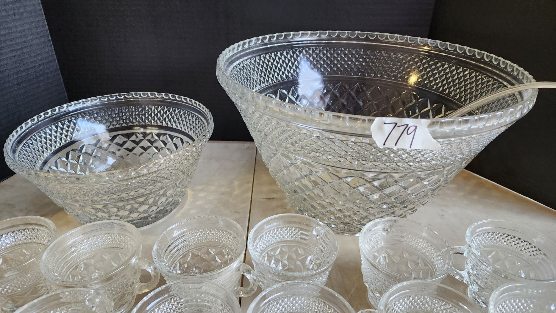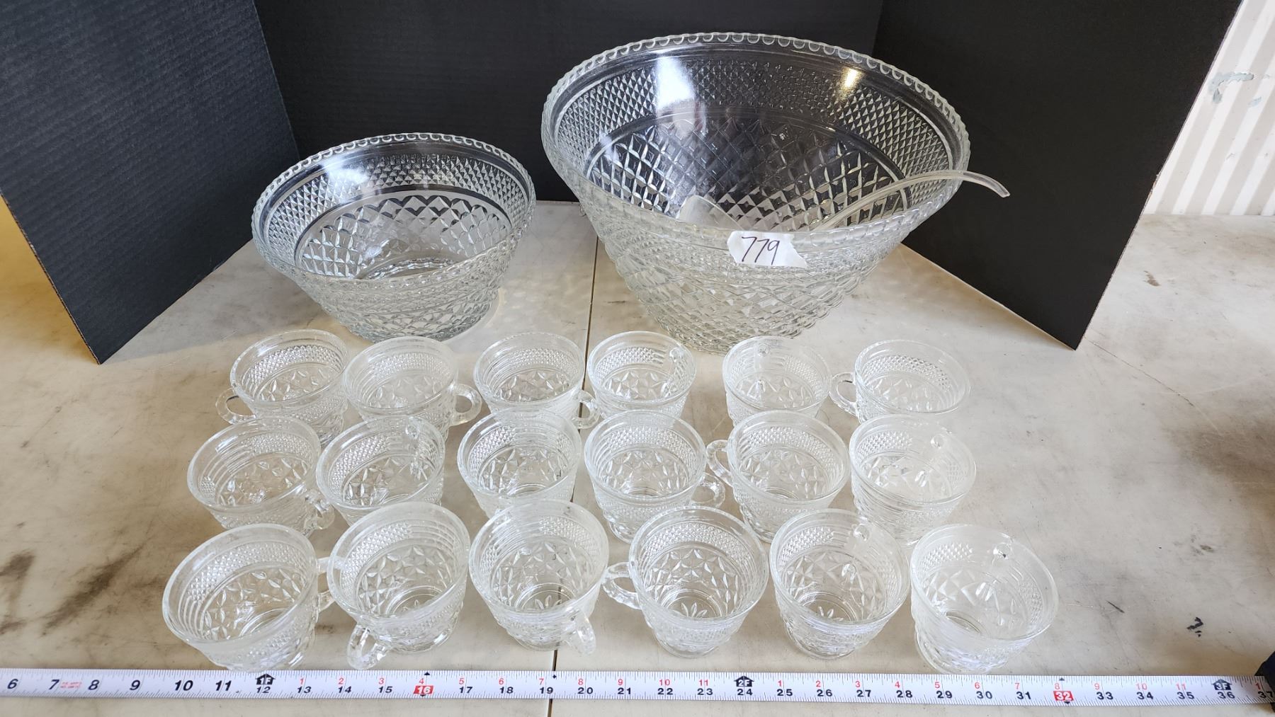 Pair of large heavy glass punch bowls, and glass cups - 14" dia & 10" dia bowls