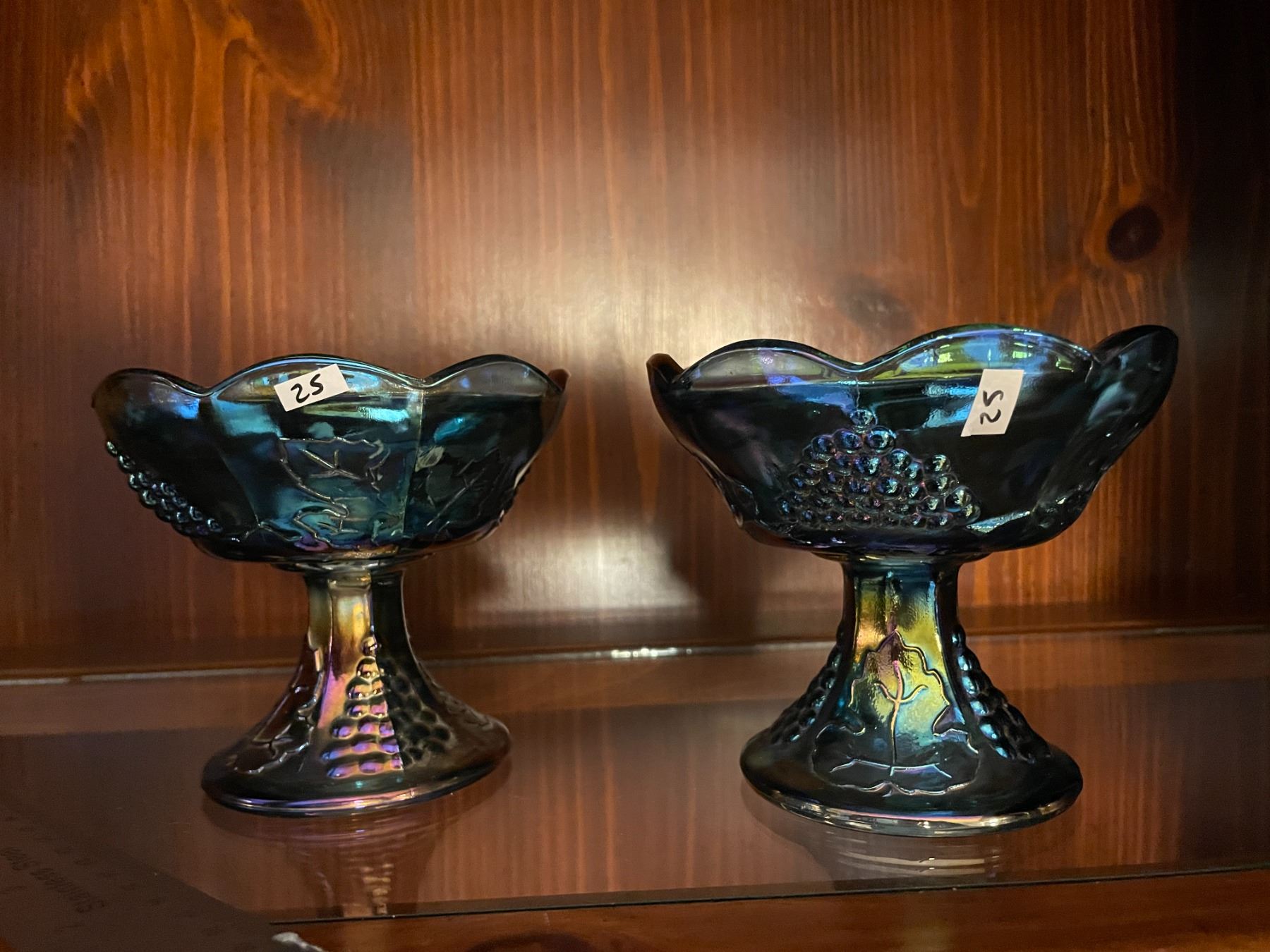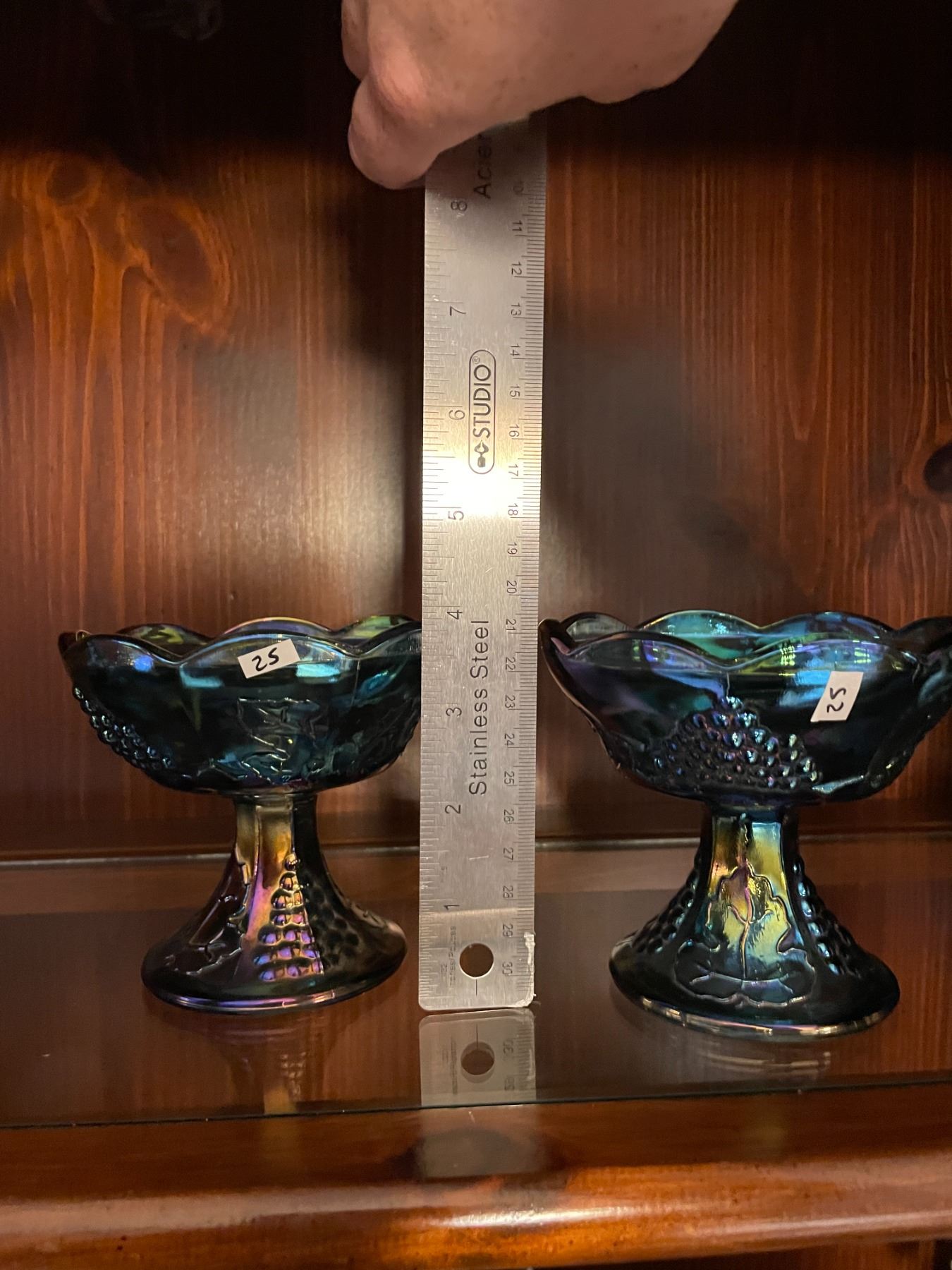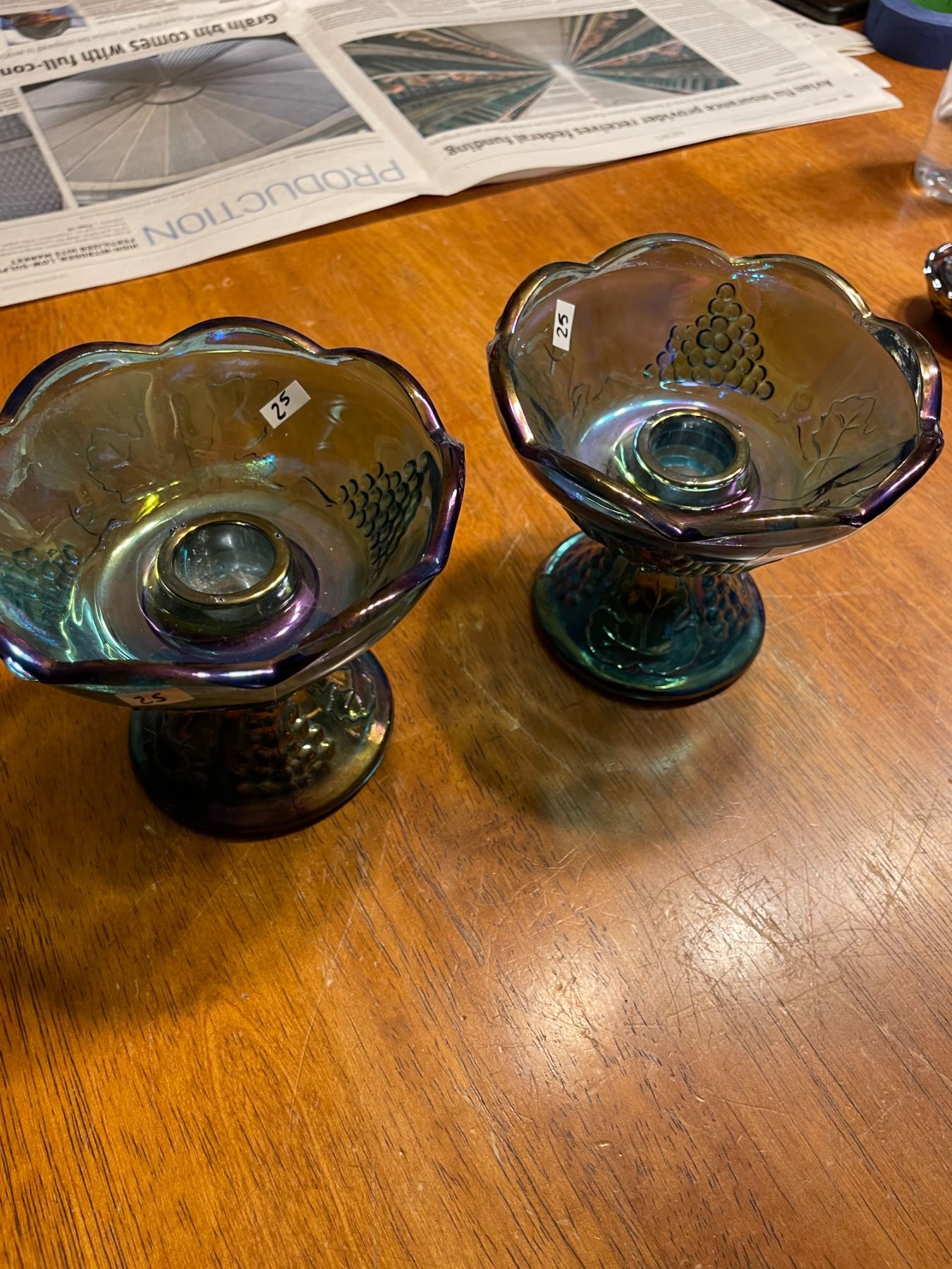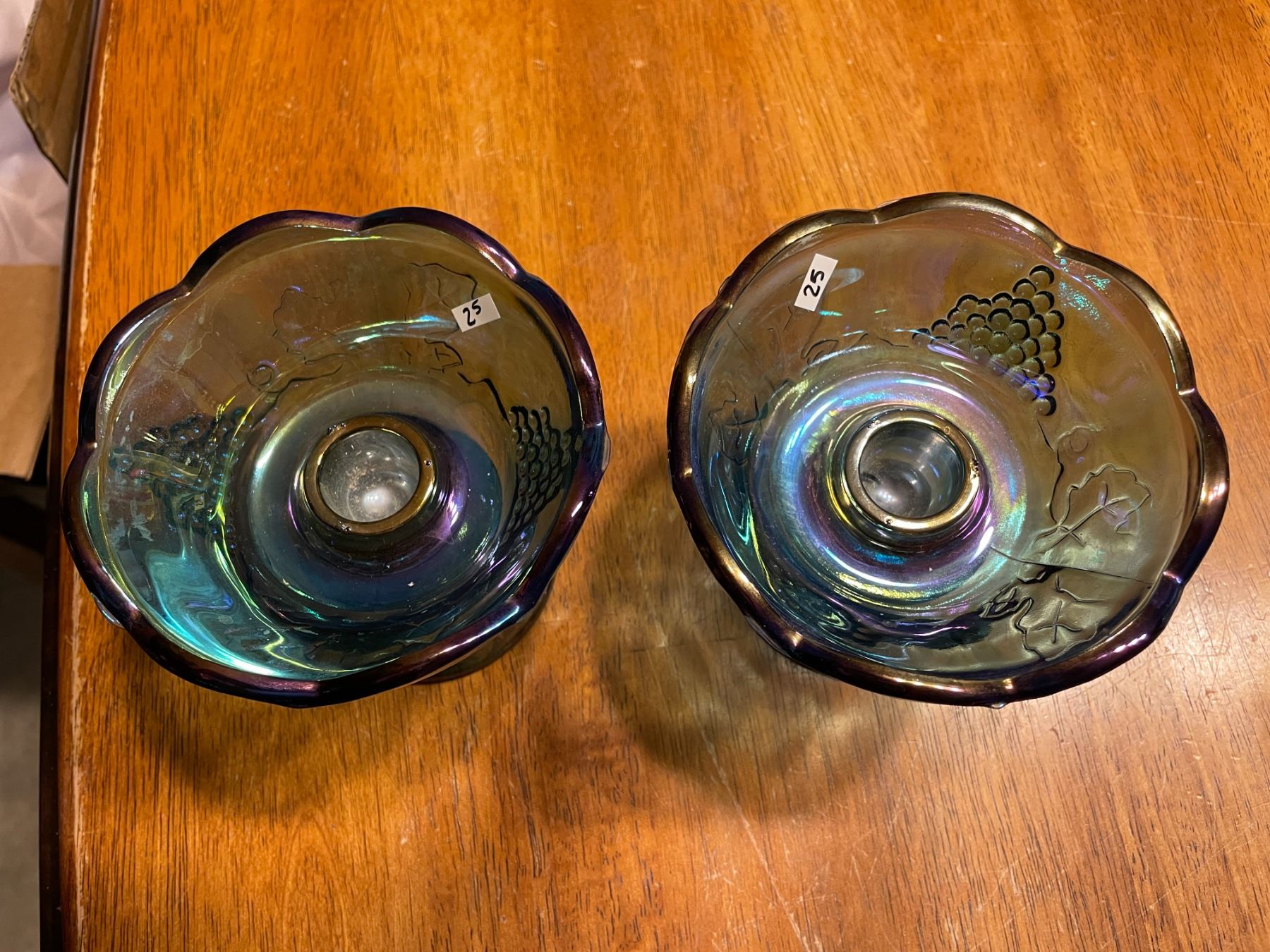 Pair of vintage, blue, carnival glass, harvest grape pattern, candle holders