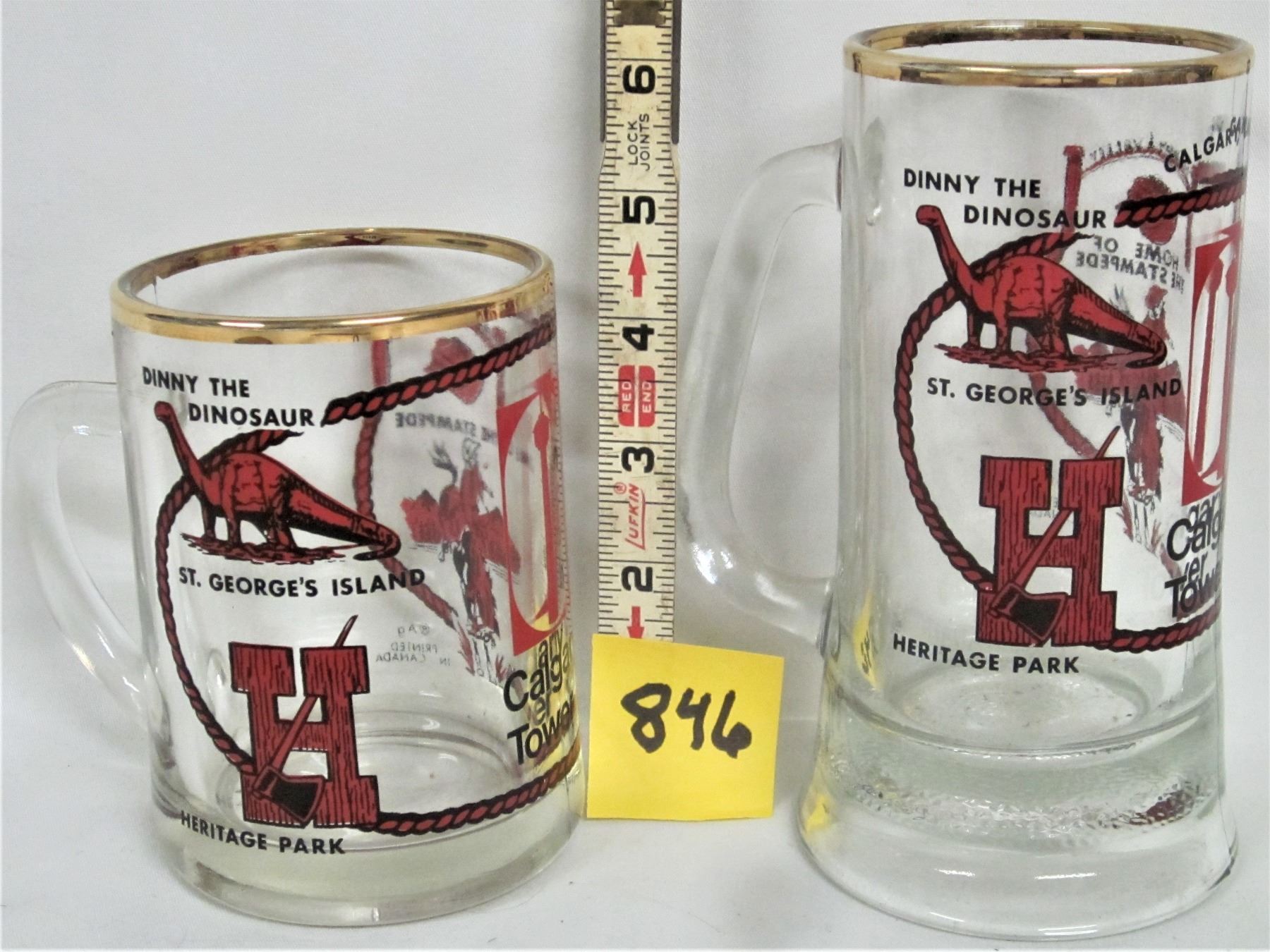 Pair of vintage glass Calgary, AB souvenier clear glass mugs / attractions lithos