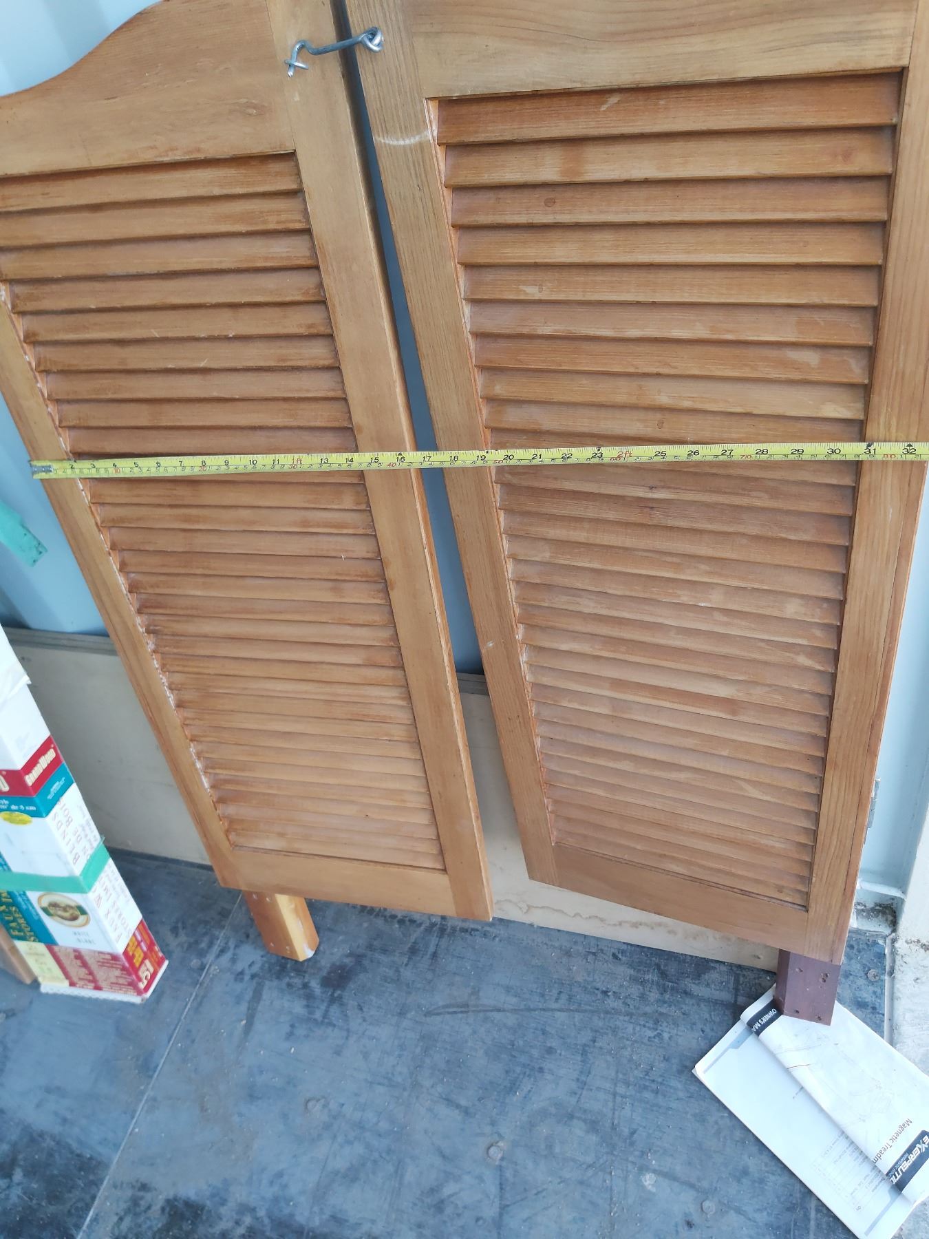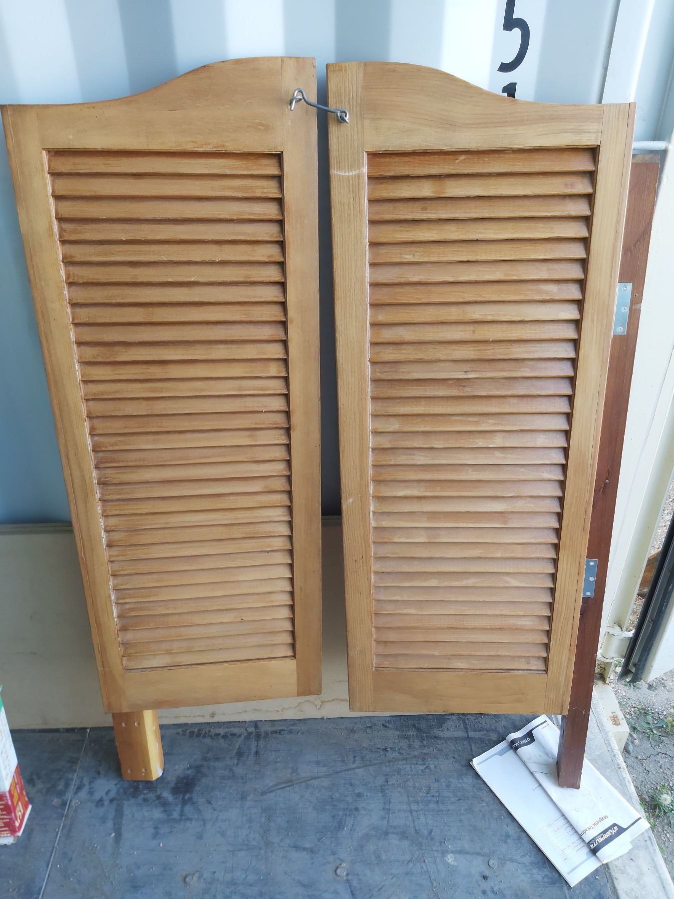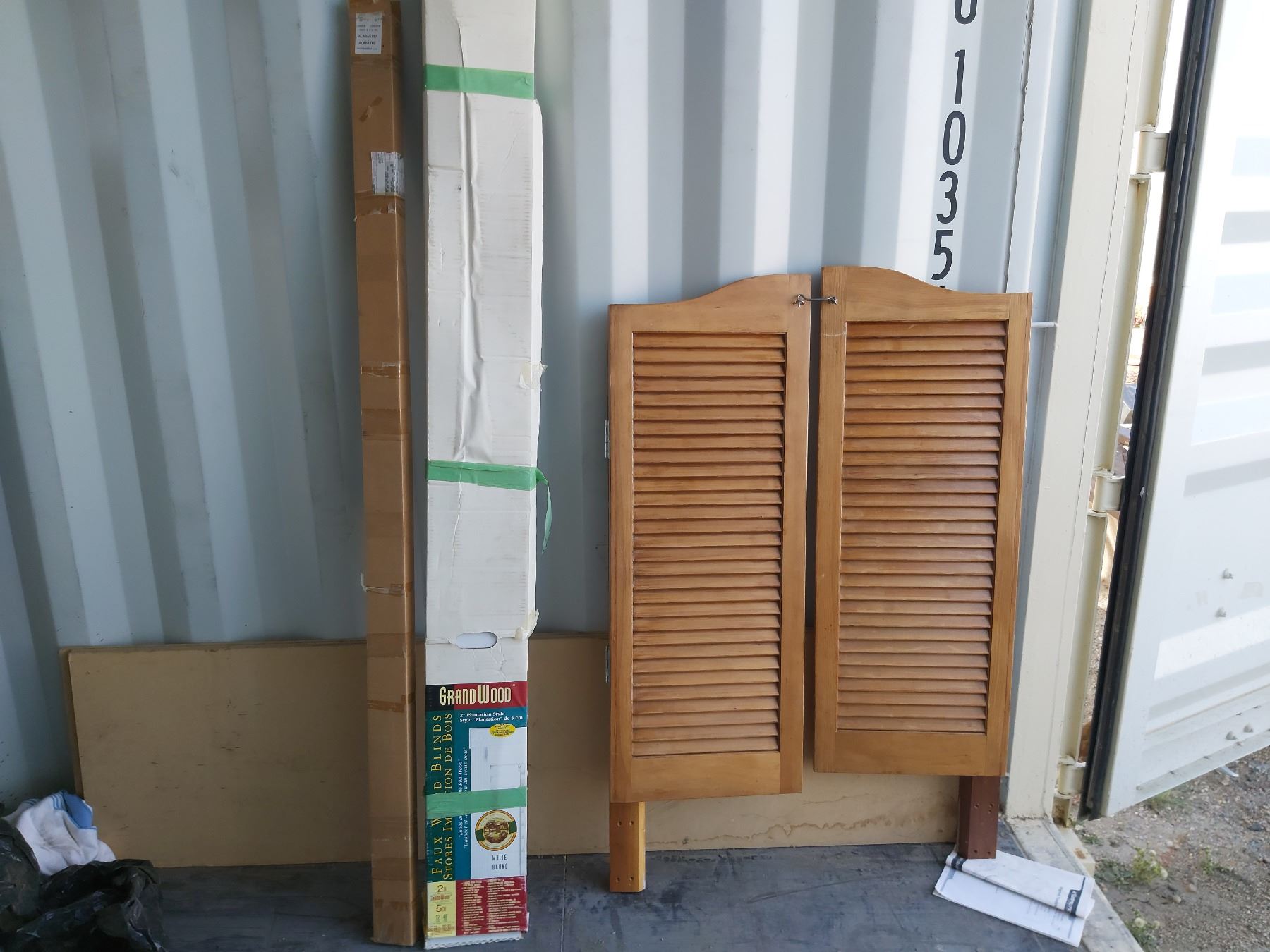 Pair of wooden swinging cafe doors and GrandWood Faux Wood Blinds