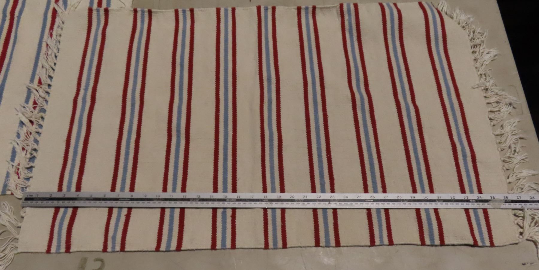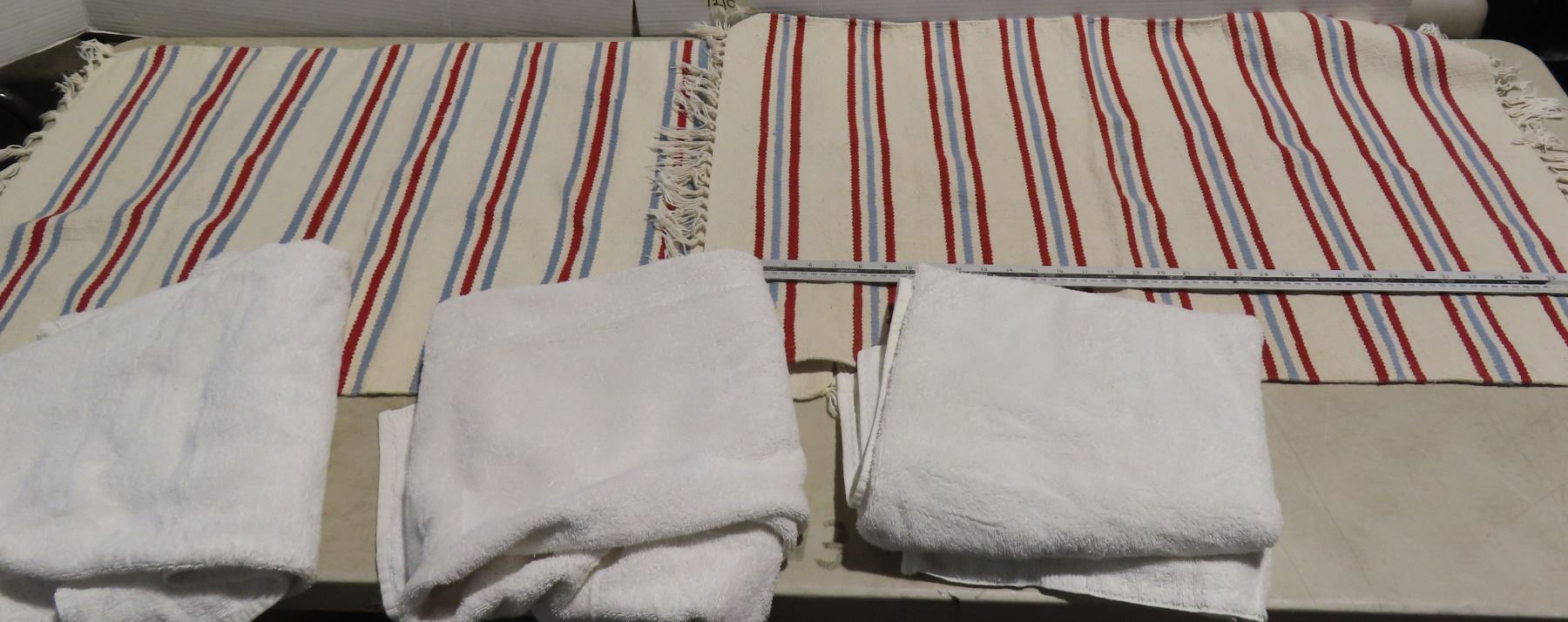Pair of woven small rugs and 3 white towels