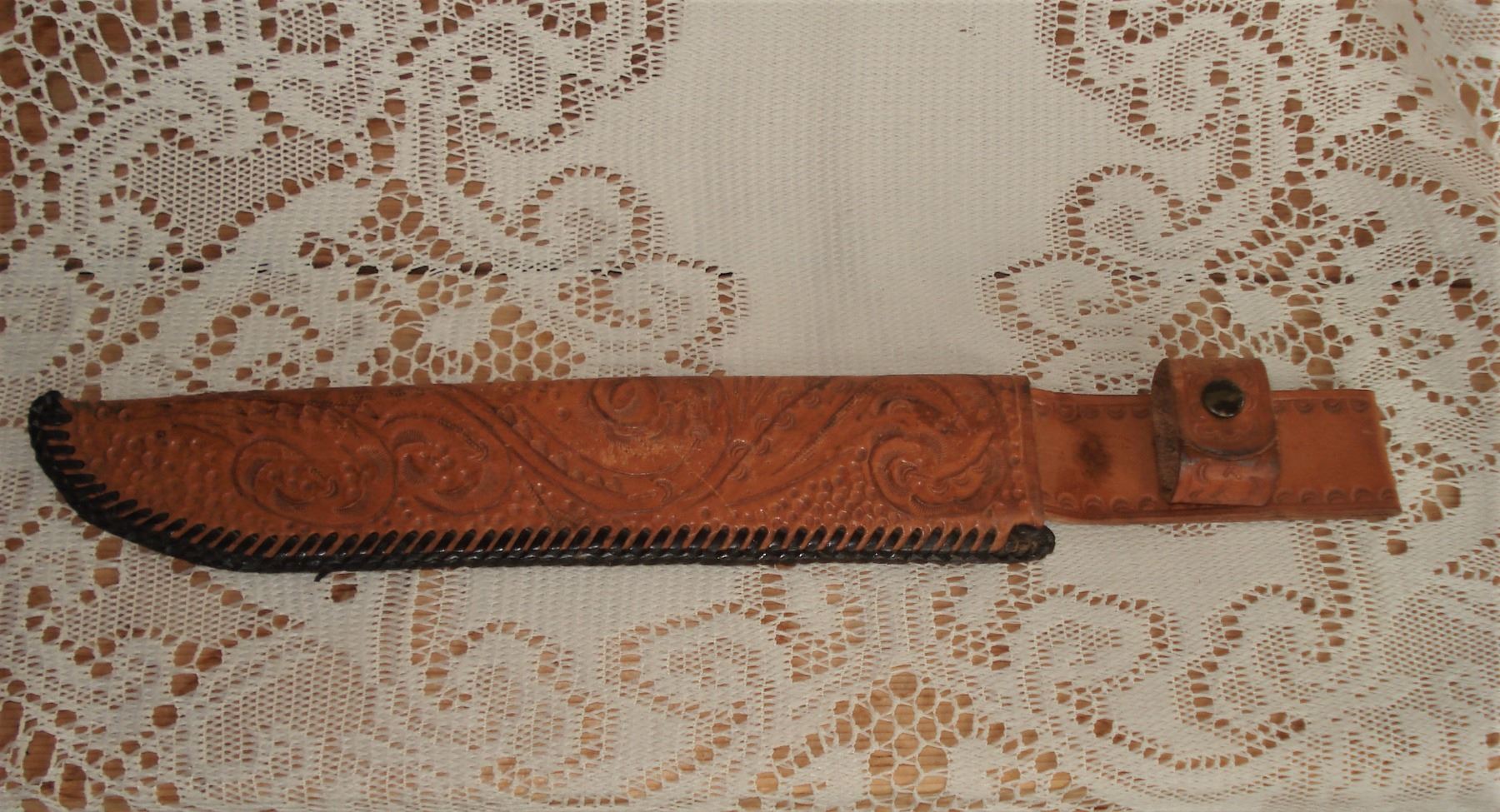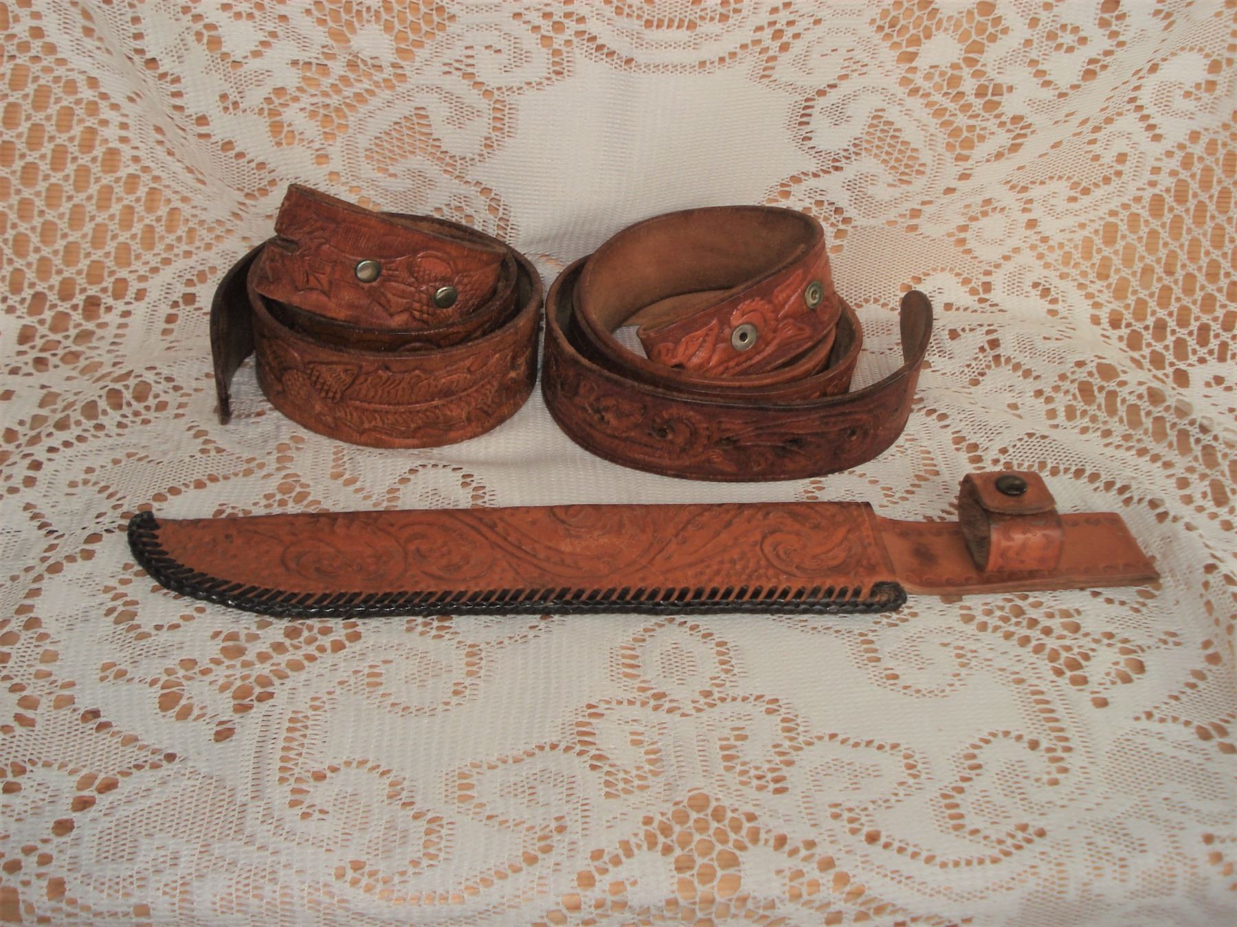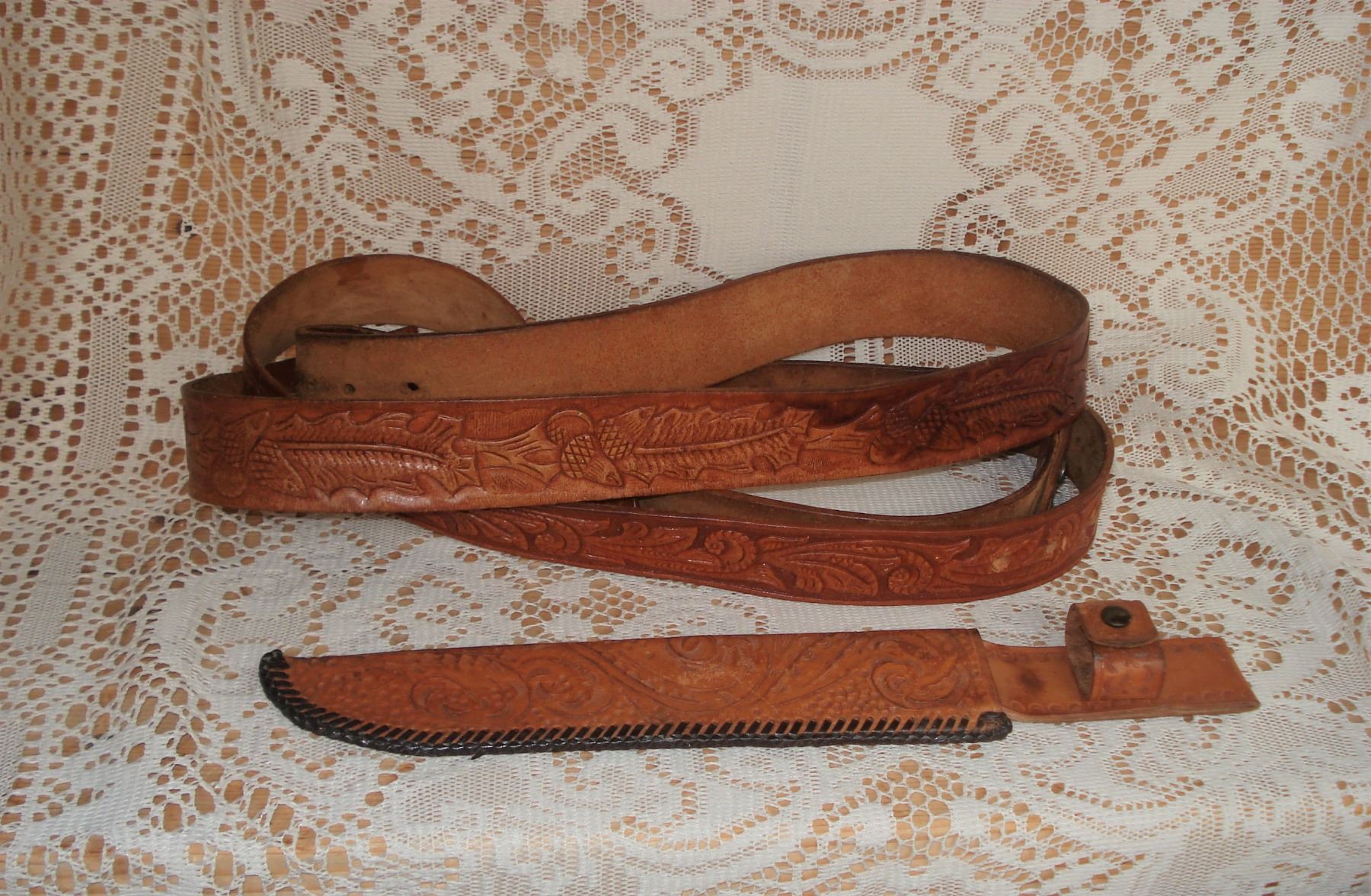 Pair tooled leather belts and knife case